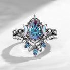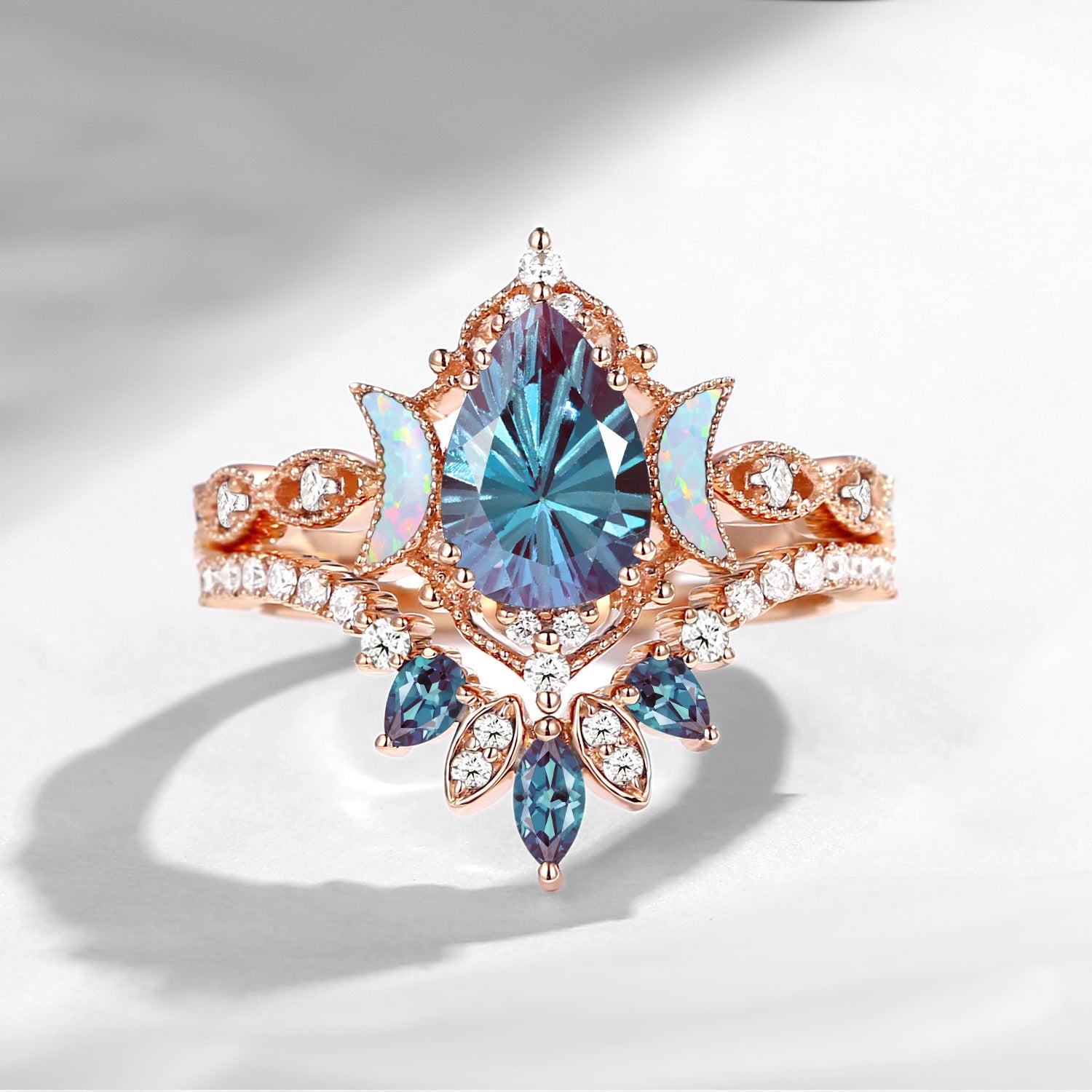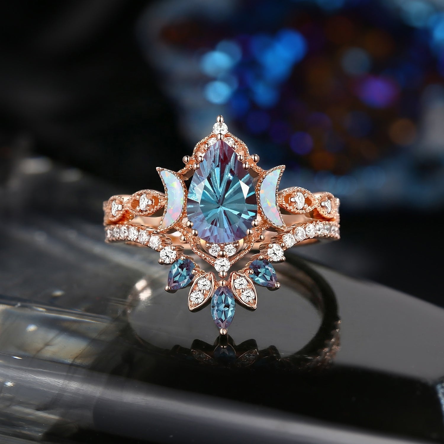 Crescent Moon | Firework Cut Pear Shaped Lab Alexandrite 'Ultra Galaxy' Engagement Ring Set 2pcs