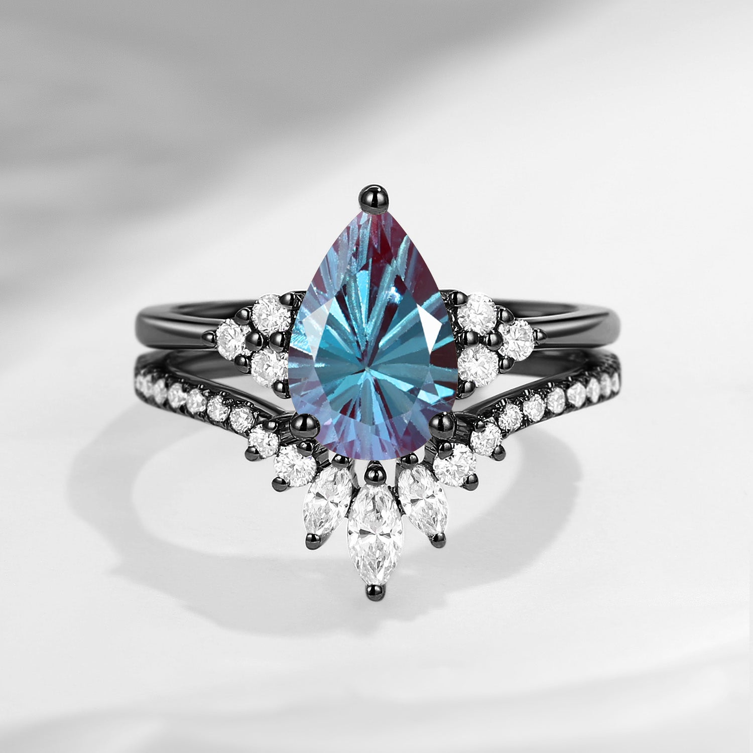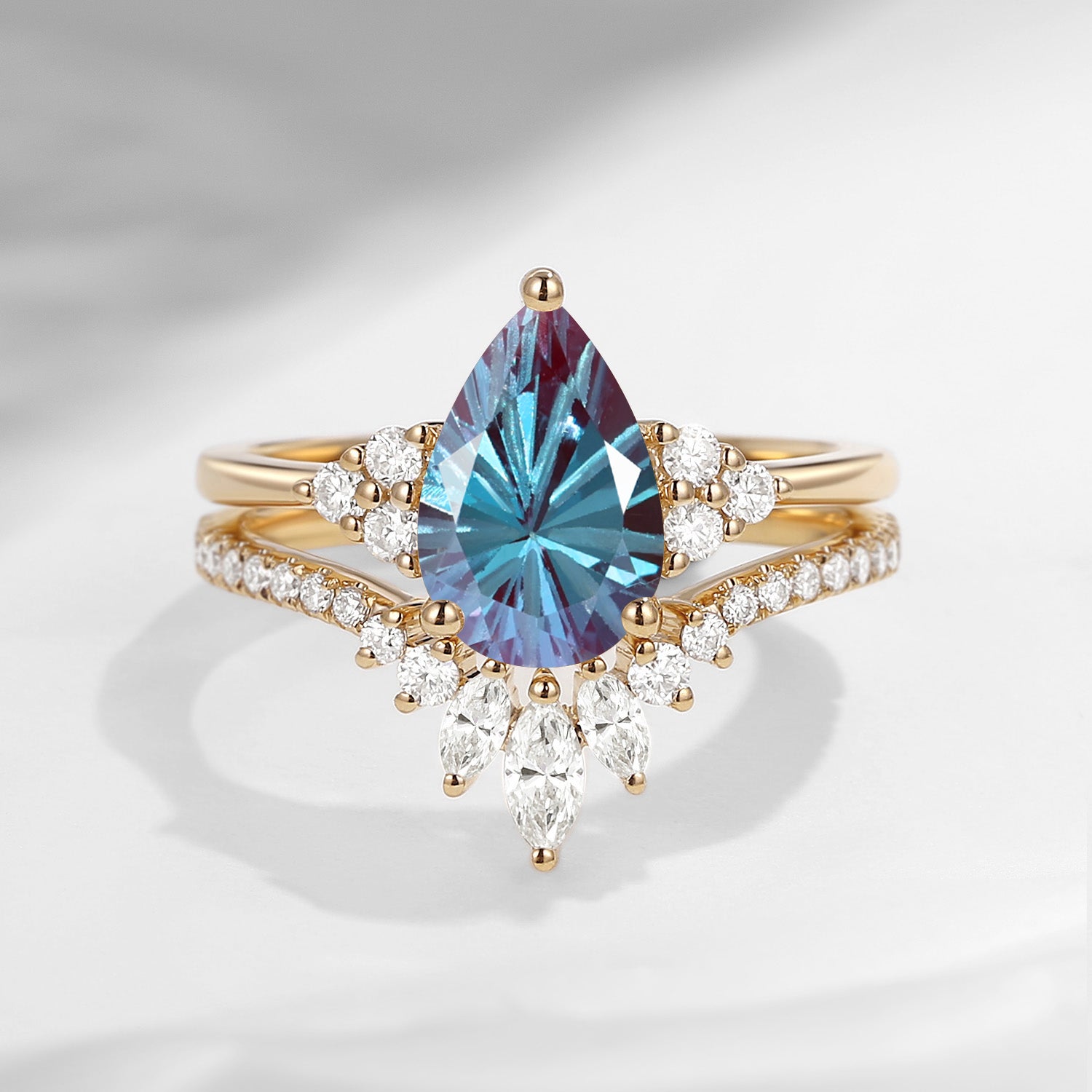 Firework Cut Pear Shaped Classic Cluster Lab Alexandrite Engagement Ring Set 2pcs - Vivian
