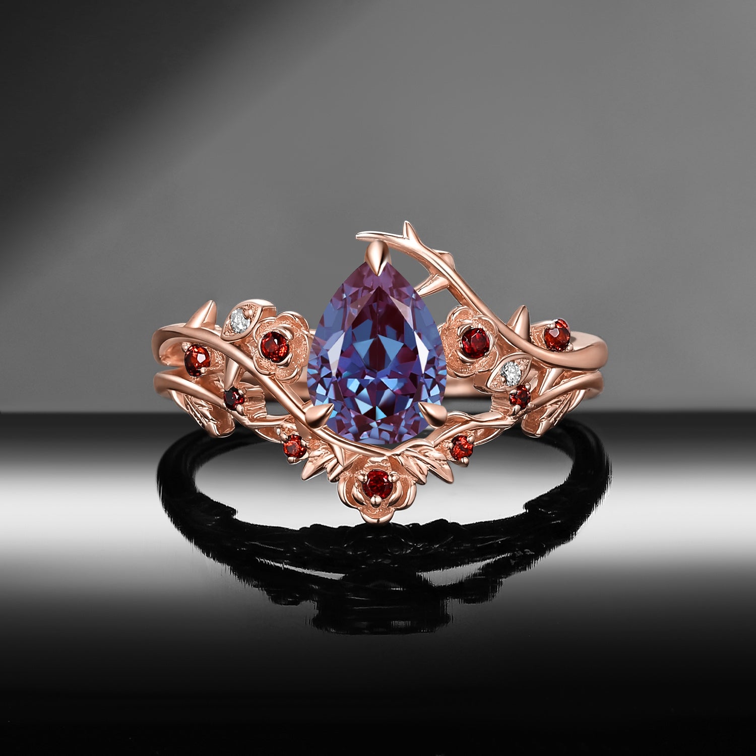 Gothic Nature Inspired Pear Cut Lab Alexandrite Engagement Ring Set 2pcs - 'Thorns & Roses'