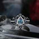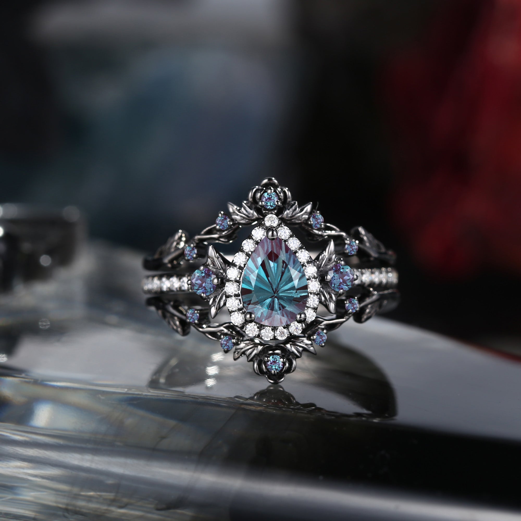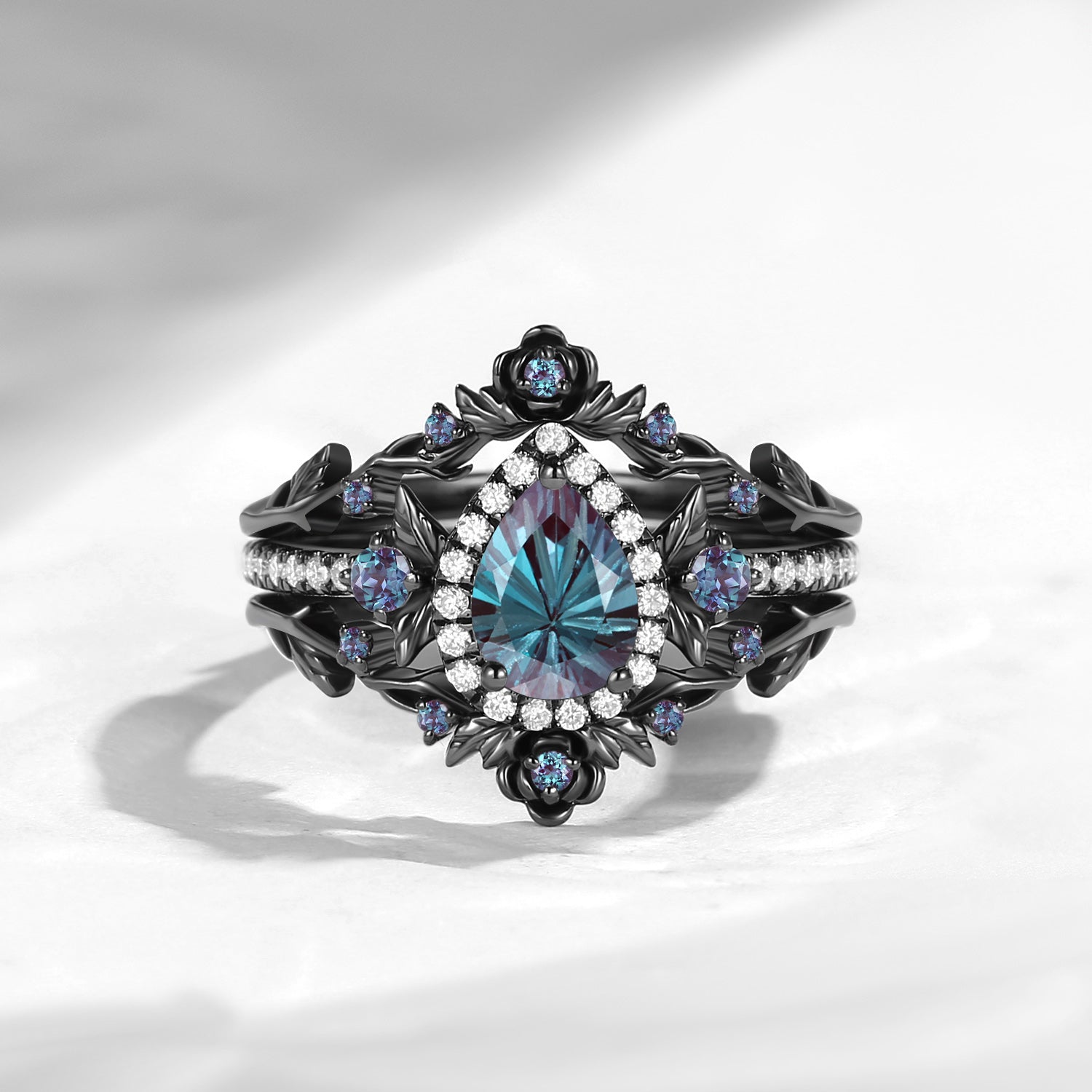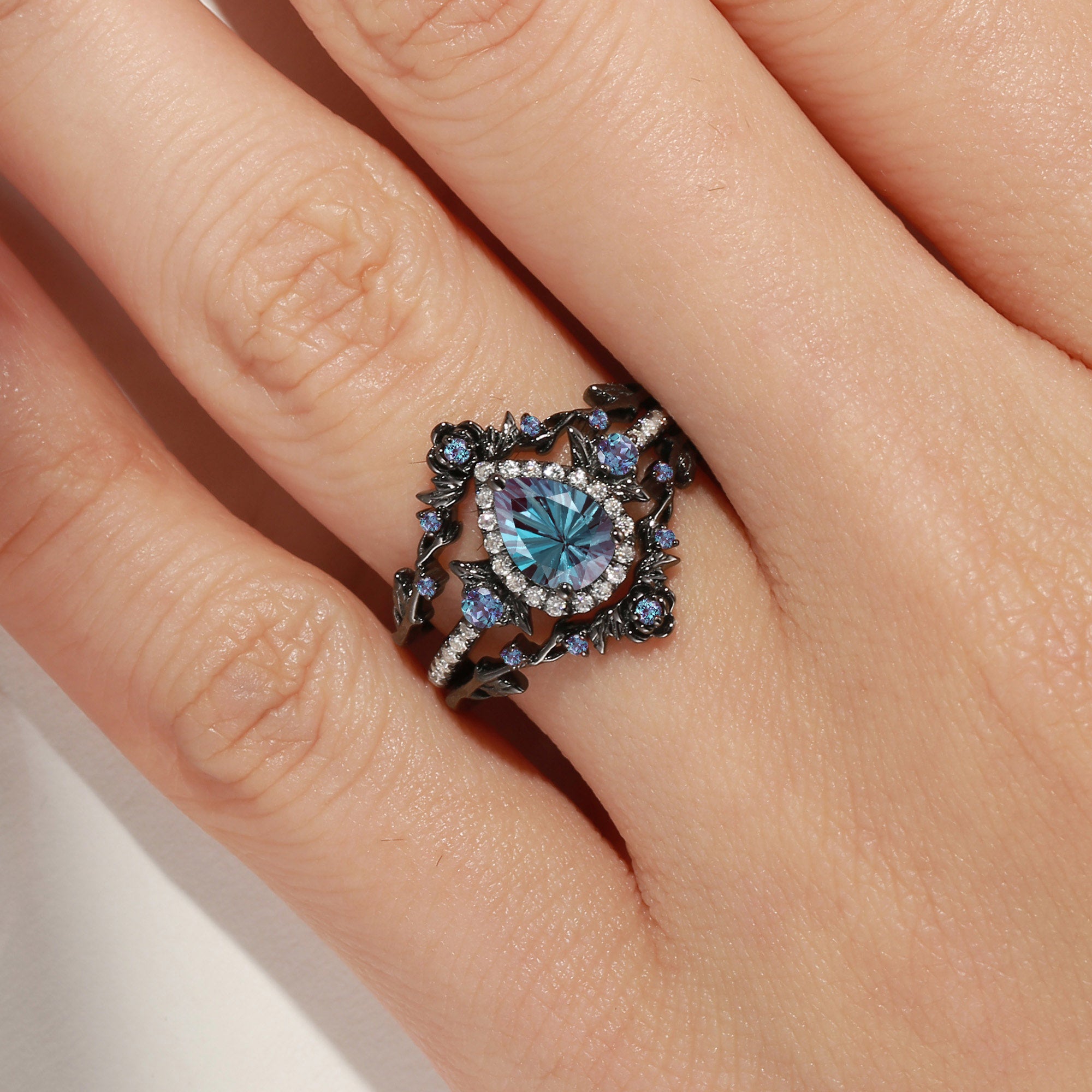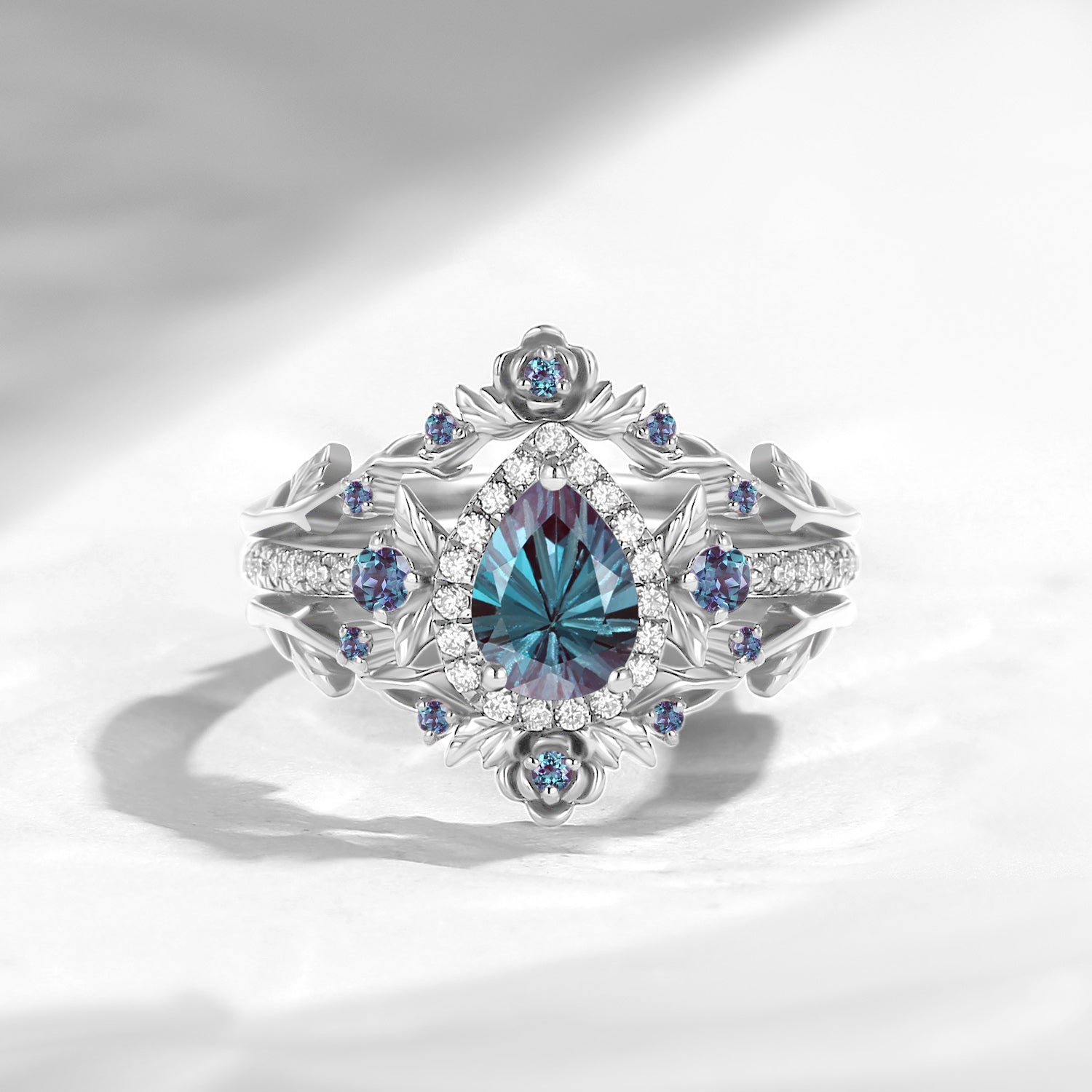 Nature Inspired Firwork Cut Pear Lab Alexandrite 'Thorns & Roses' Halo Engagement Ring Set 3pcs