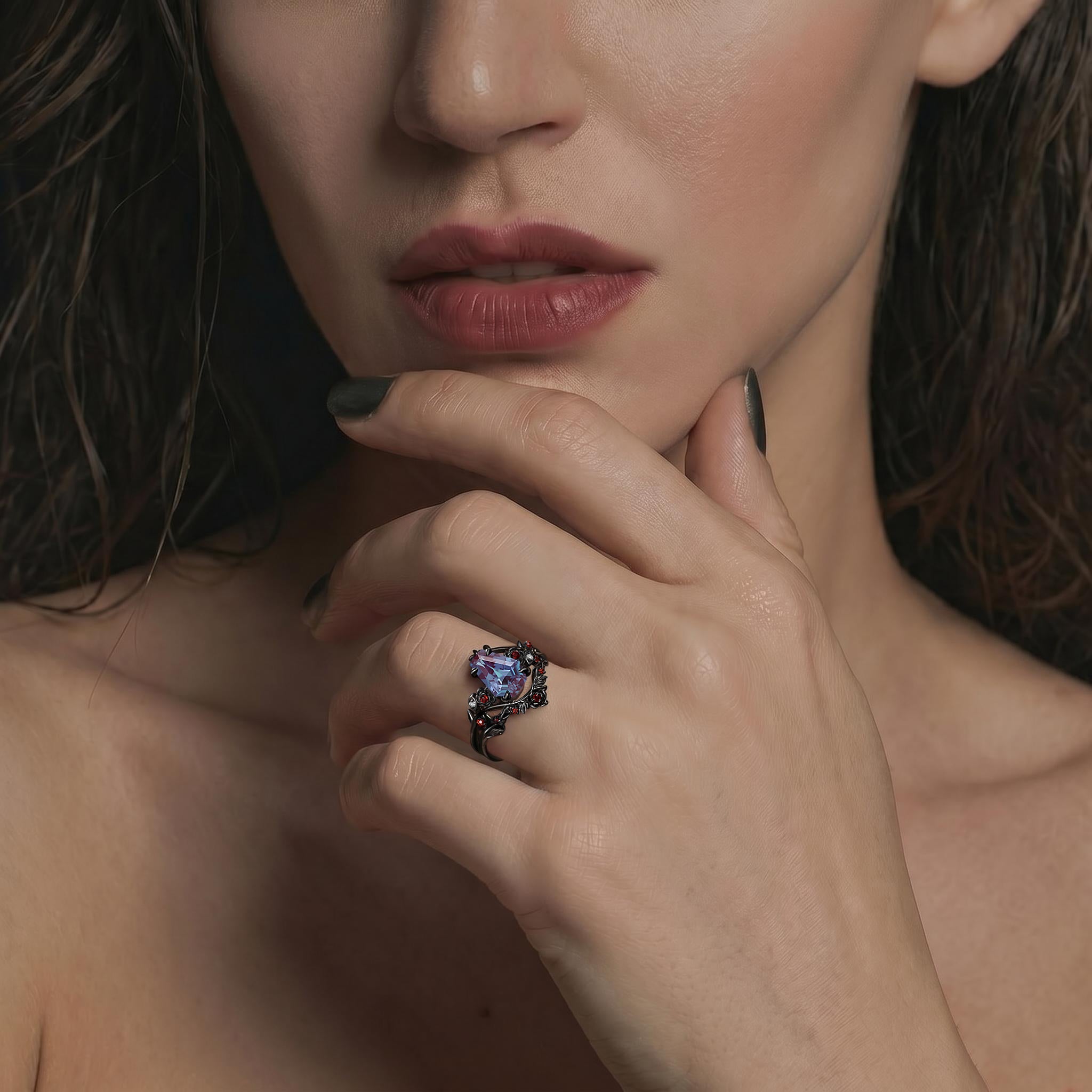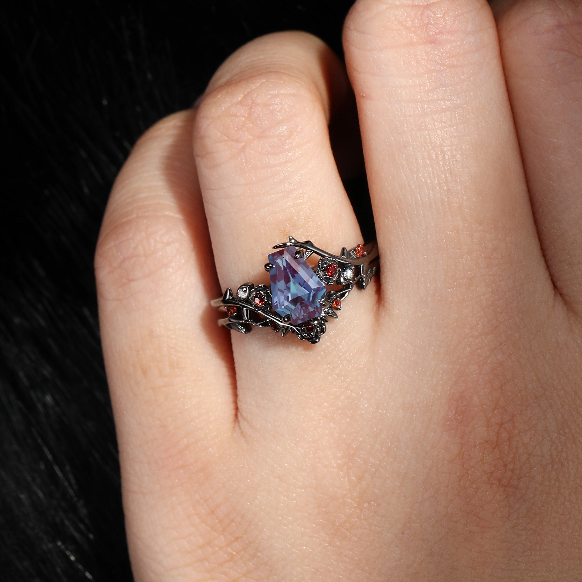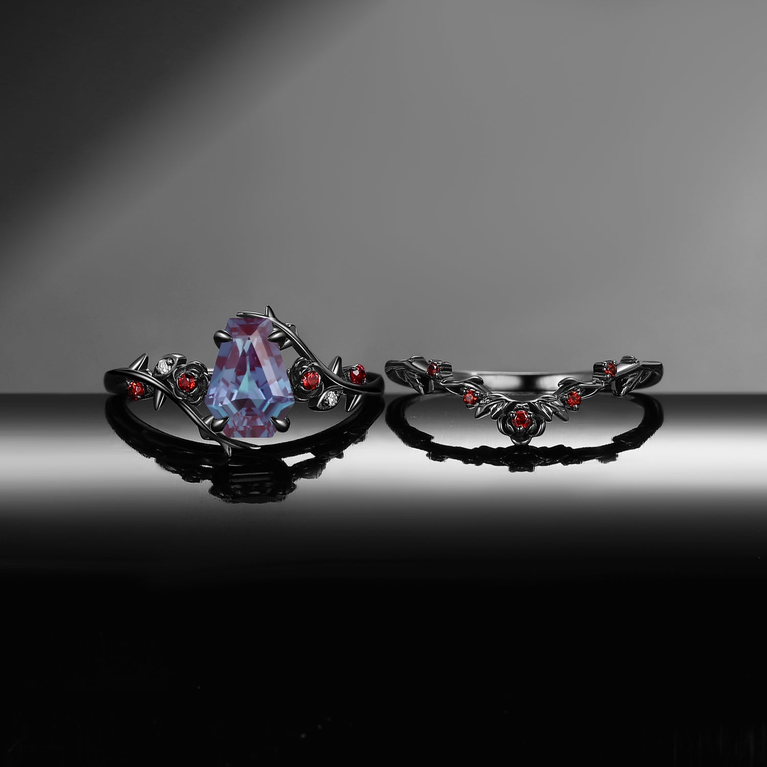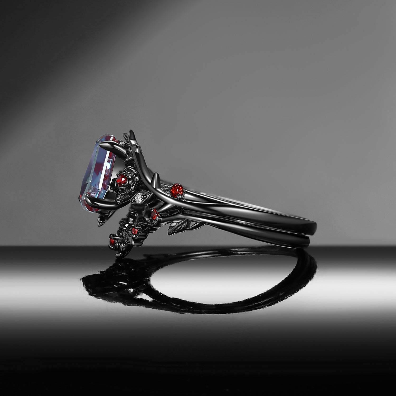 Nature Inspired Gothic Coffin Cut Lab Alexandrite 'Thorns & Roses' Bridal Set 2pcs