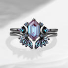 Pure Moon | Art Deco Long Hexagon Lab Alexandrite Cluster Engagement Ring Set 2pcs