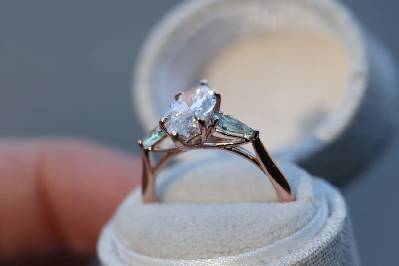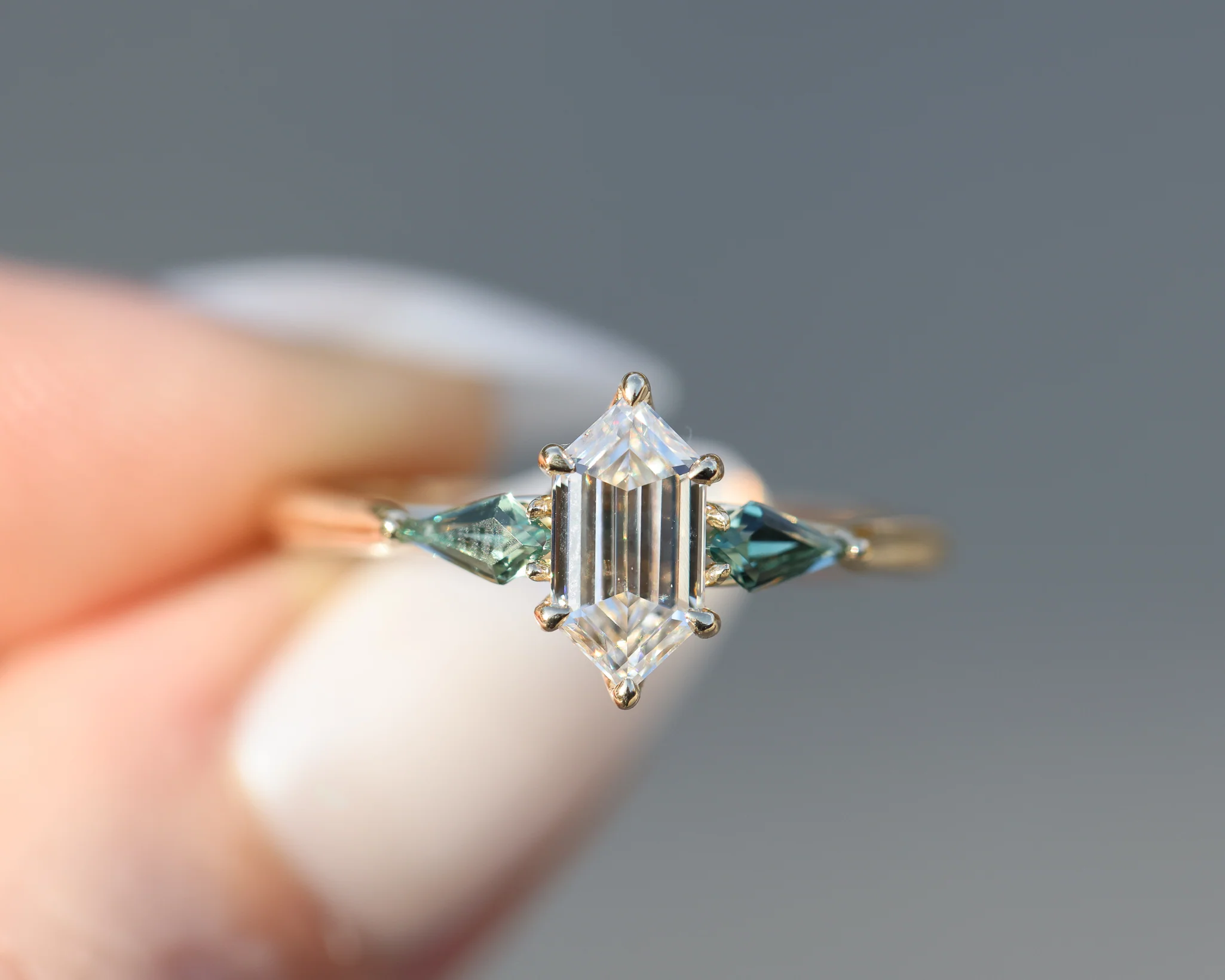 Center stone: Elongated hexagonal moissanite