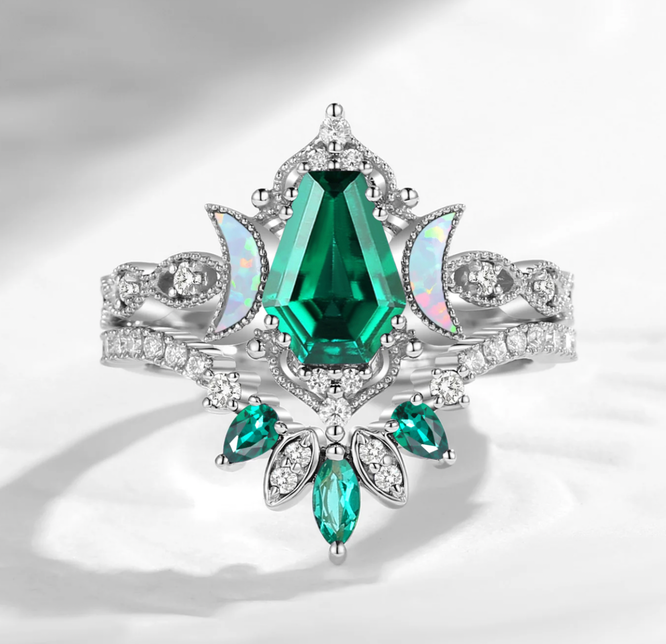 Center Stone: 6*8mm coffin lab emeraldSide Stone: lab emerald