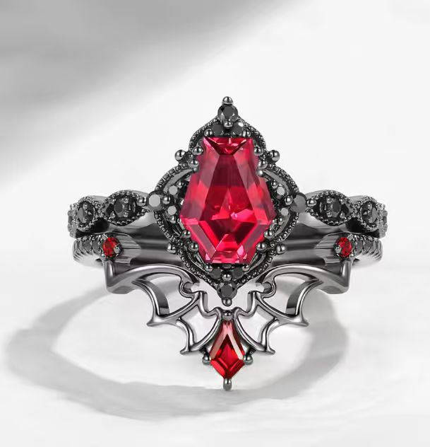 18k black gold - $4099 6*8 lab ruby center stone, natural kite cut ruby & natural black diamonds.