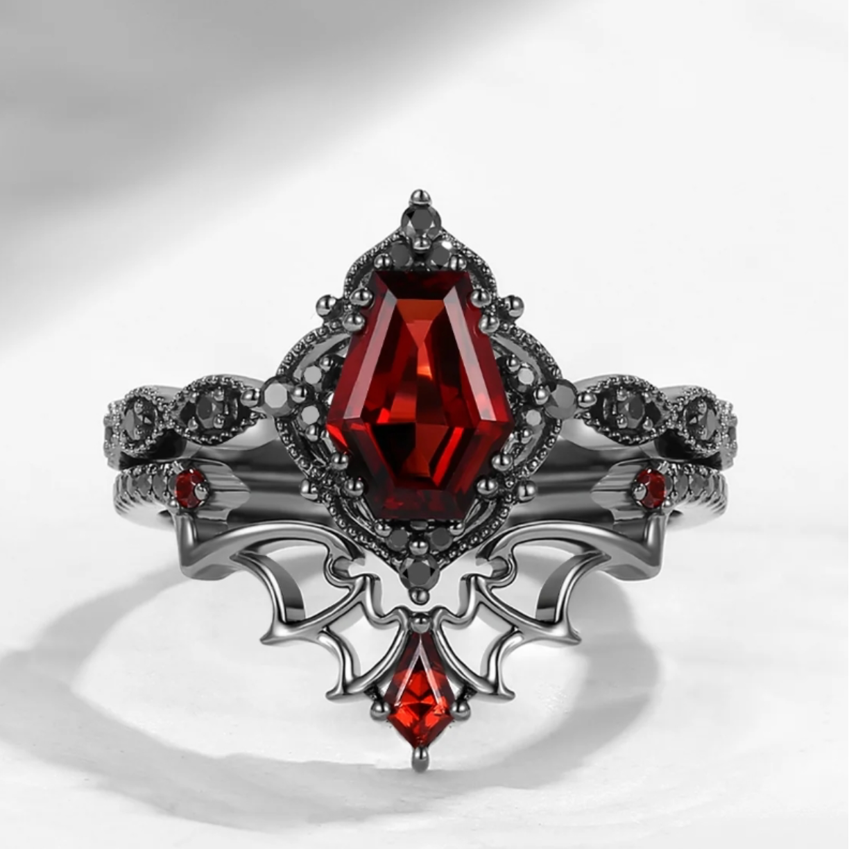 Side stones: Black Moissanite & Garnet