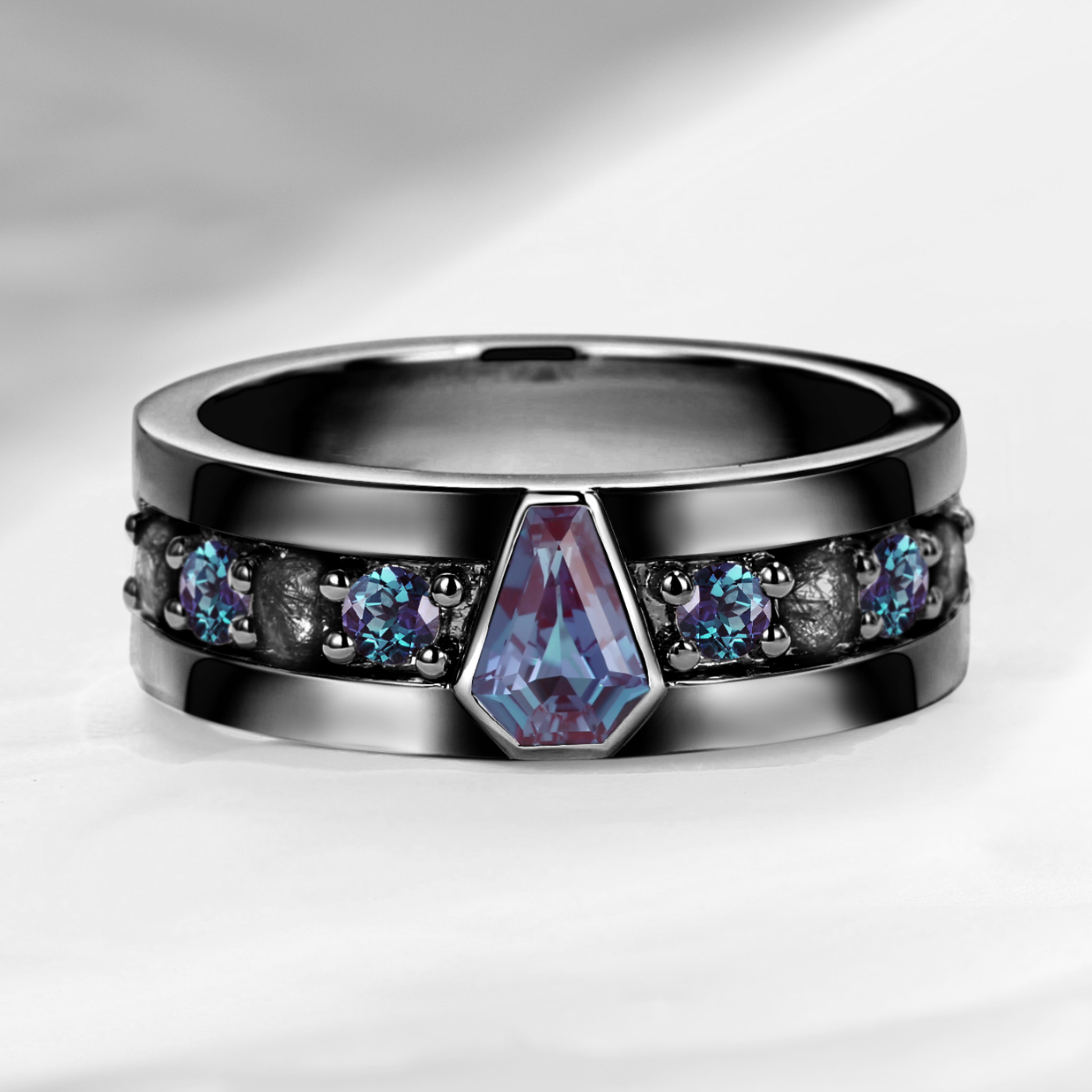 Ring for him: 18K Black Gold, 5*7mm Coffin Lab Alexandrite, Black Moissanite & Black Rutilated Quartz, 9US