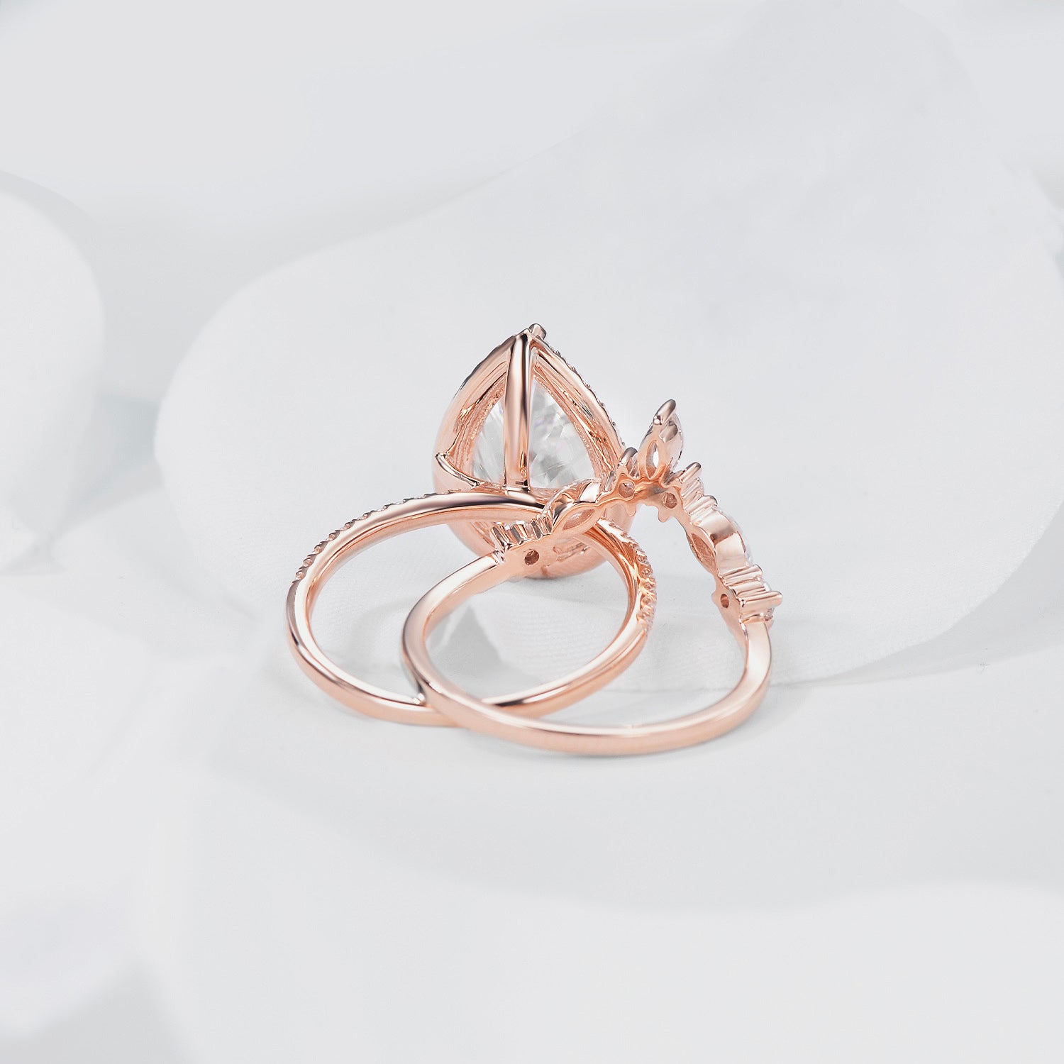 3ct Moissanite Bridal Set 2pcs Pear Shaped Rose Gold Engagement Ring Gradient Curved Chevron Wedding Band Women Stacking Halo Marquise Band
