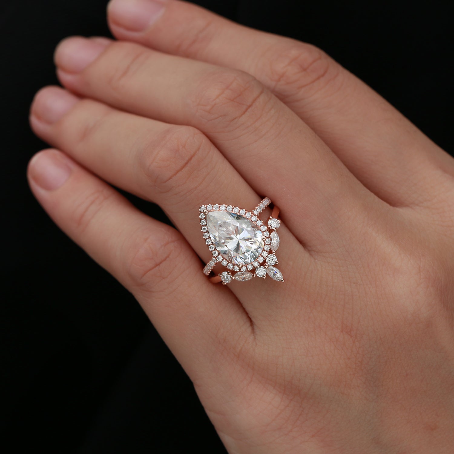 3.0ct Pear Cut Moissanite Halo Ring Set 2pcs
