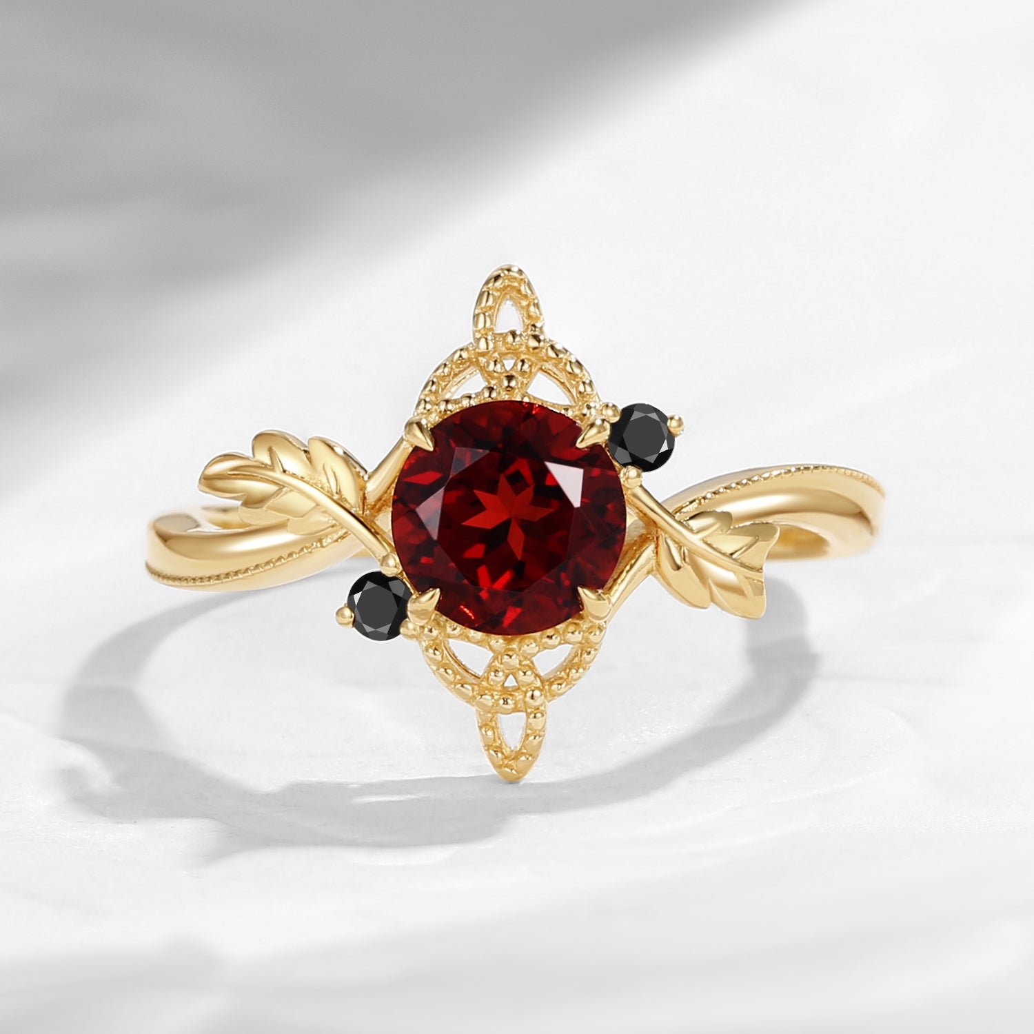 Celtic Calendar | 12.24-1.20 | Round Cut Garnet Nature Inspired Birch Leafy Celtic Ring