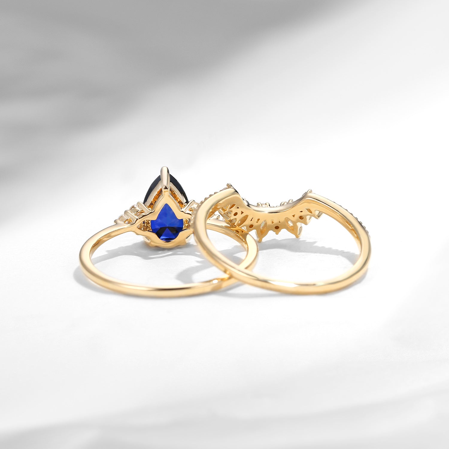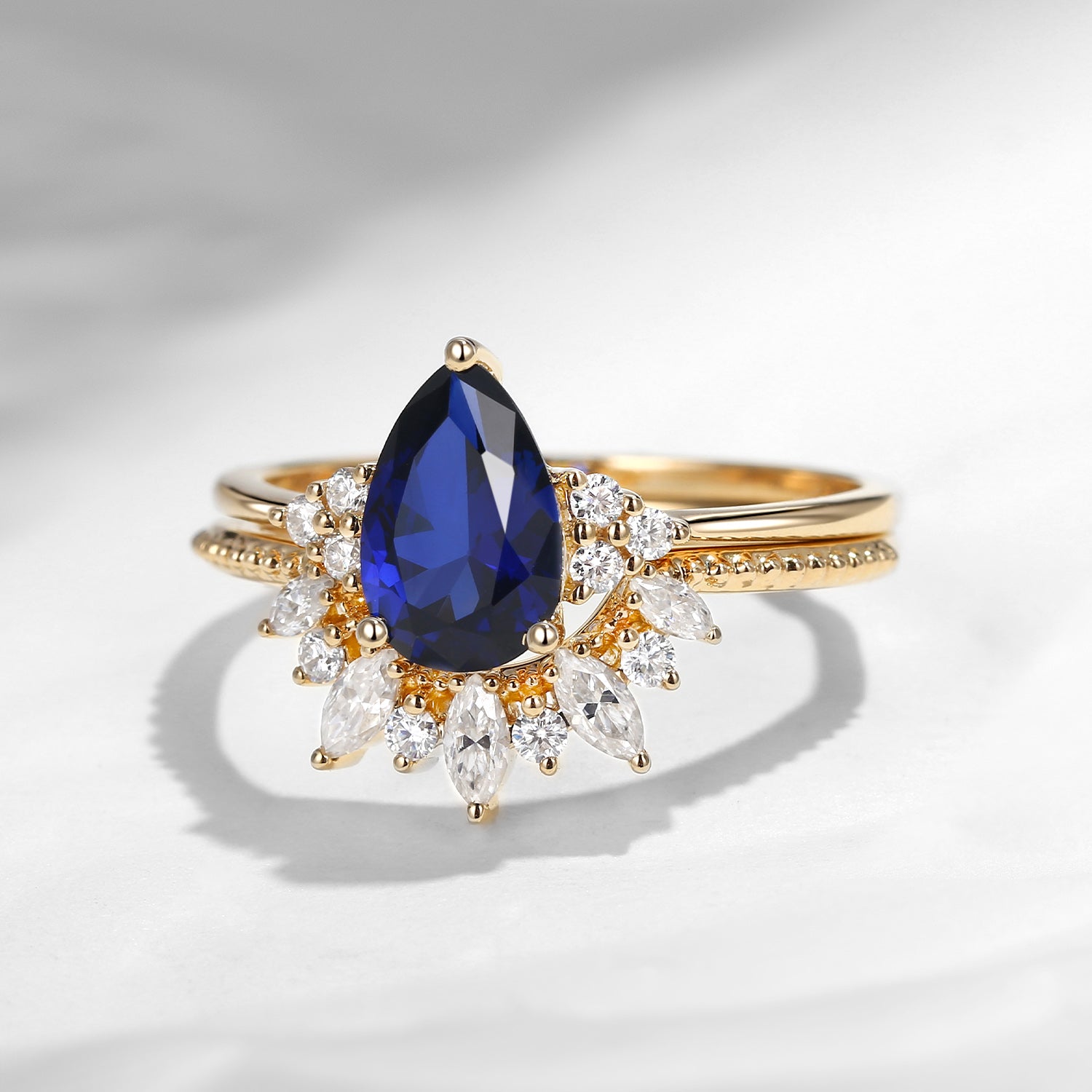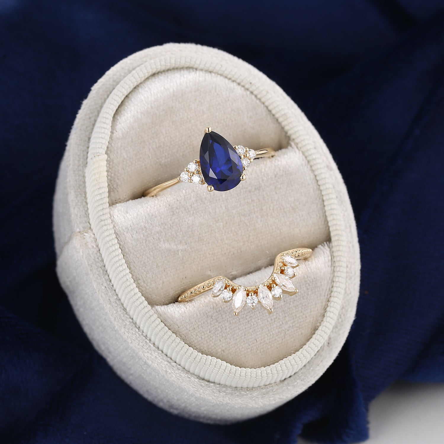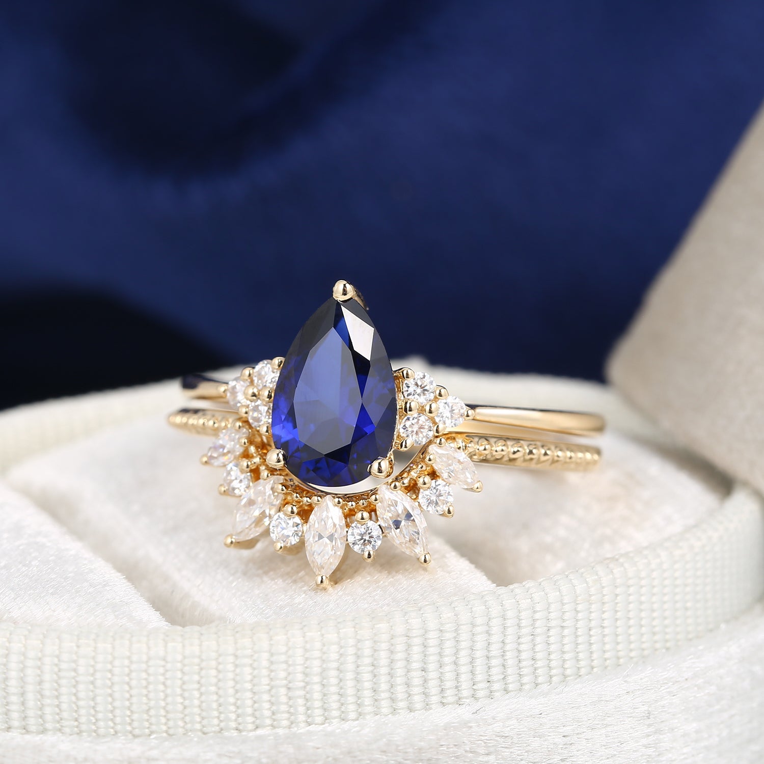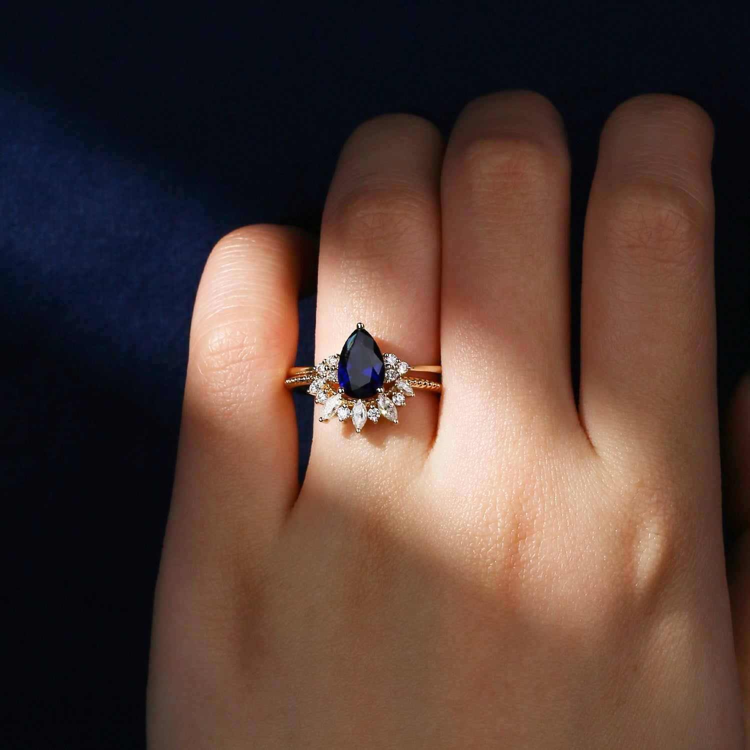 Pear Shaped Lab Sapphire Unique Pear Cut Lab Sapphire Engagement Halo Ring Set 2pcs
