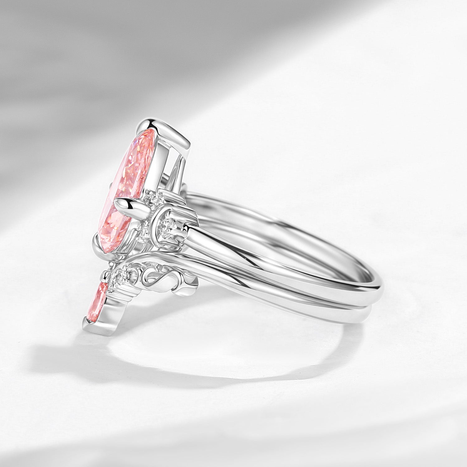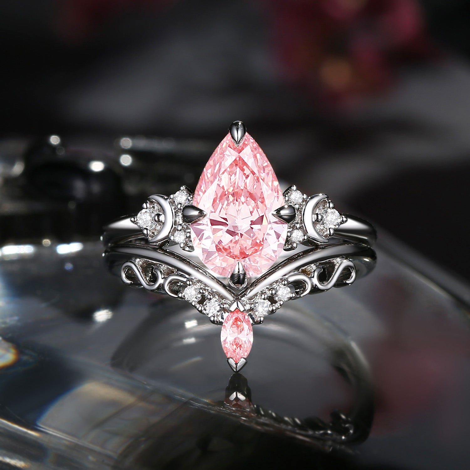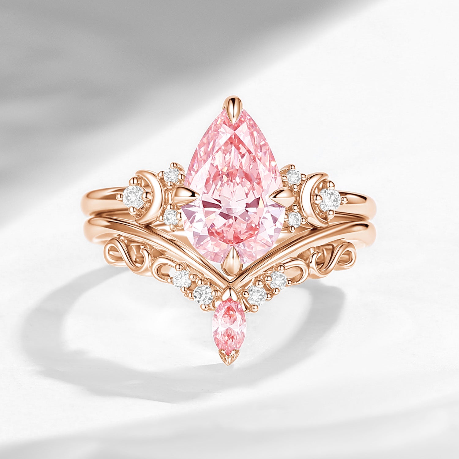 Crescent Moon | Pear Shaped Art Deco Pink Lab Diamond Engagement Ring Set 2pcs