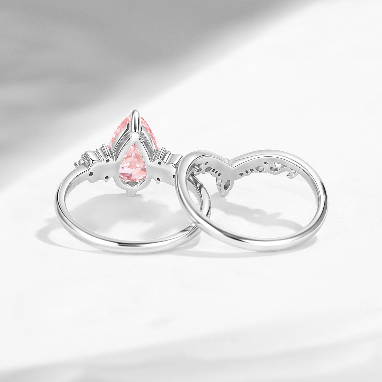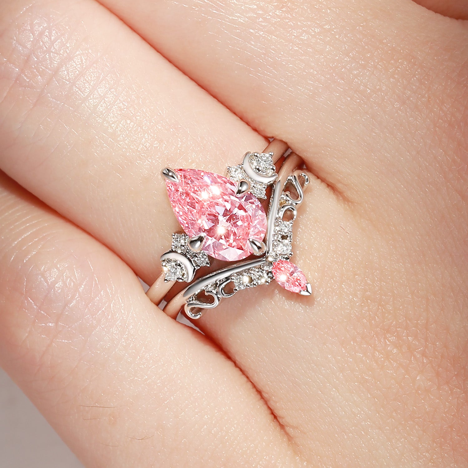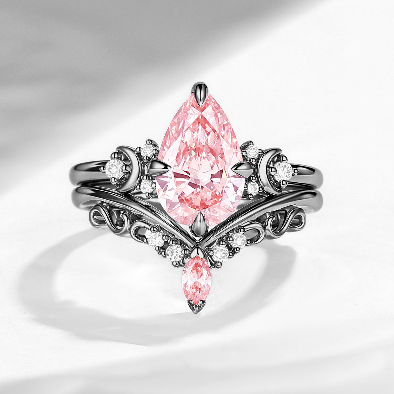 Crescent Moon | Pear Shaped Art Deco Pink Lab Diamond Engagement Ring Set 2pcs