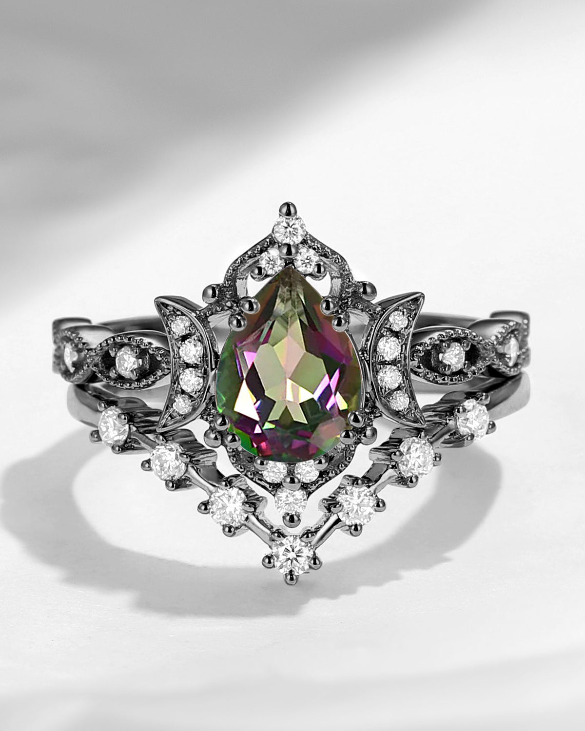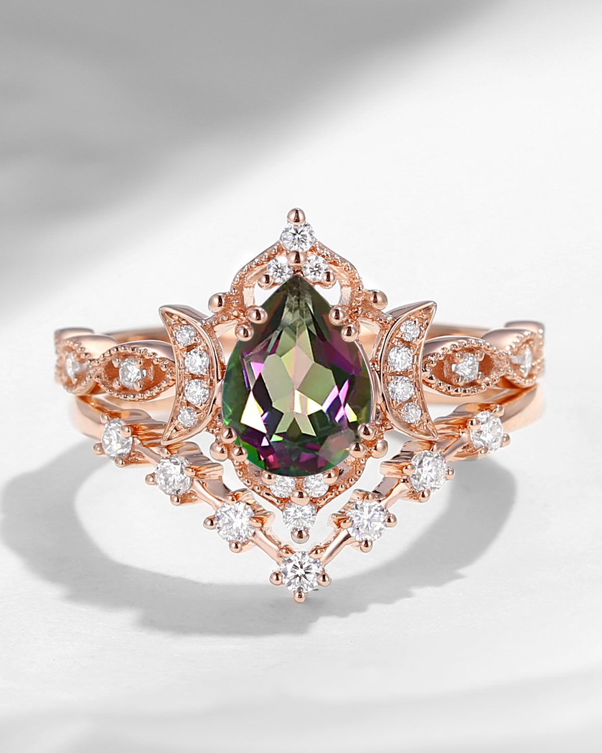 Vintage Pear Cut Mystic Topaz Engagement Ring Cage Ring Set 2pcs