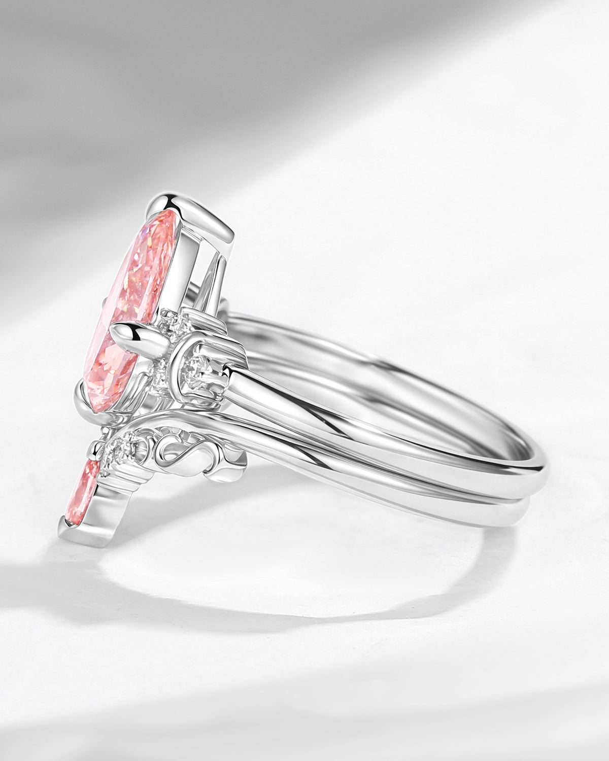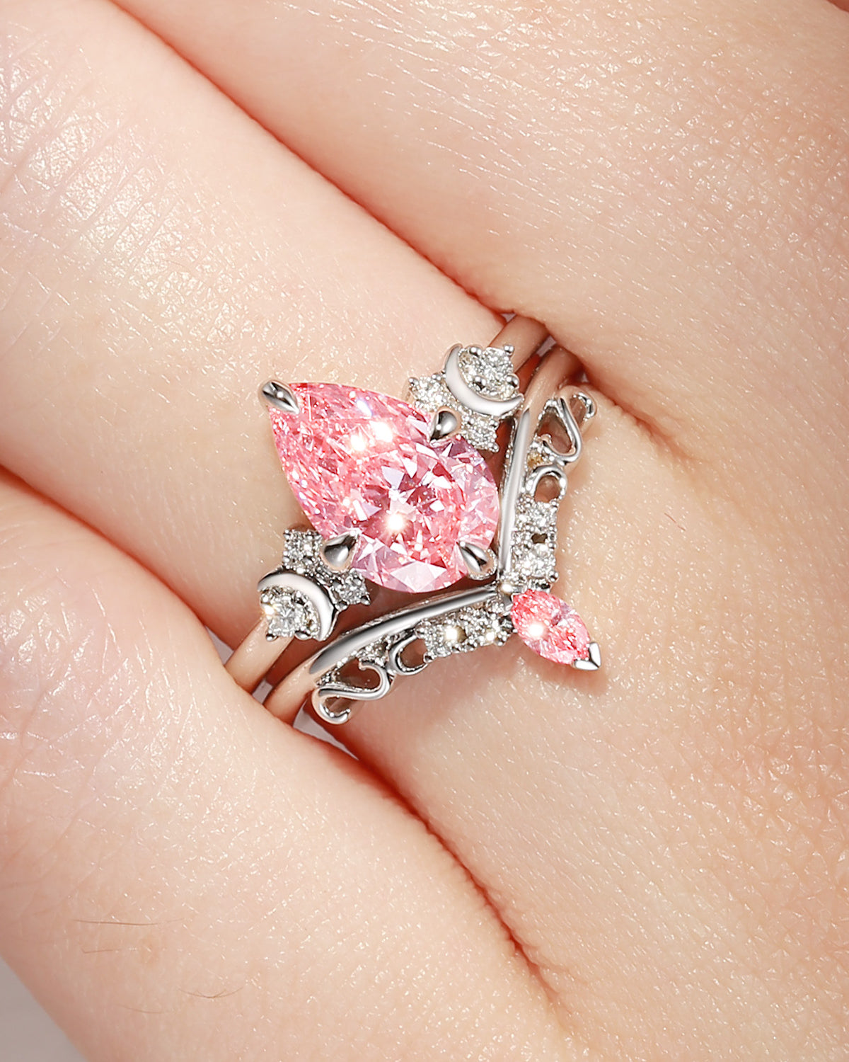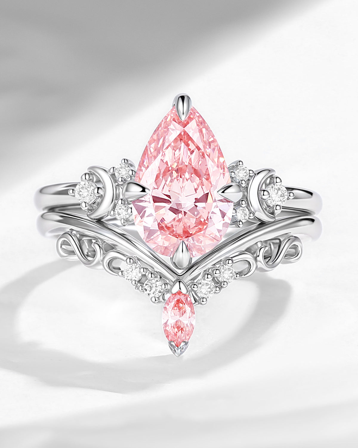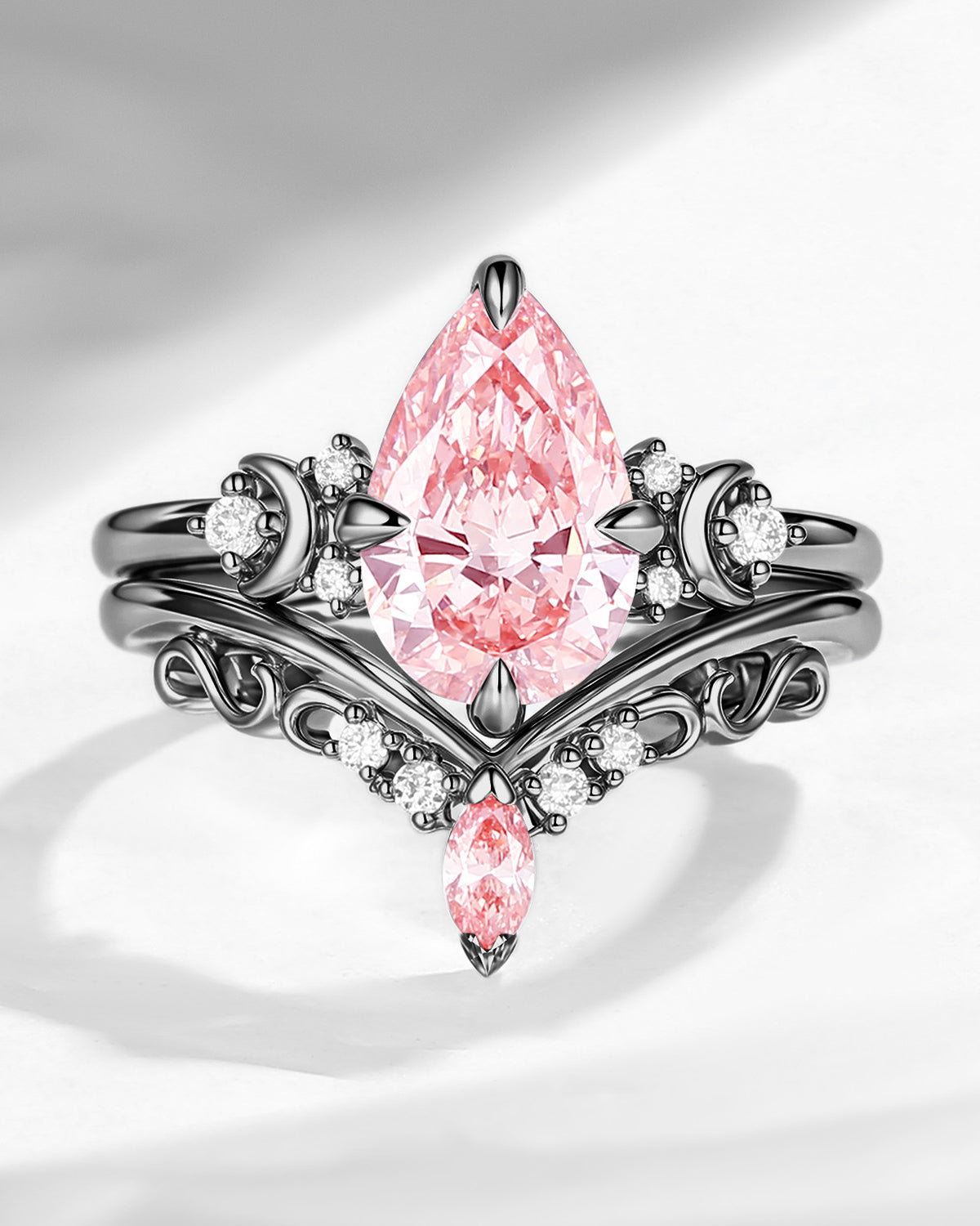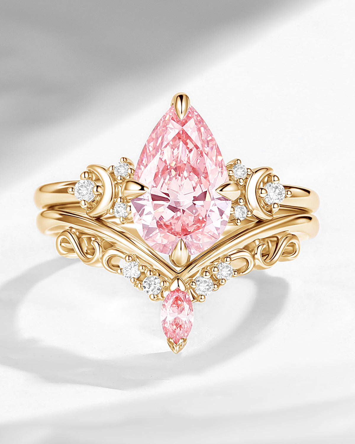 Crescent Moon | Pear Shaped Art Deco Pink Lab Diamond Engagement Ring Set 2pcs