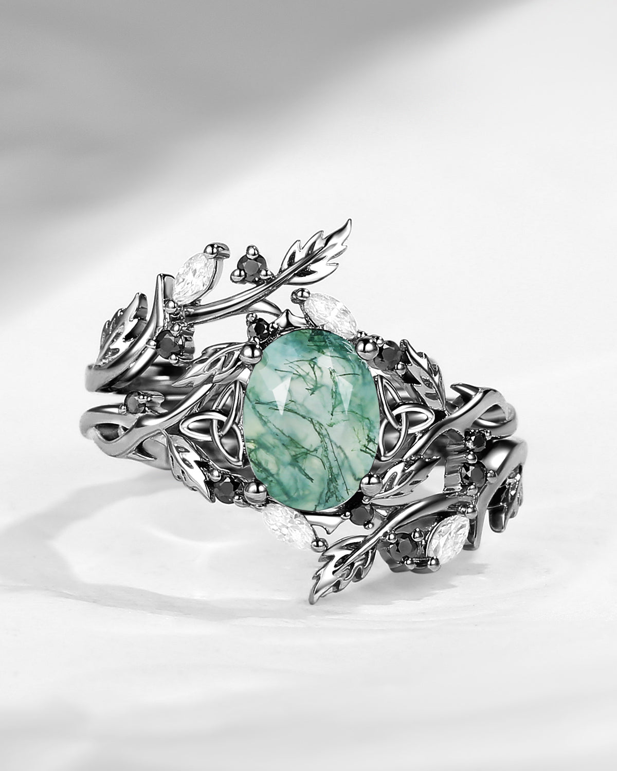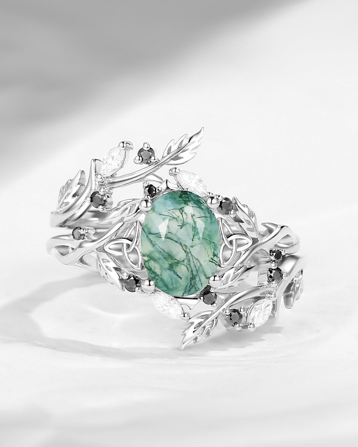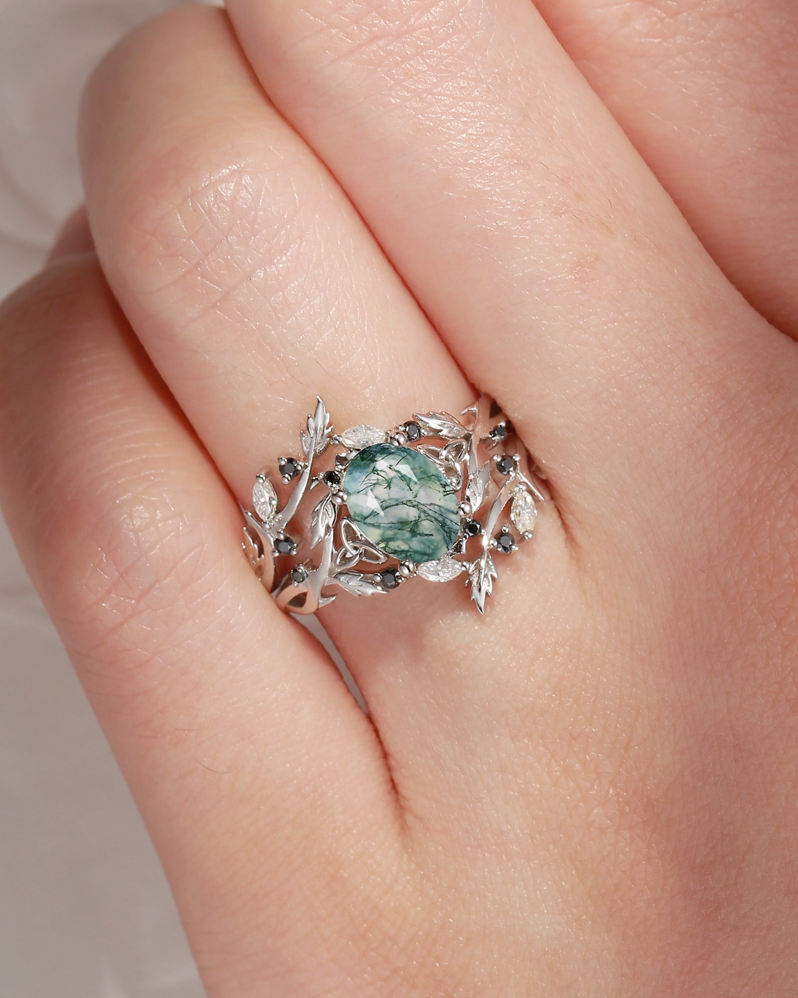 Coffin Moss Agate Nature Inspired Celtic Engagement Ring