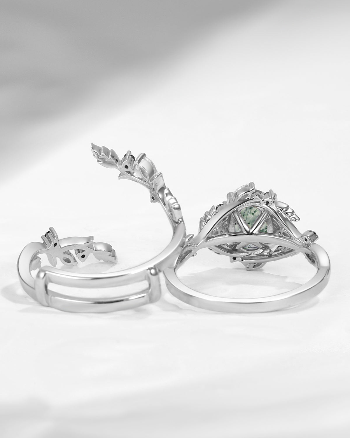 Nature Inspired Pear Cut Moss Agate Halo Engagement Ring Set 3pcs