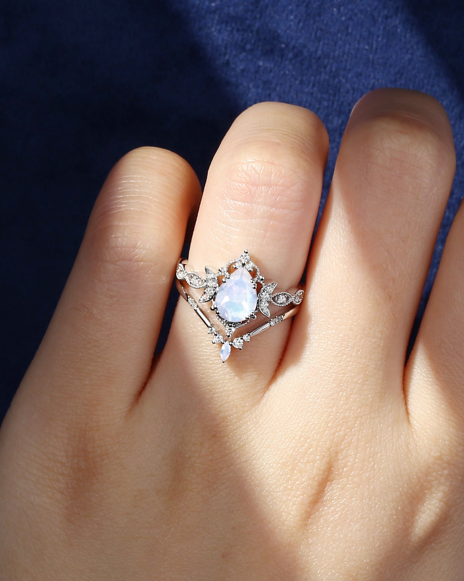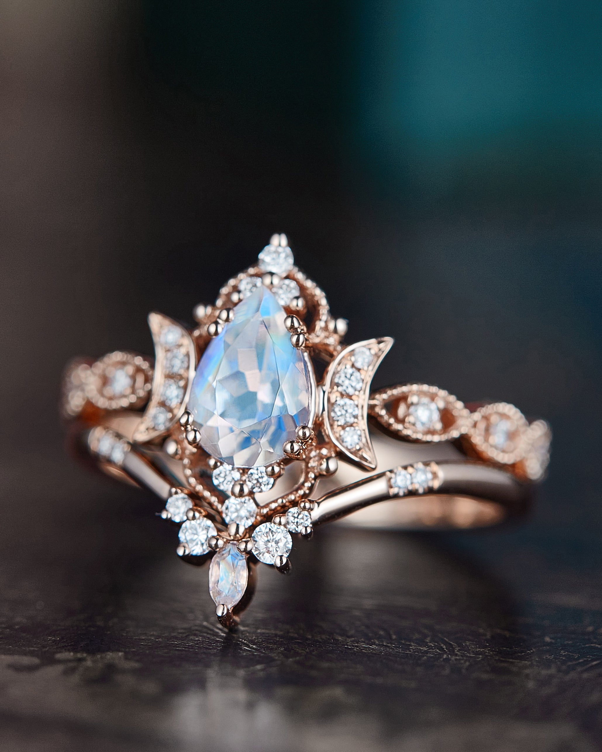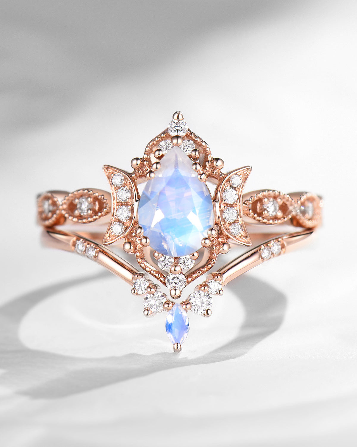 Crescent Moon | Vintage Pear Cut Moonstone Engagement Ring 2pcs - Luna