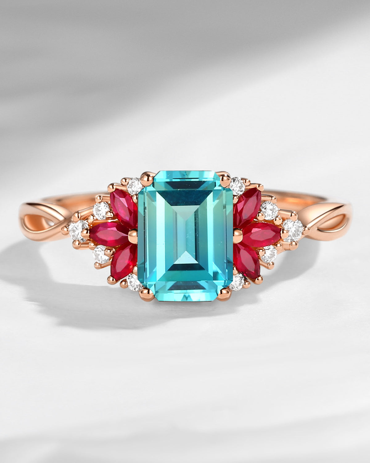Cluster Emerald Cut Lab Paraiba & Ruby Twist Engagement Ring