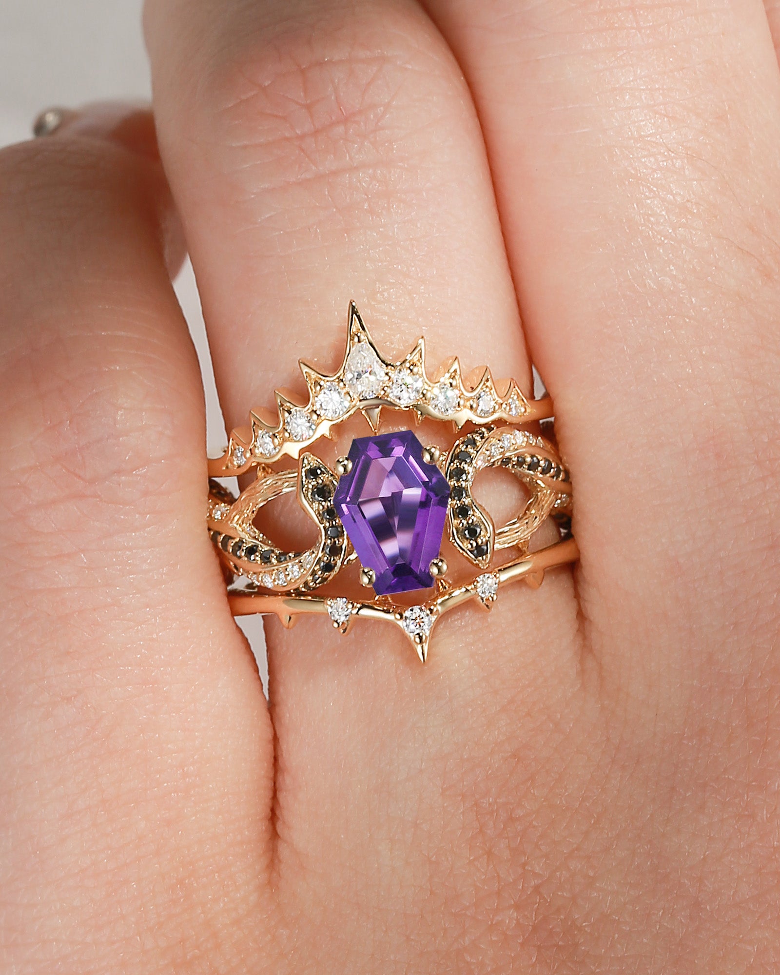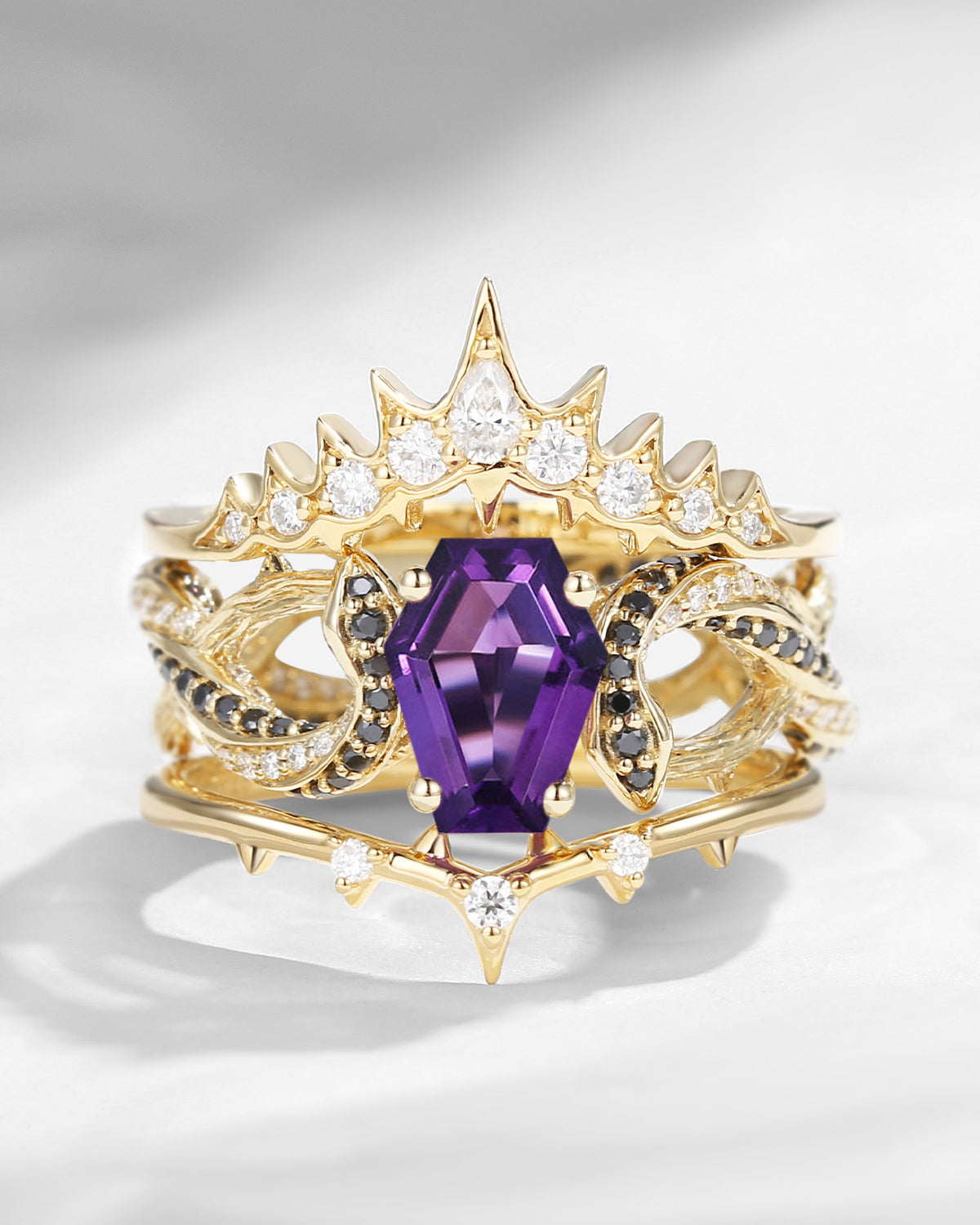 Unique Coffin Cut Moissanite Onyx Black Gold Bridal Set 2pcs - Bat Ring