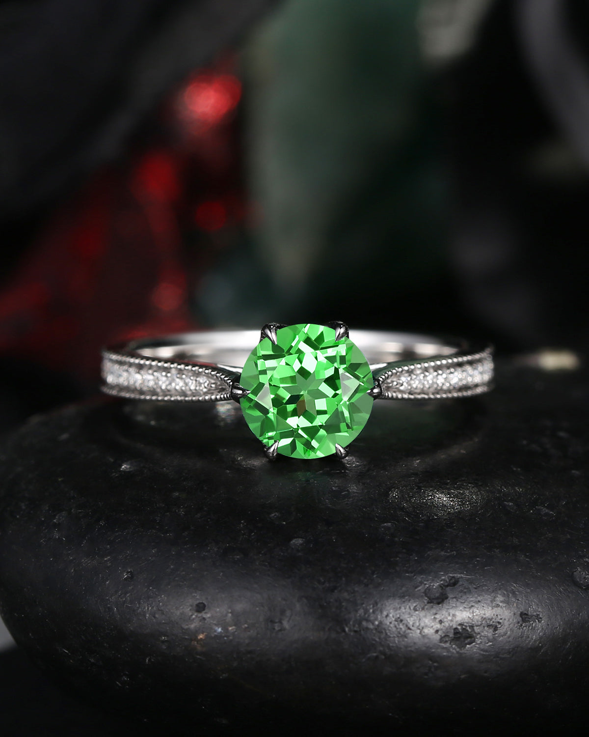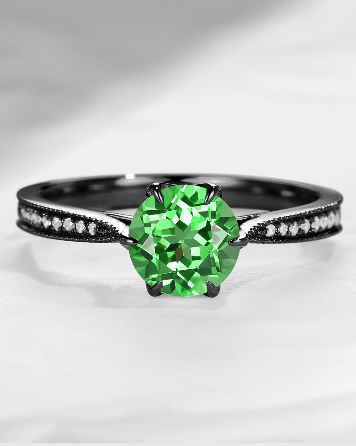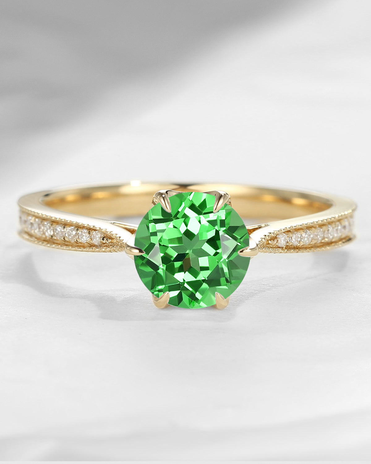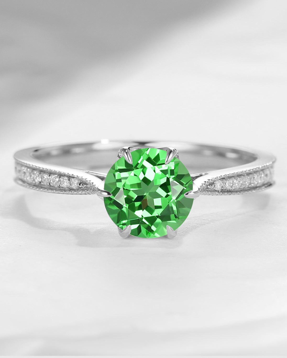 Antique Round Cut Lab Tsavorite Milgrain Engagement Ring