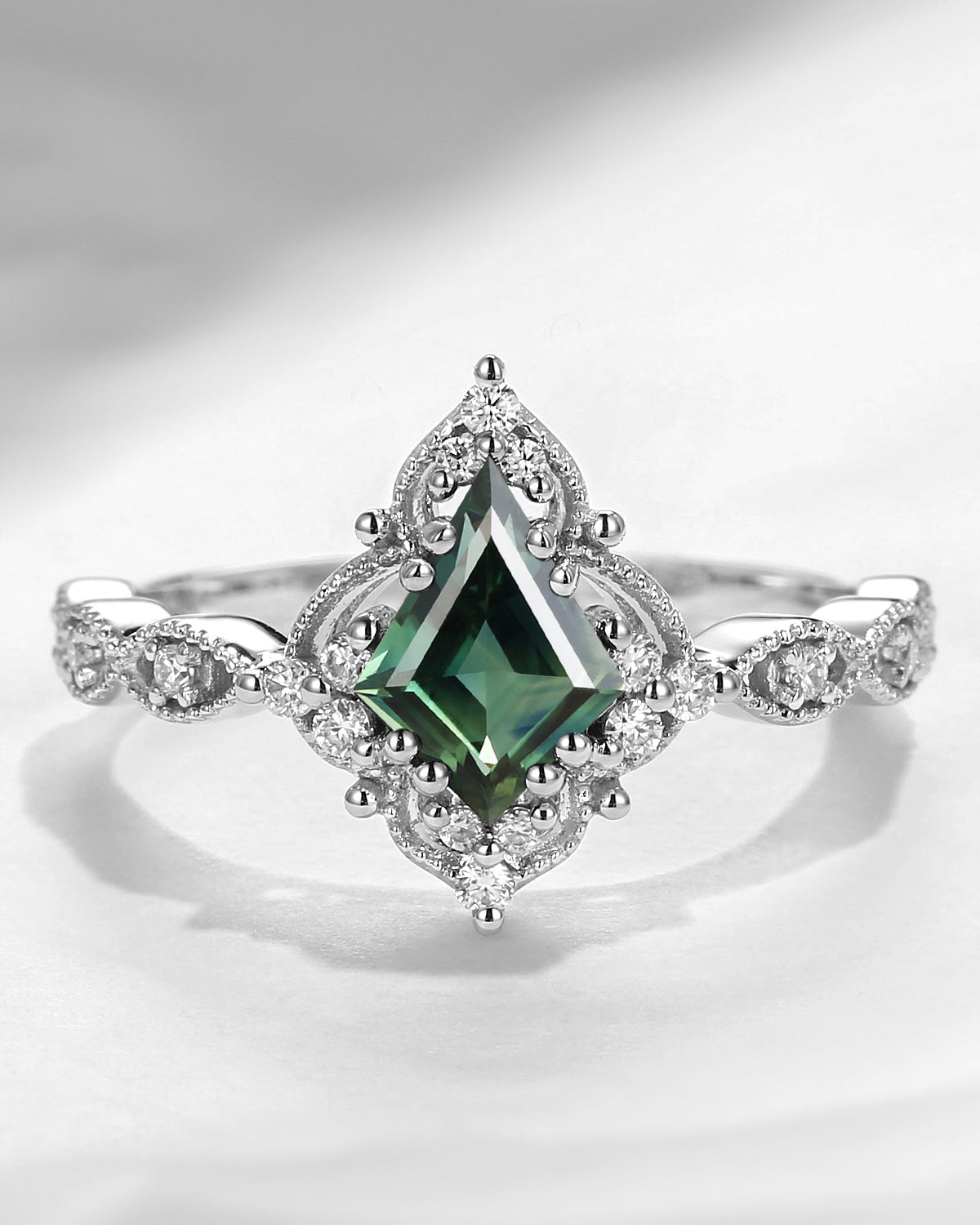 Vintage Inspired Milgrain Kite Cut Natural Teal Sapphire Engagement Ring