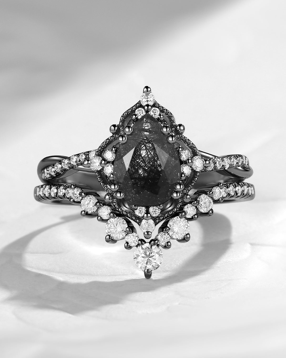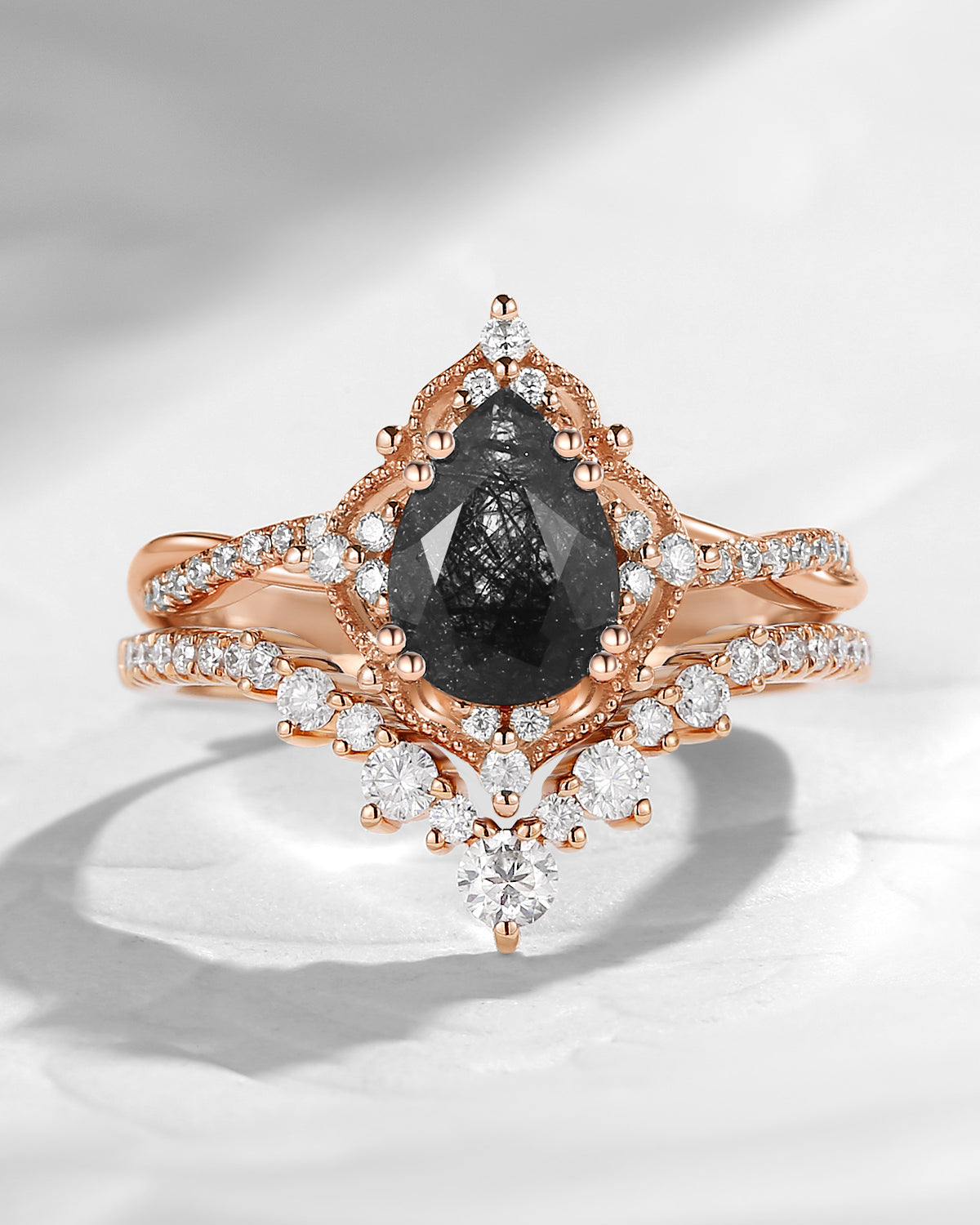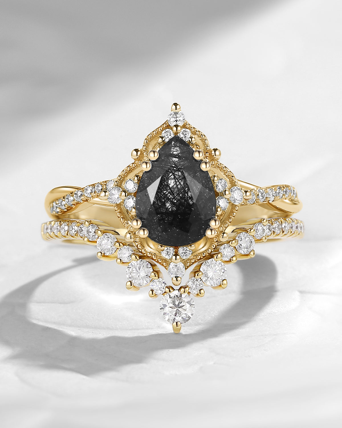 Vintage Inspired Pear Shaped Milgrain Black Rutilated Quartz Engagement Ring Set 3pcs - Diva