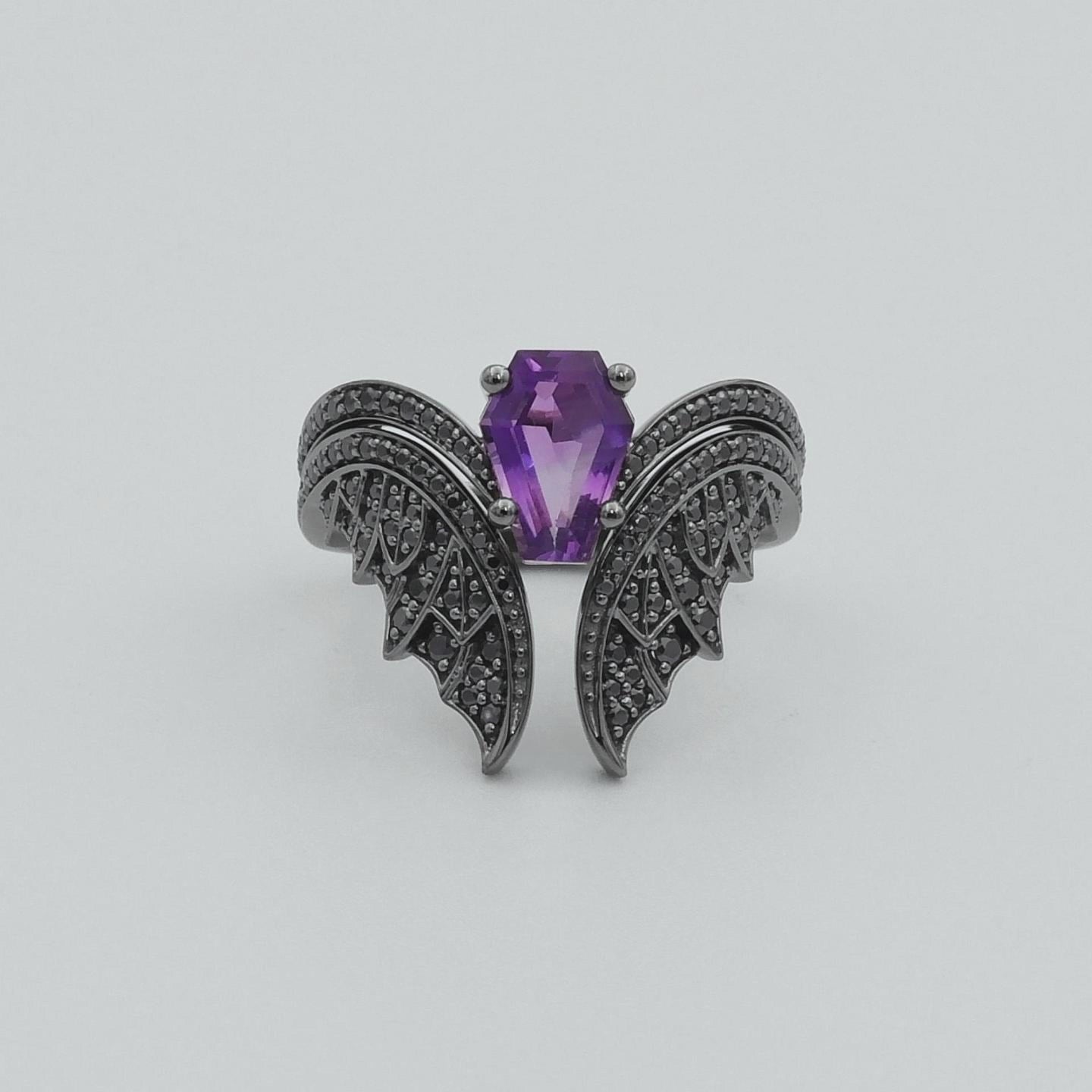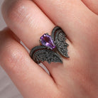 Coffin Cut Natural Amethyst Vintage Black Gold Bridal Set 2pcs - Bat Ring