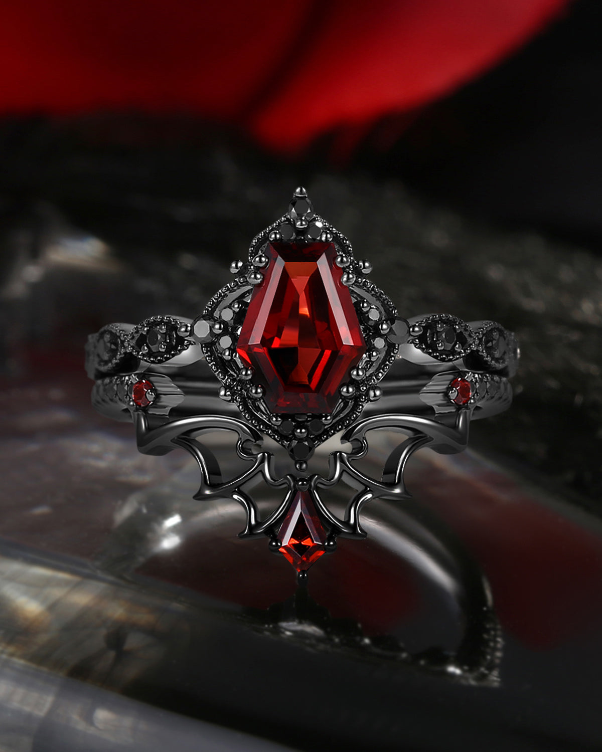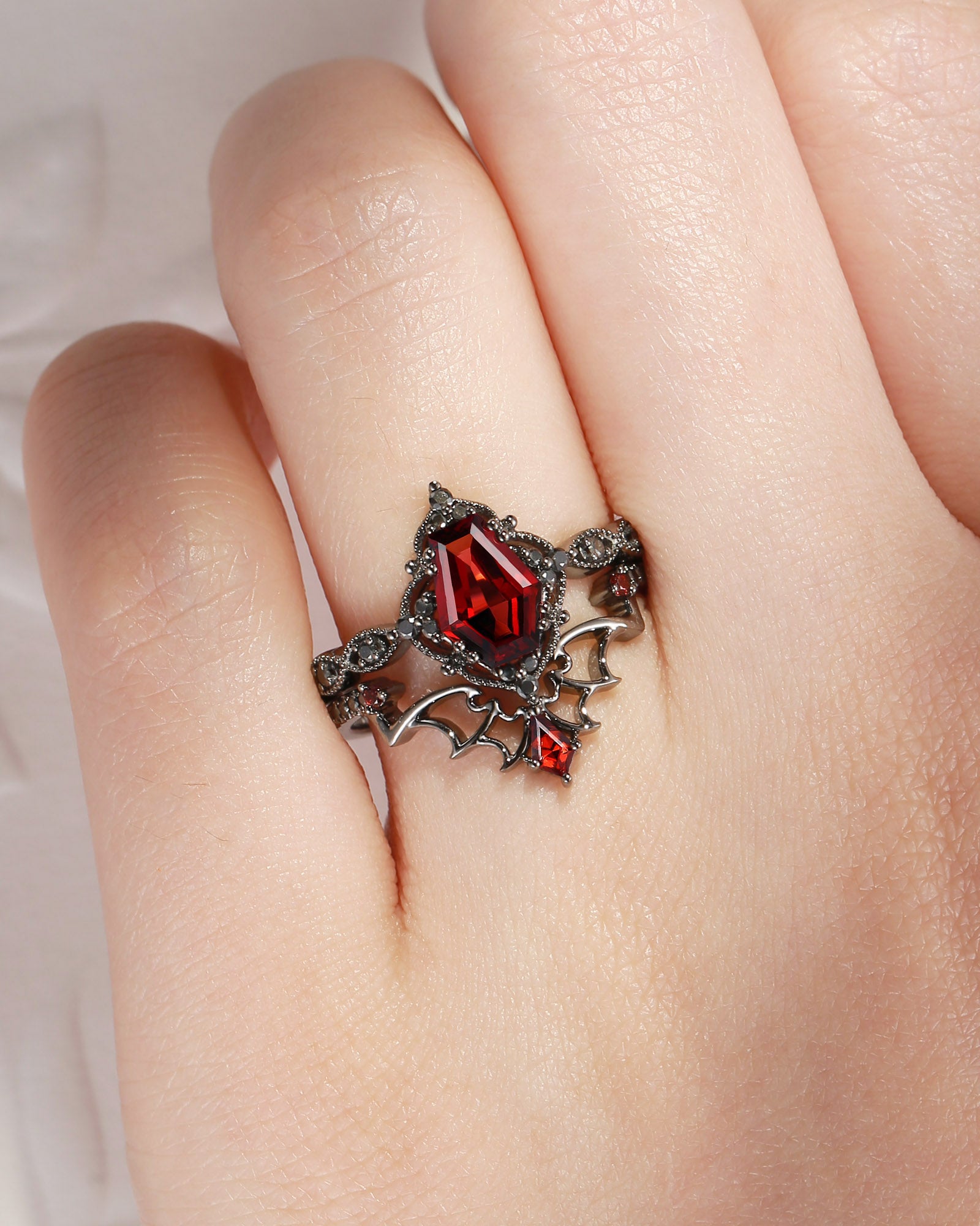 Gothic Coffin Garnet Bat Wing Inspired Couple Bridal Ring Set