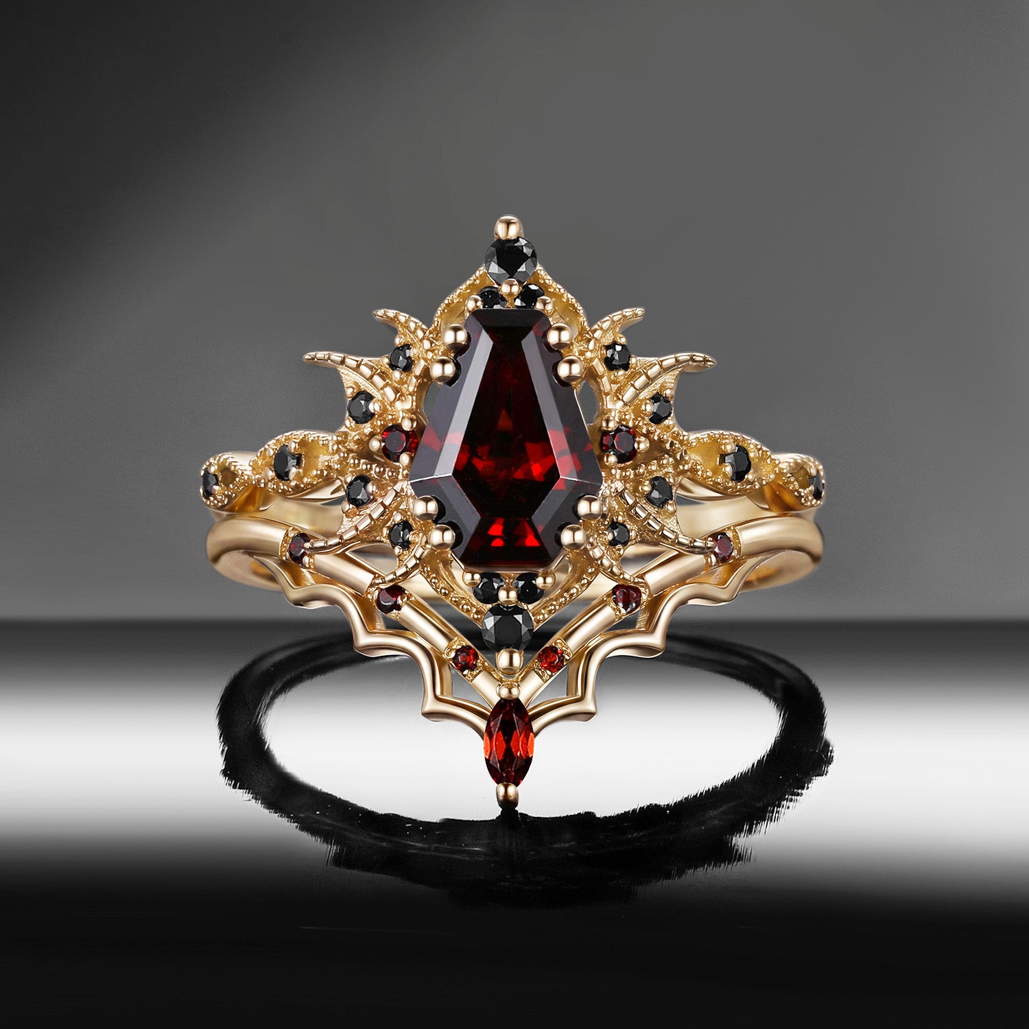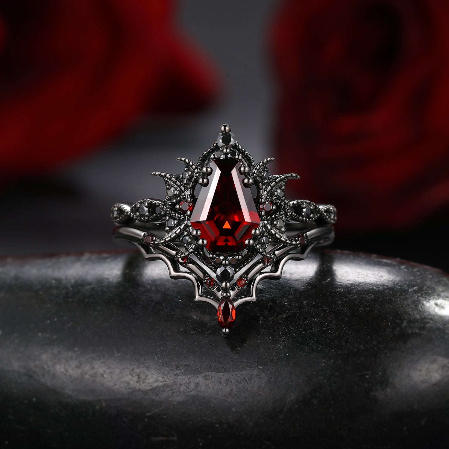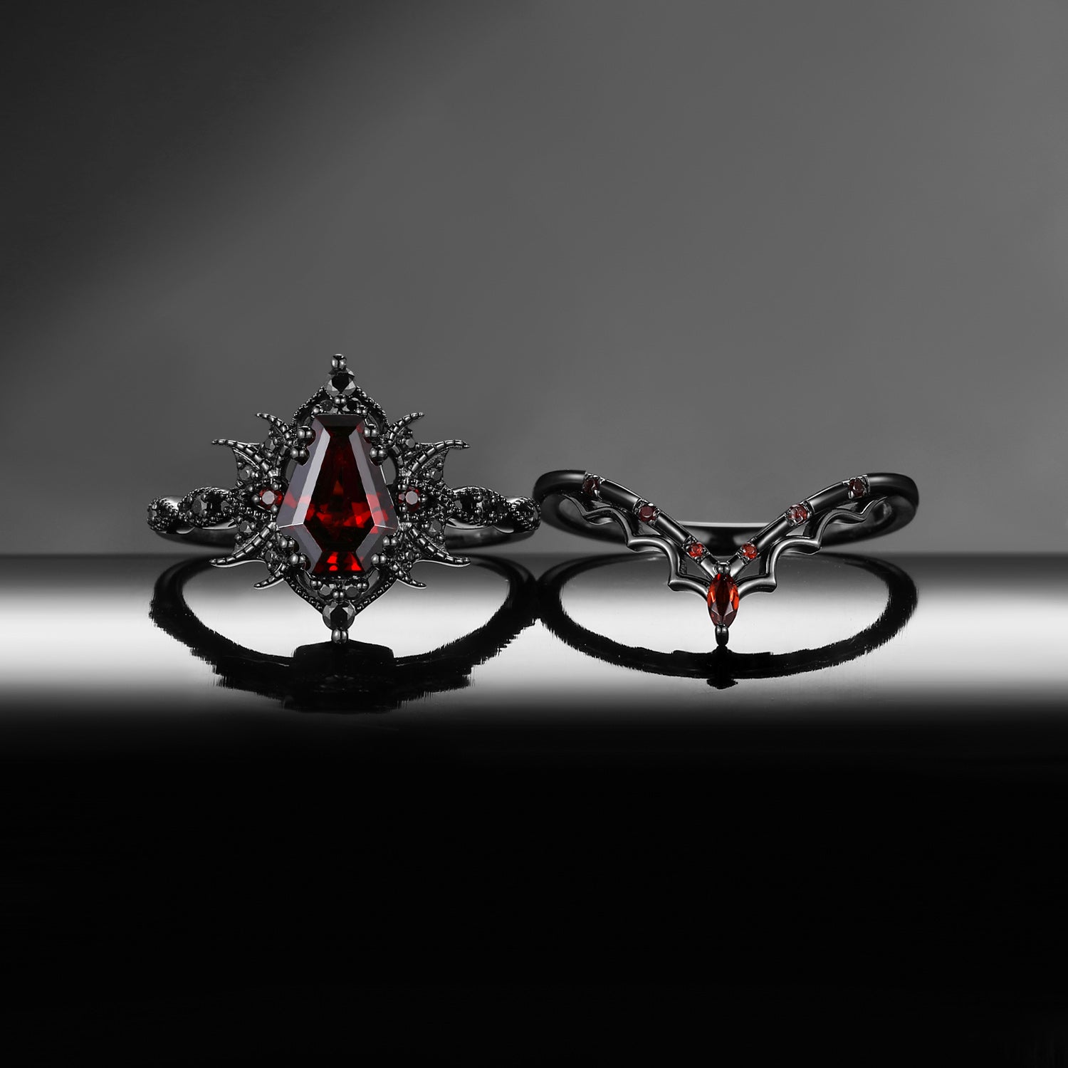 Gothic Inspired 'Bat Romance' Coffin Shaped Garnet Black Gold Engagement Ring Set 2pcs