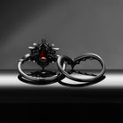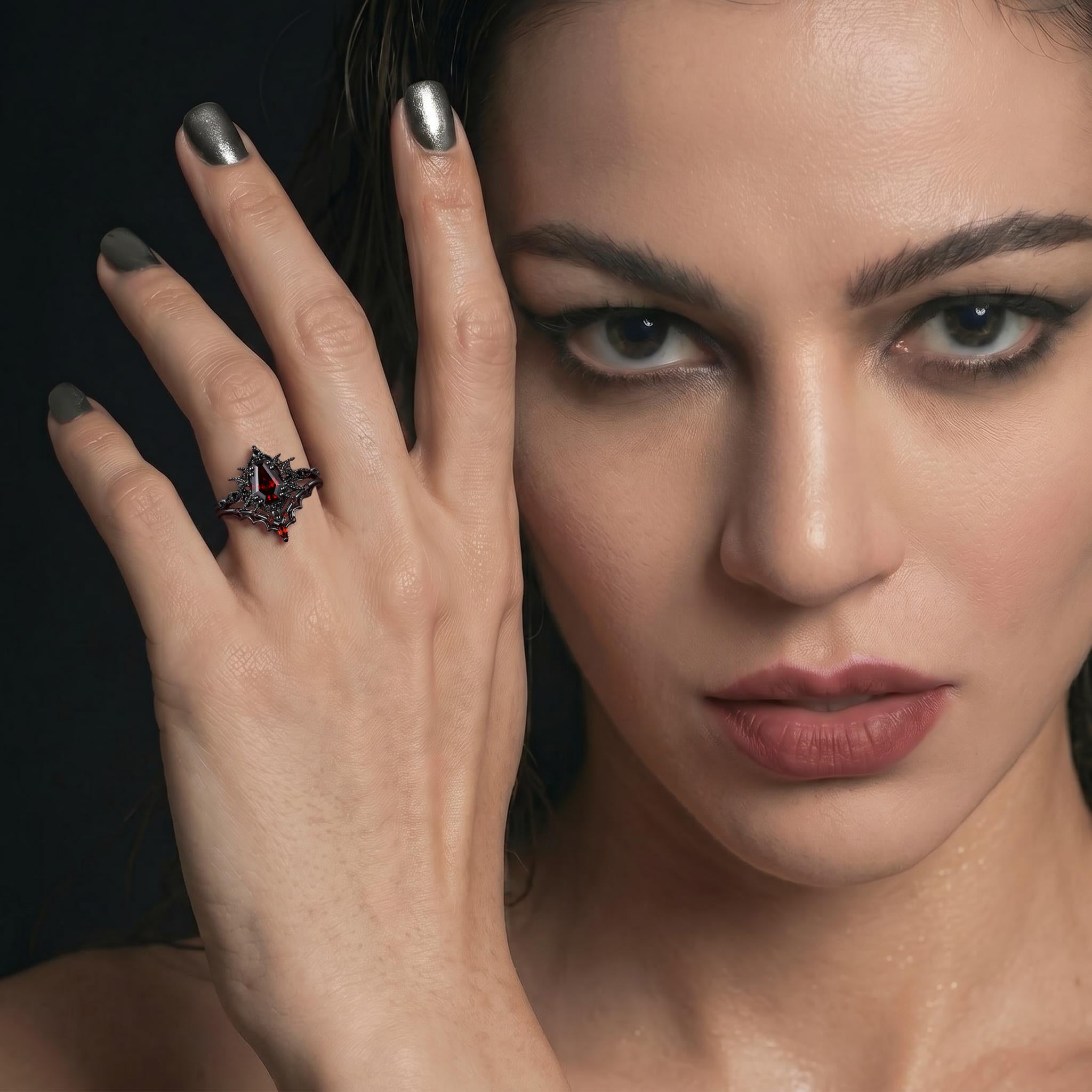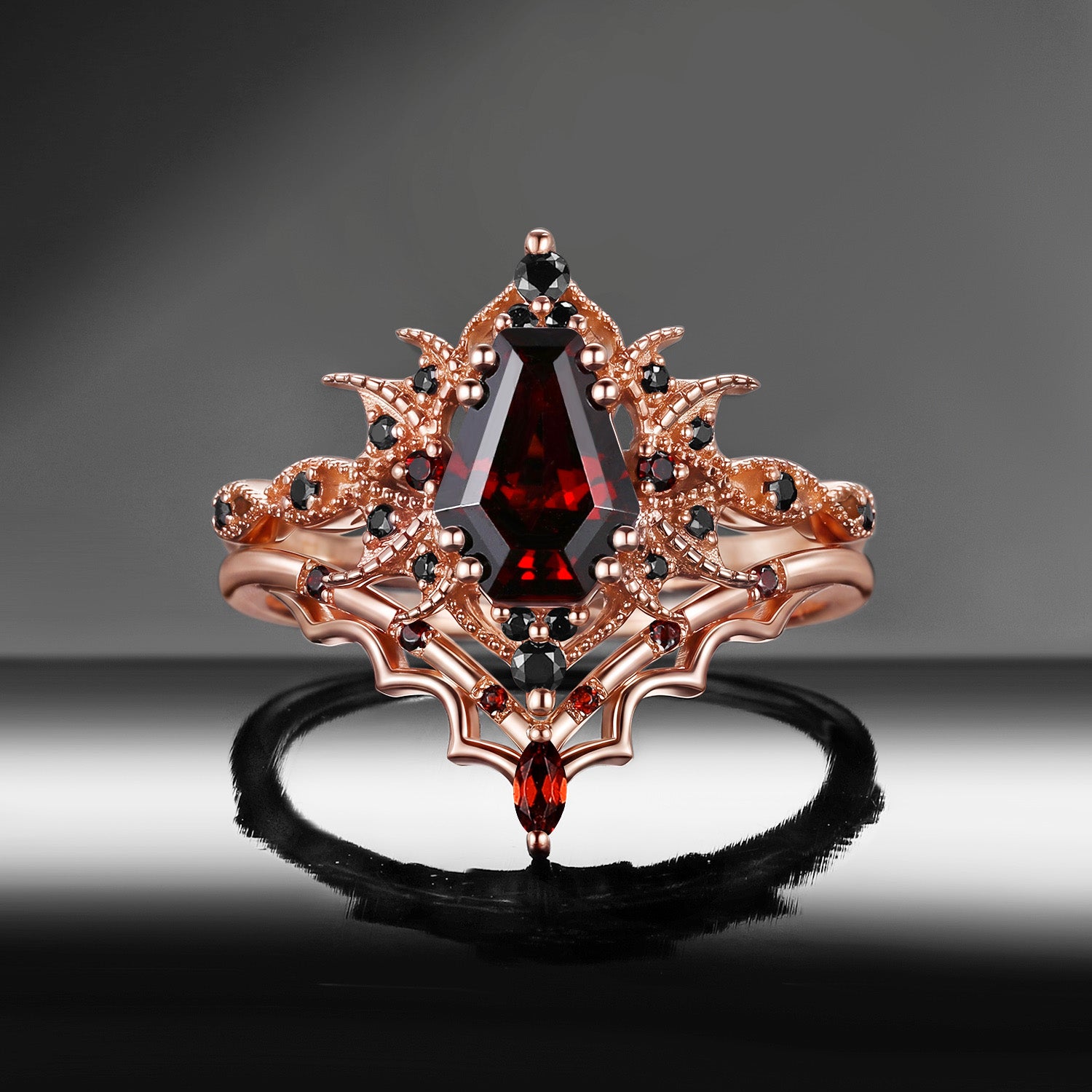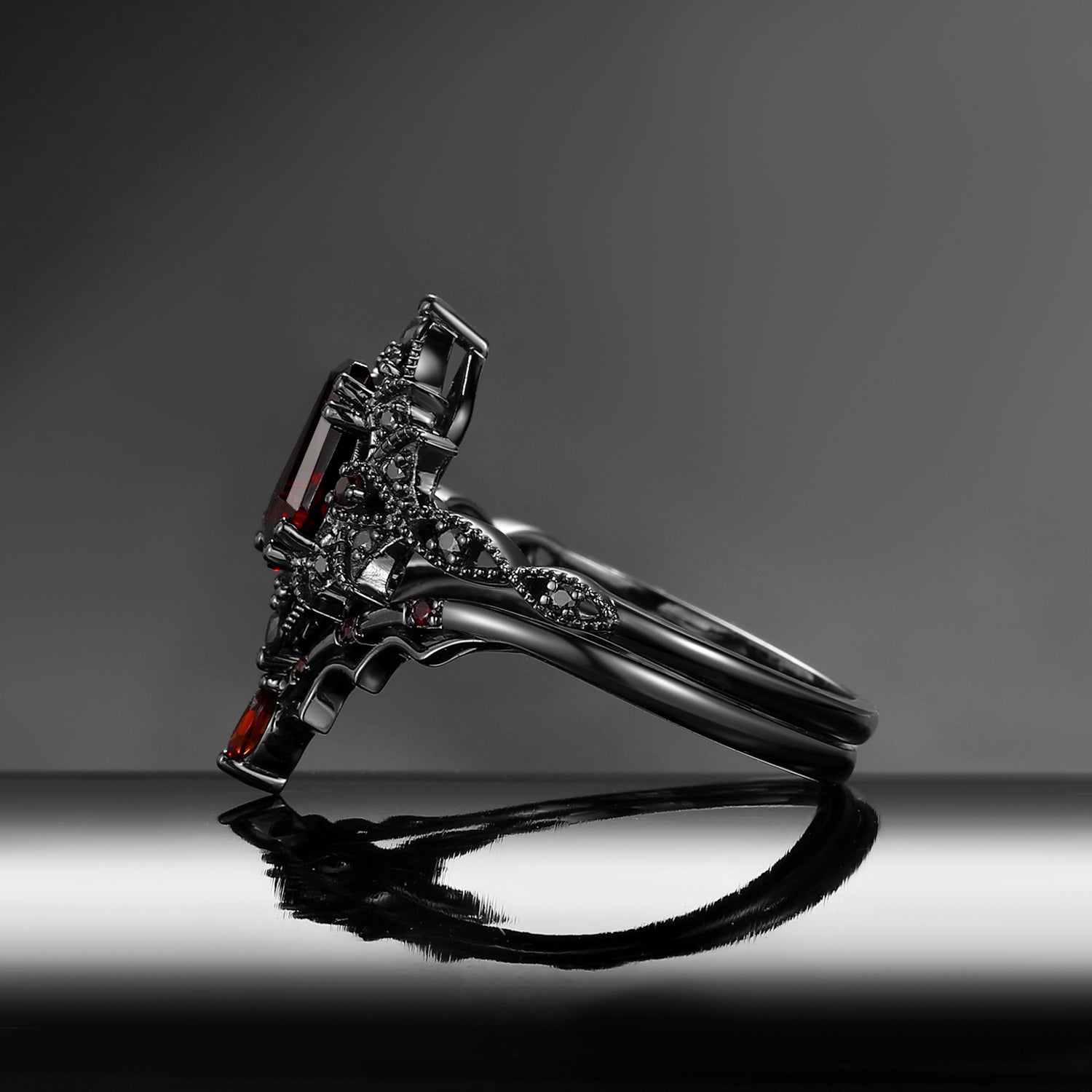 Gothic Inspired 'Bat Romance' Coffin Shaped Garnet Black Gold Engagement Ring Set 2pcs