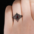 Gothic Inspired Coffin Shaped Garnet Black Gold Milgrain Engagement Ring Set 2pcs - Bat Romance
