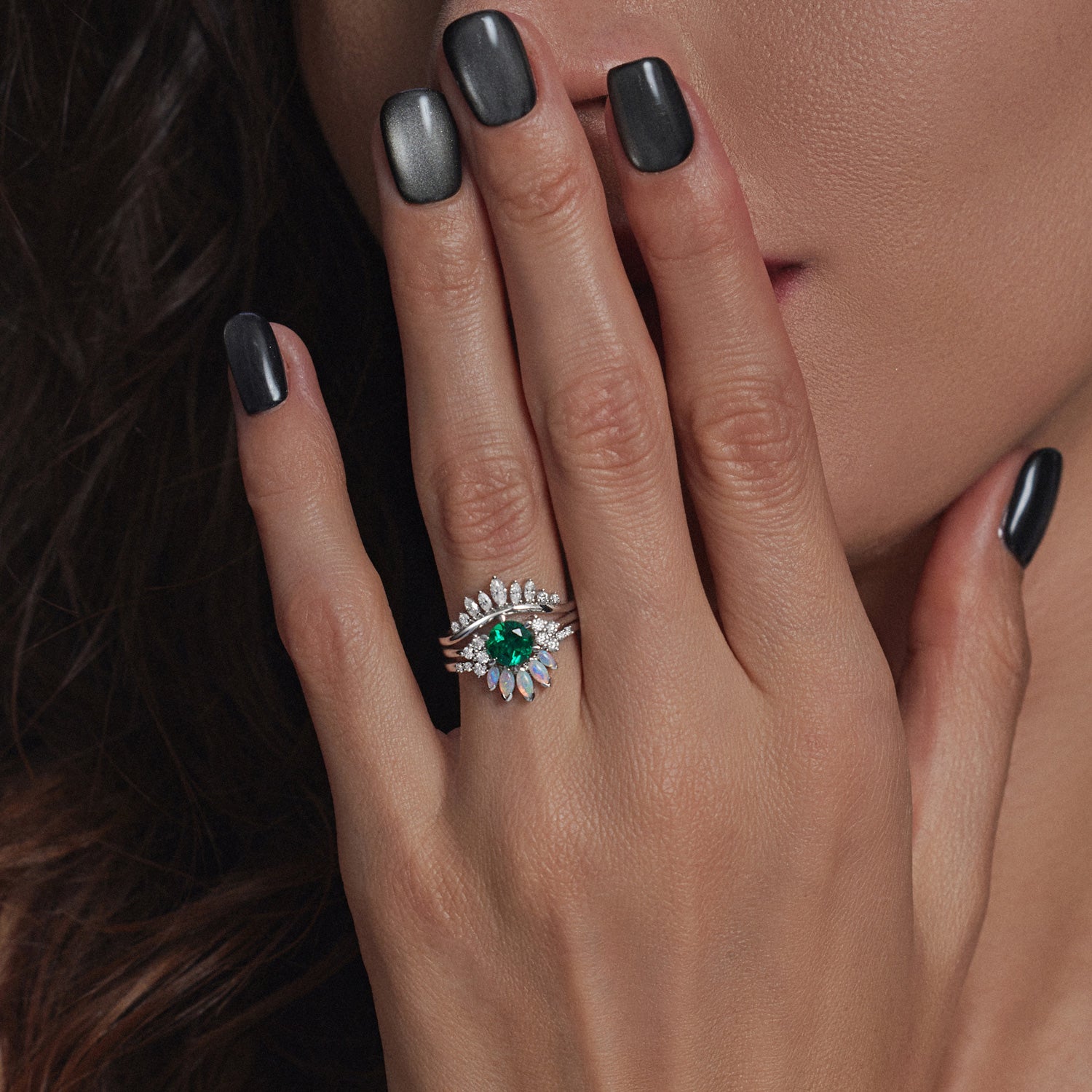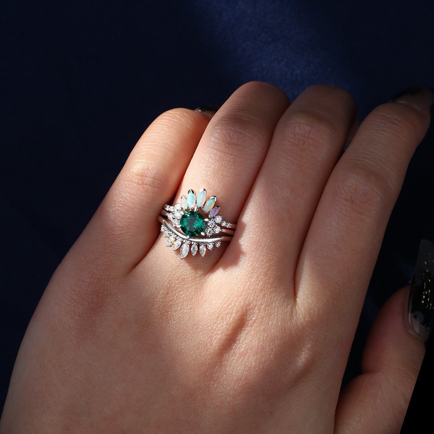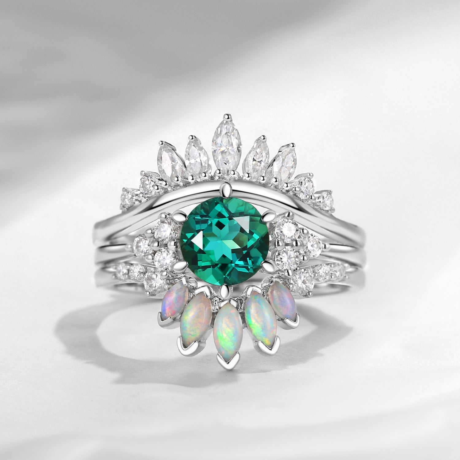 Lab Emerald Engagement Ring Set 3pcs Stacking Rose Gold Bridal Set Marquise Opal Cluster Engagement Ring Wedding Band Marquise Moissanite