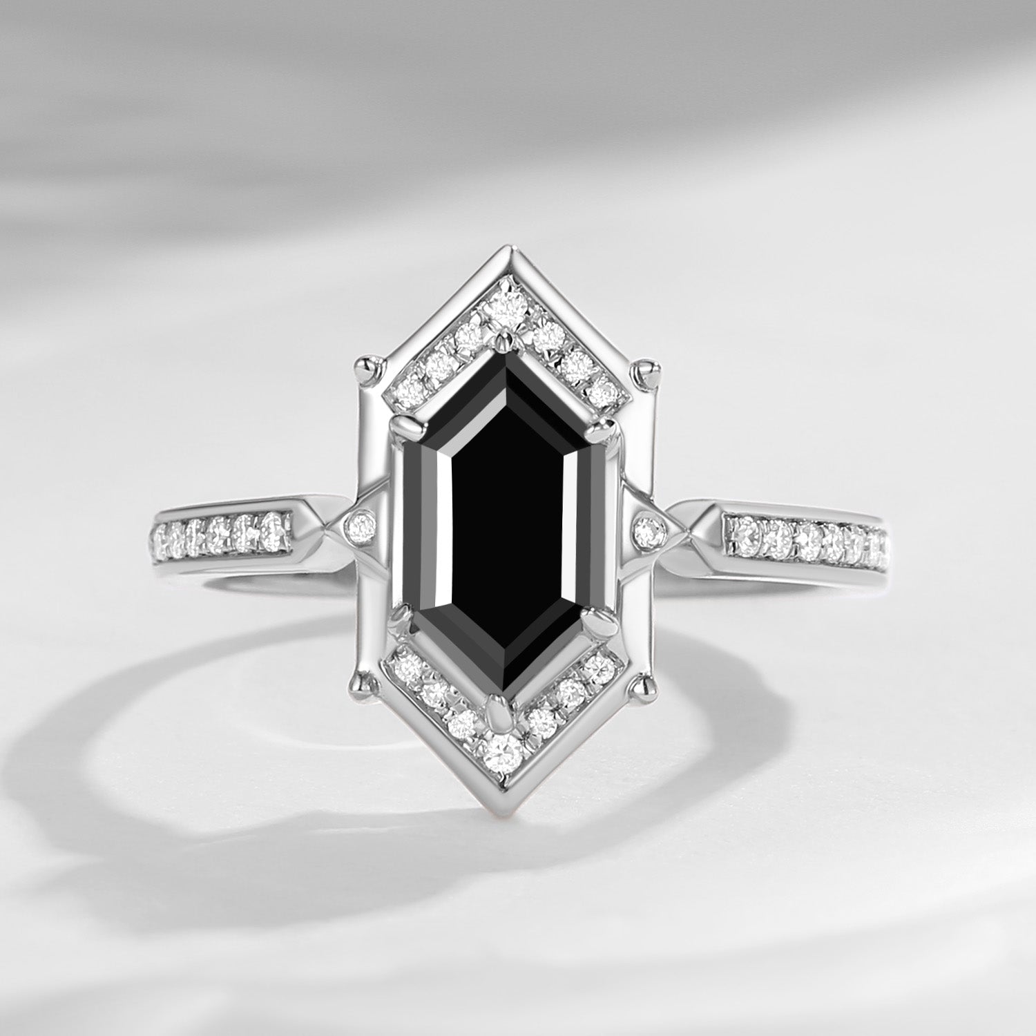 Long Hexagon Black Moissanite Vintage Engagement Ring