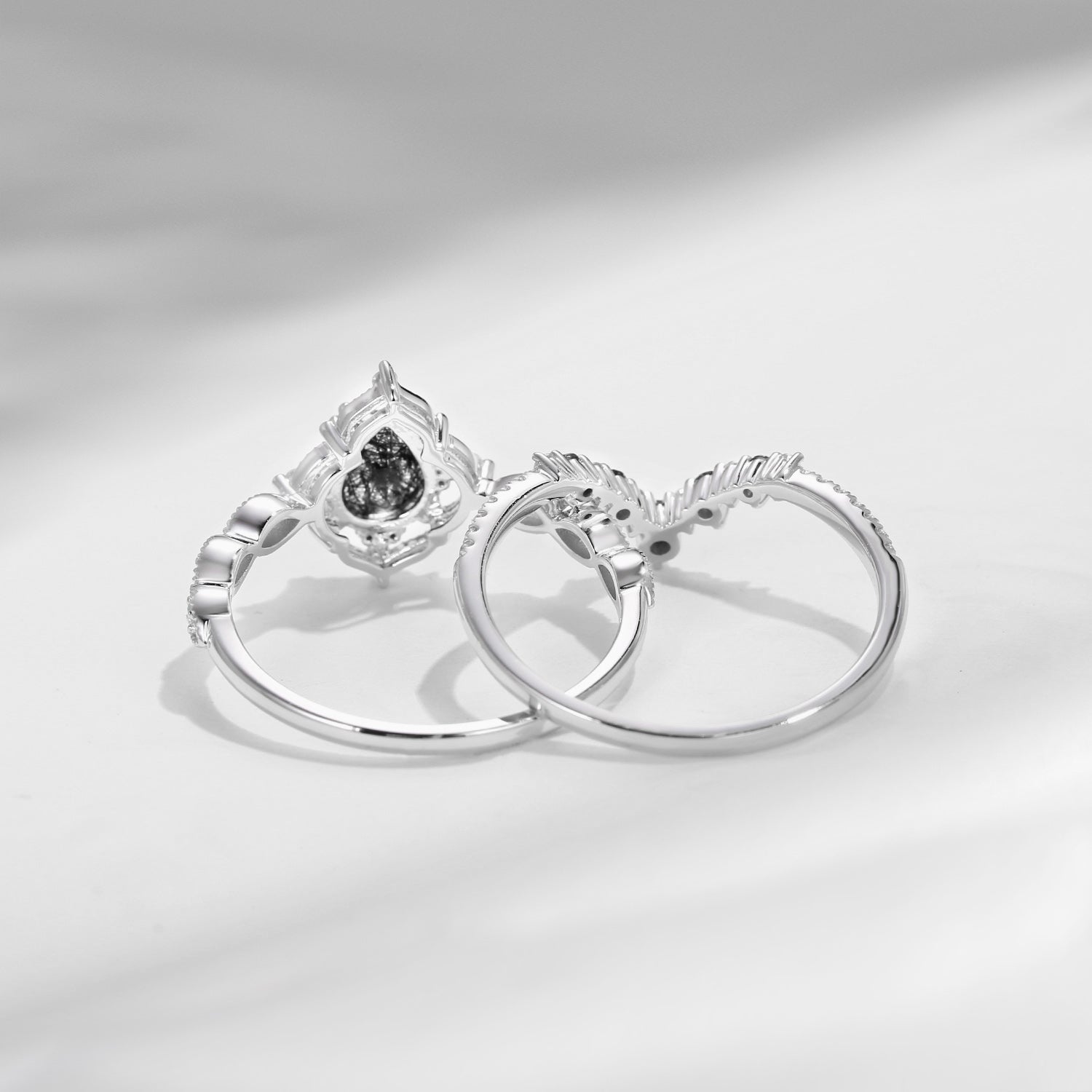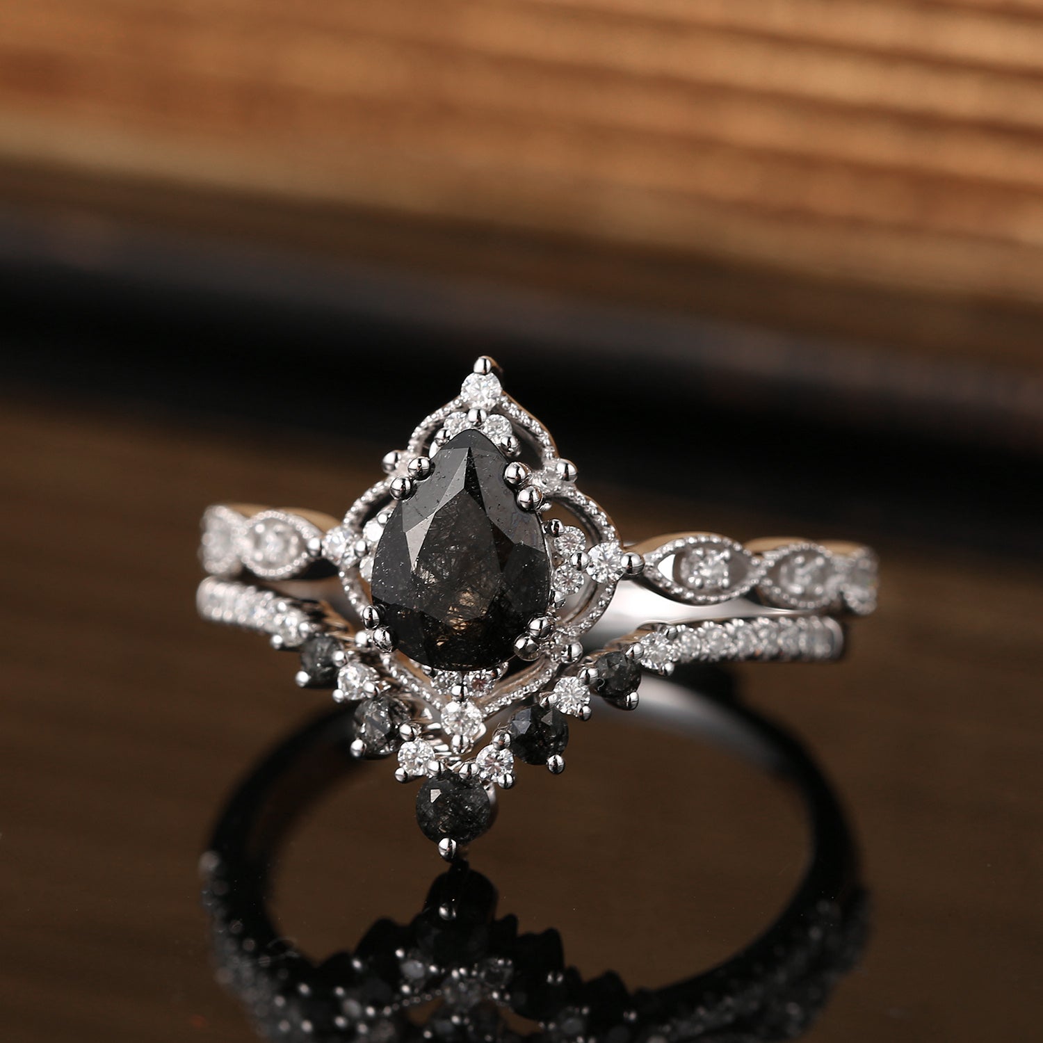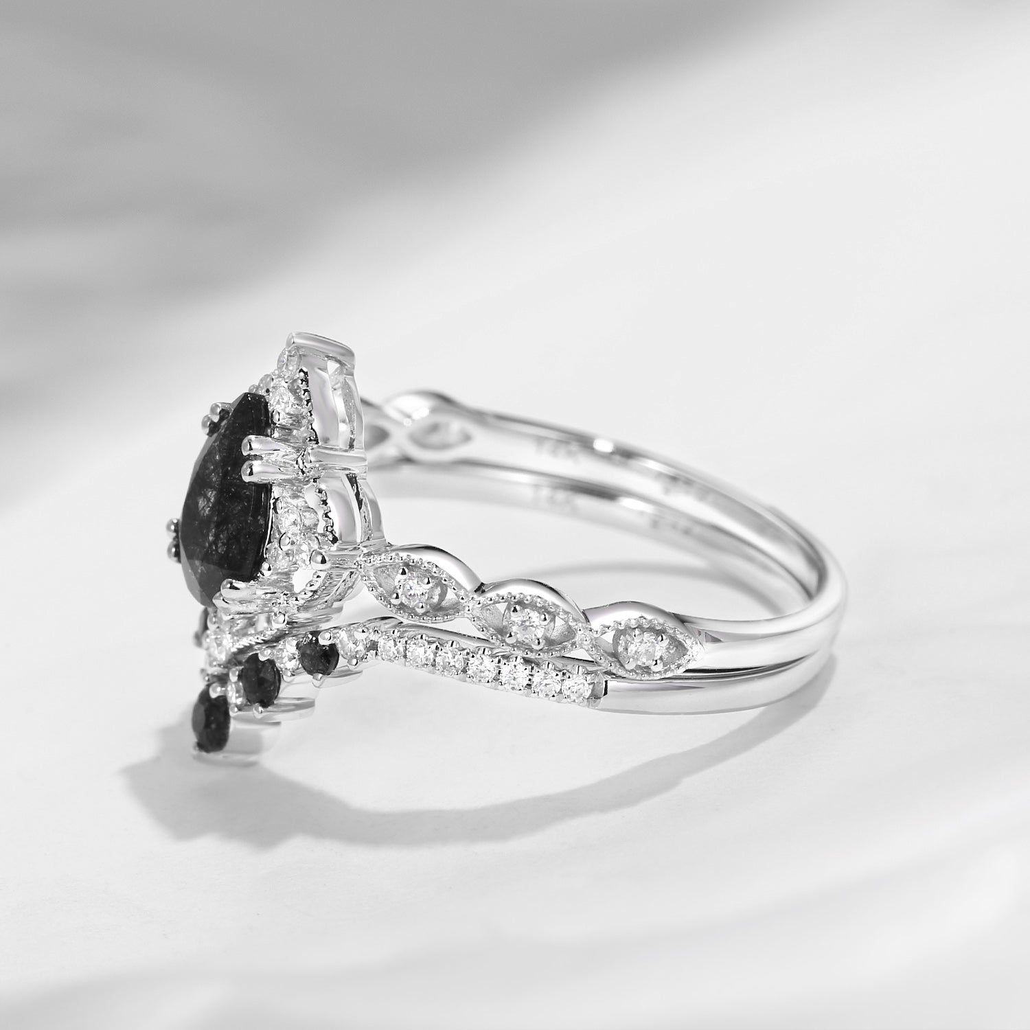 Antique Pear Cut Black Rutilated Quartz Engagement Ring 2pcs