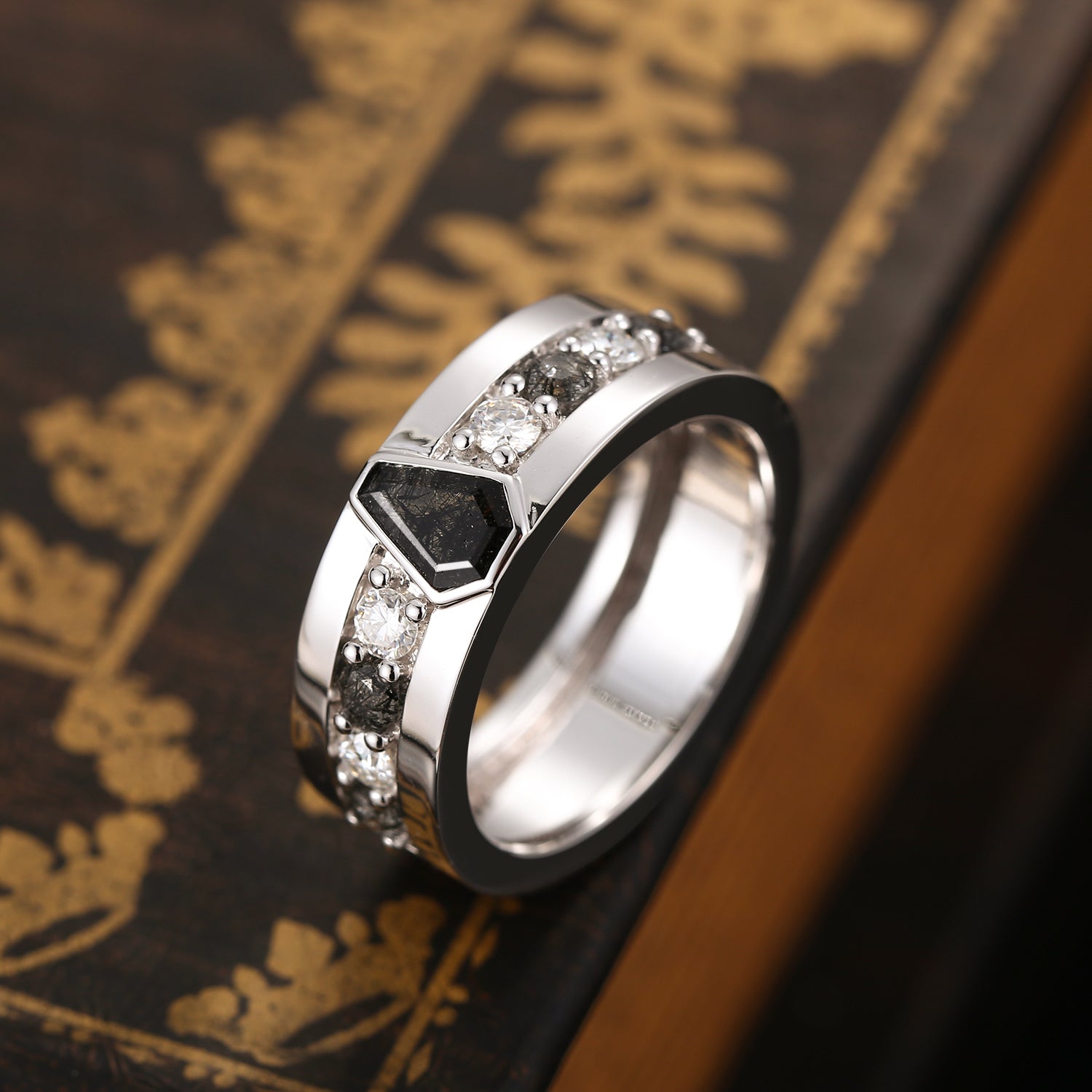 Unique Coffin Cut Black Rutilated Quartz Wedding Band For Men - King's Scepter
