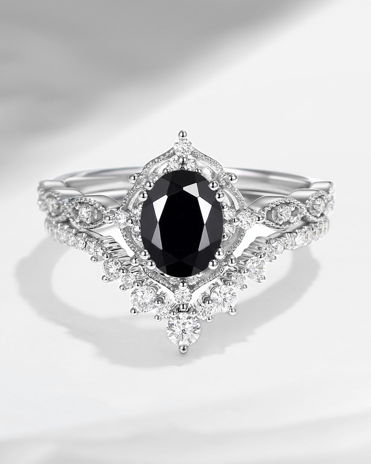 18k Antique Oval Black Moissanite Ring Set 2pcs