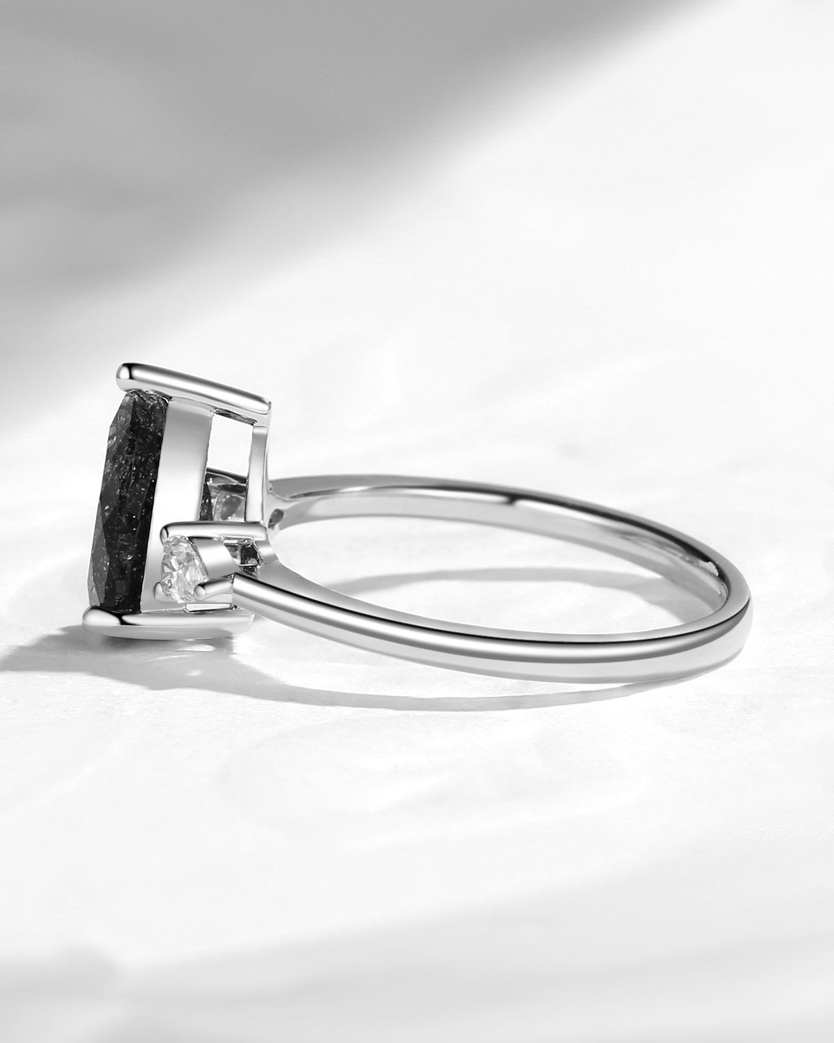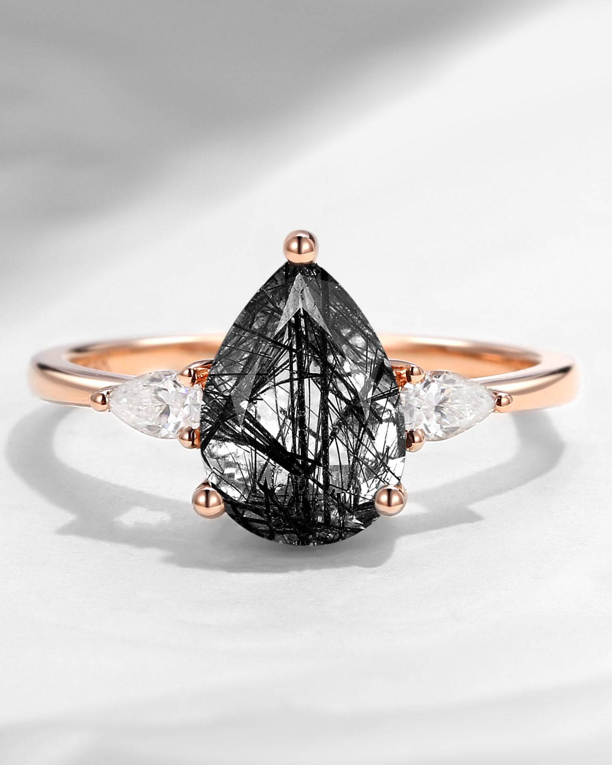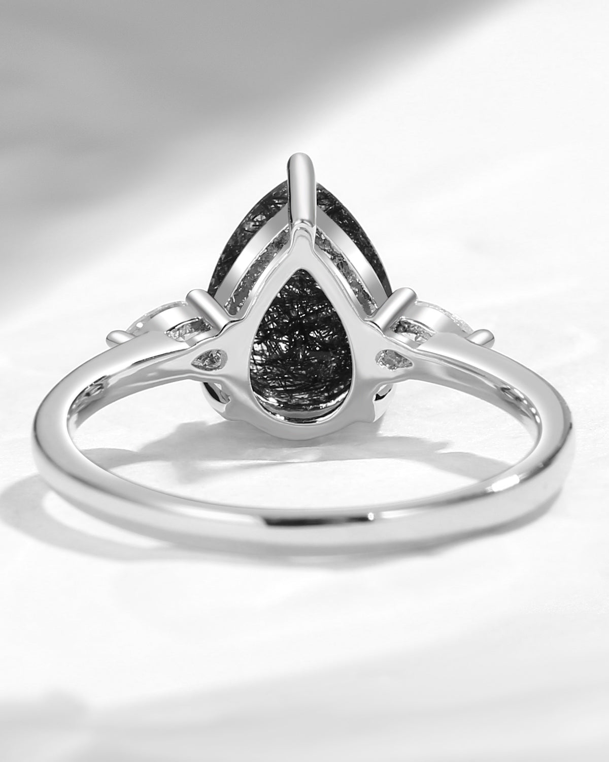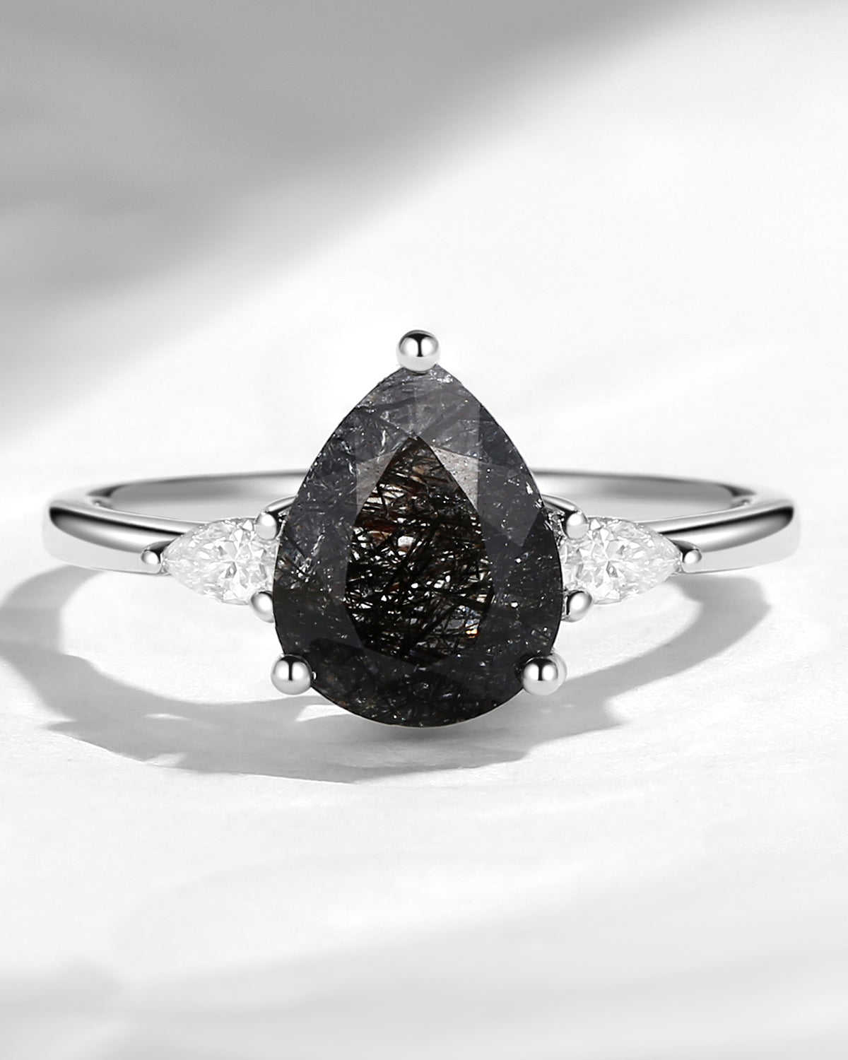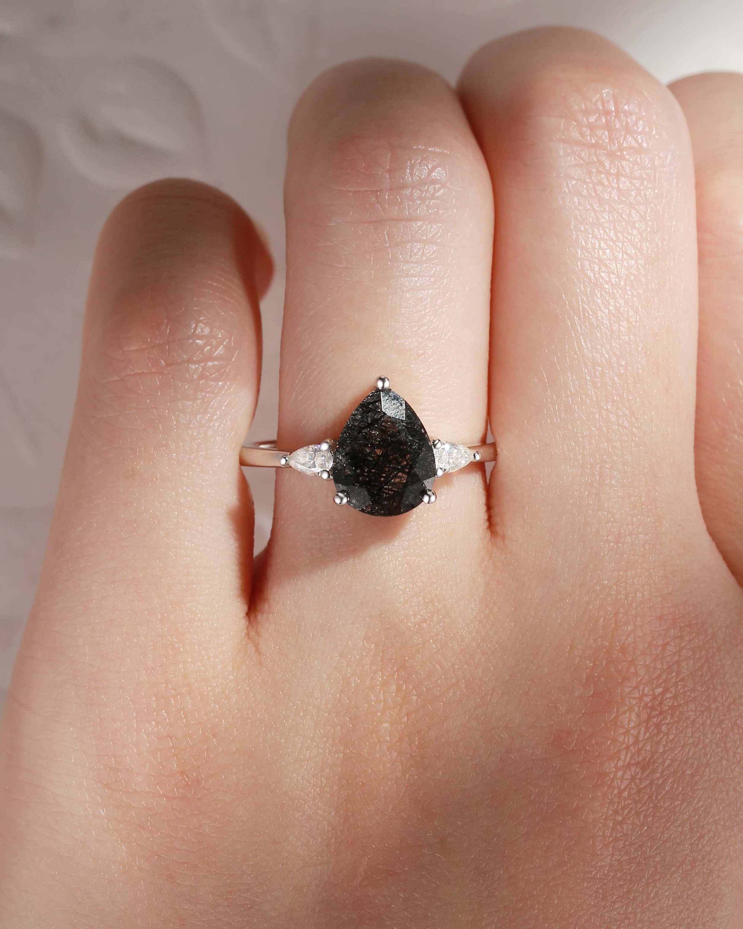 Pear Shaped Black Rutilated Quartz Three Stones Engagement Ring