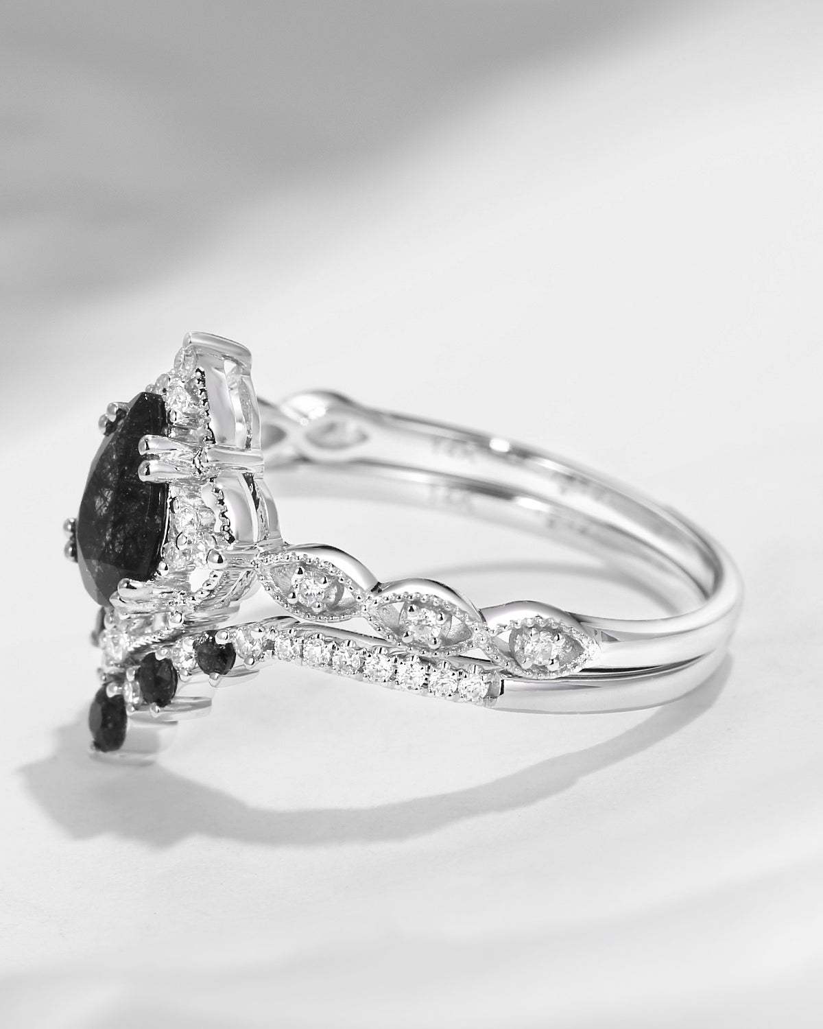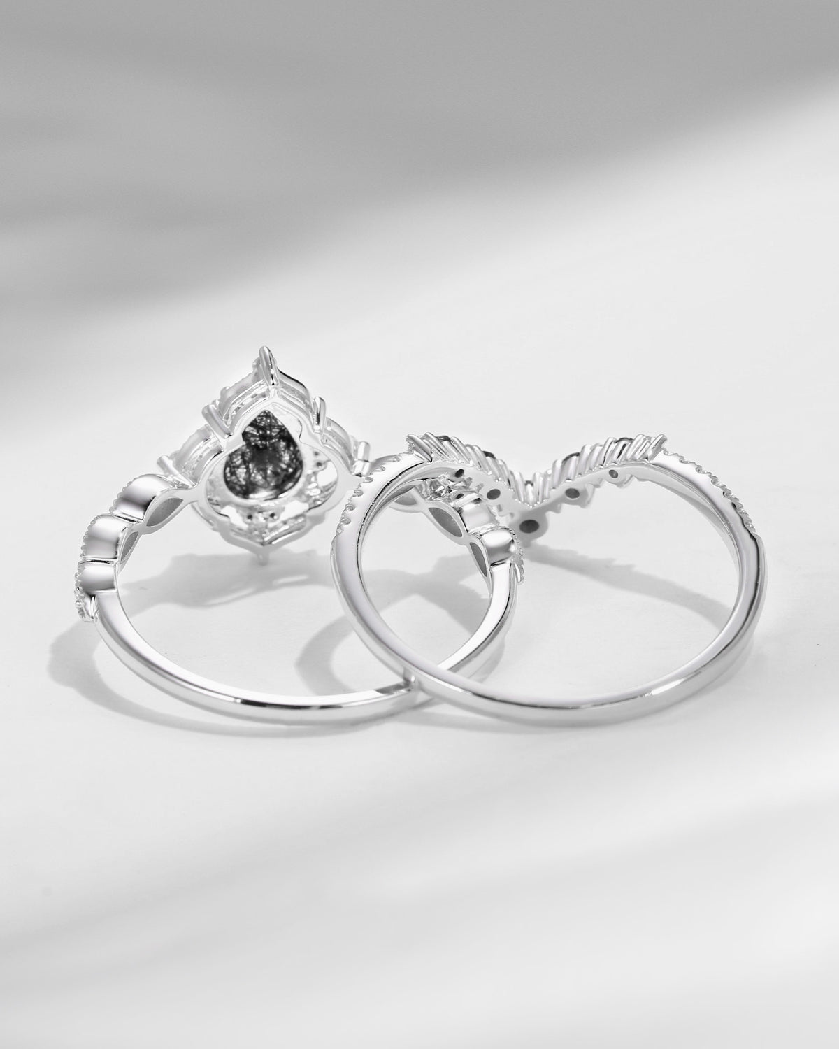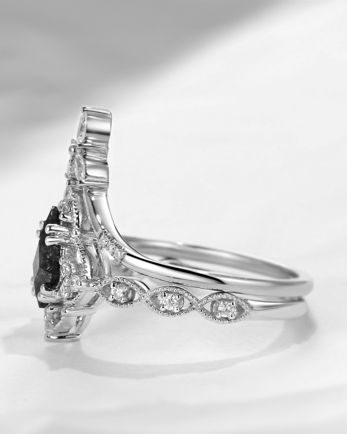 Crescent Moon | Vintage Pear Cut Black Rutilated Quartz Engagement Ring 2pcs