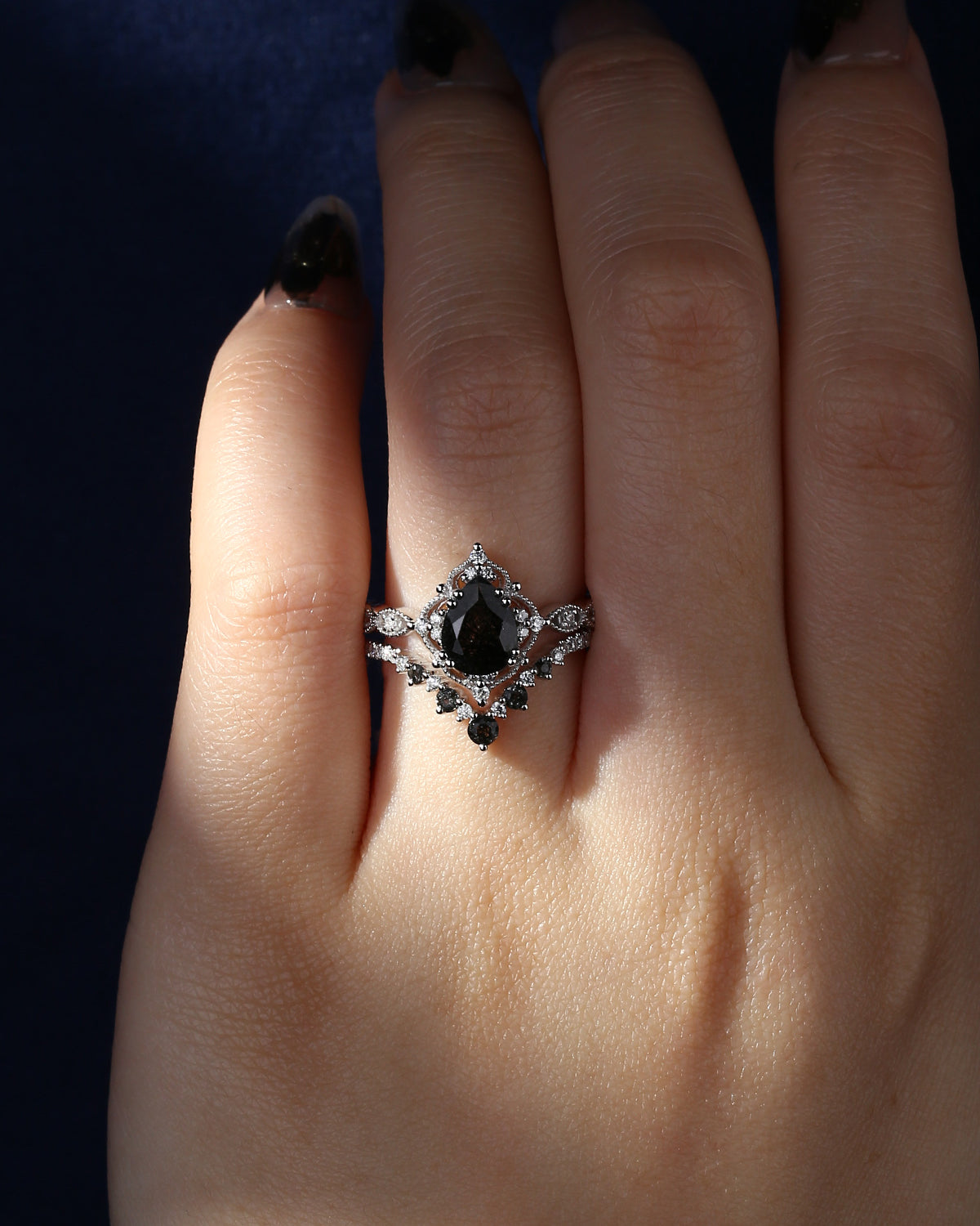 Crescent Moon | Vintage Pear Cut Black Moissanite Engagement Ring