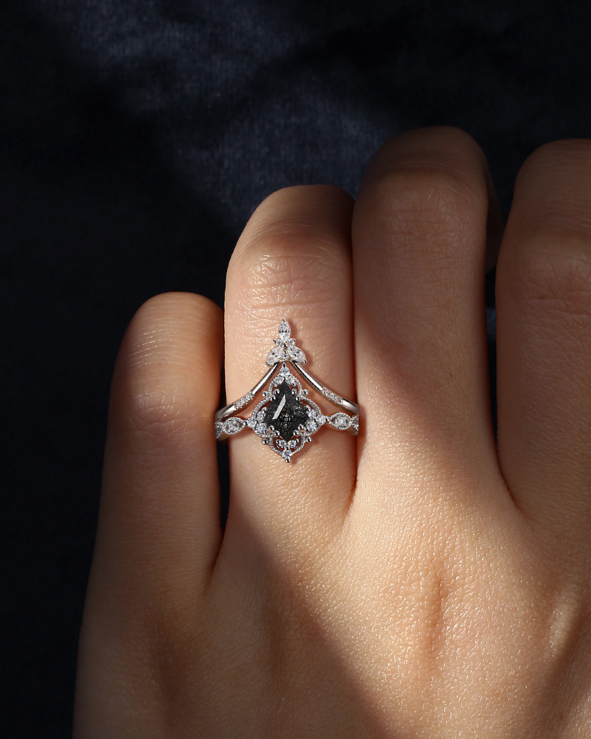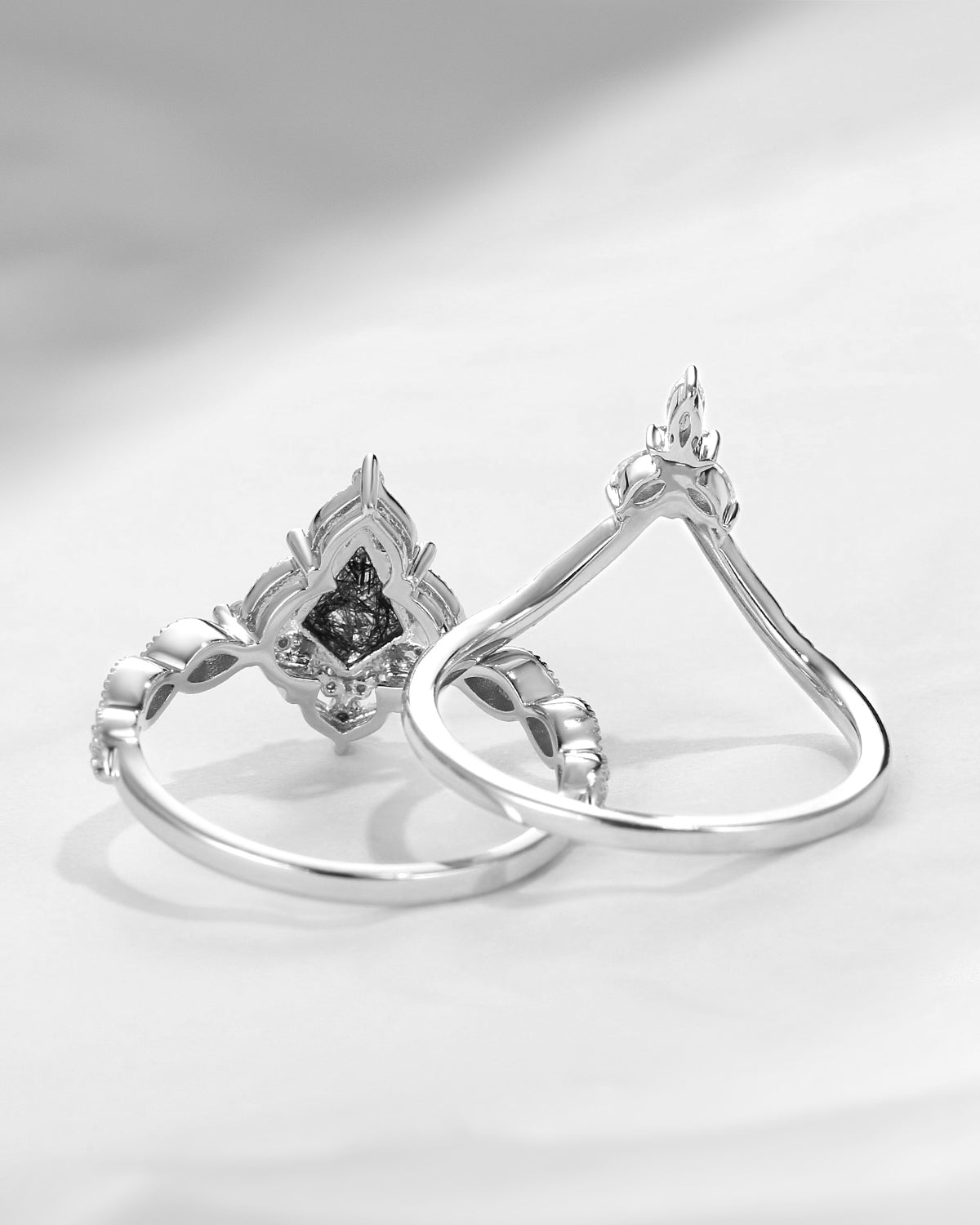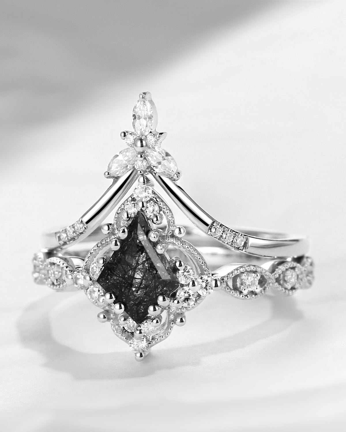 Kite Cut Black Rutilated Quartz Vintage Inspired Engagement Ring Set 2pcs