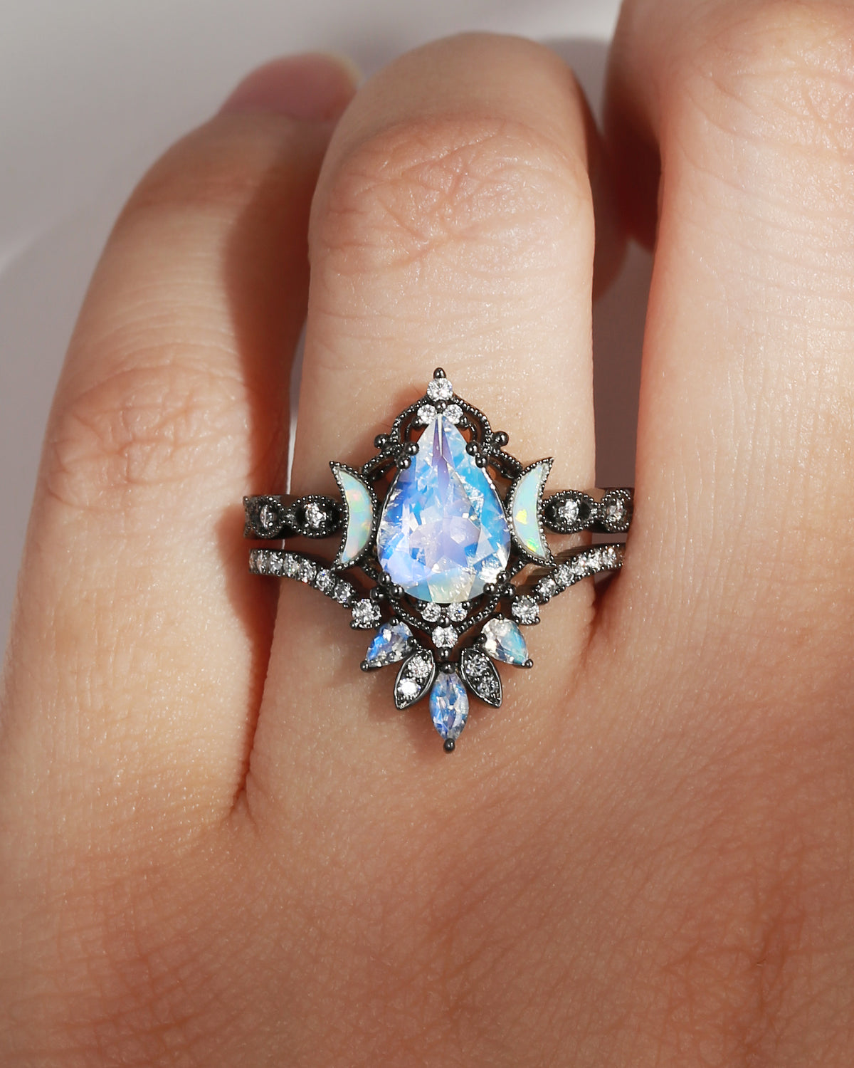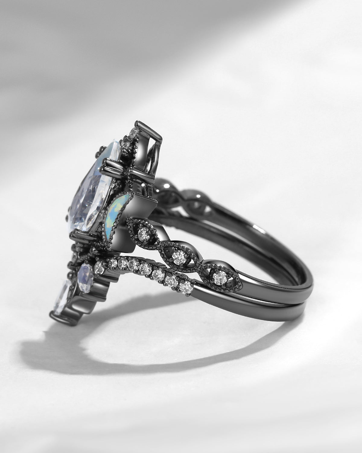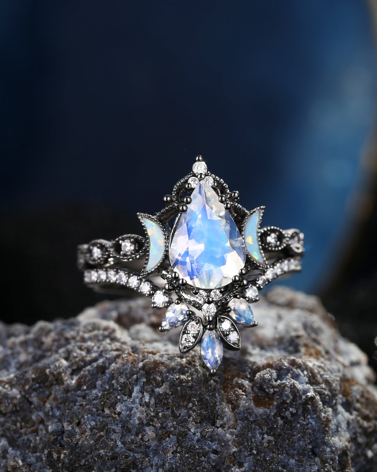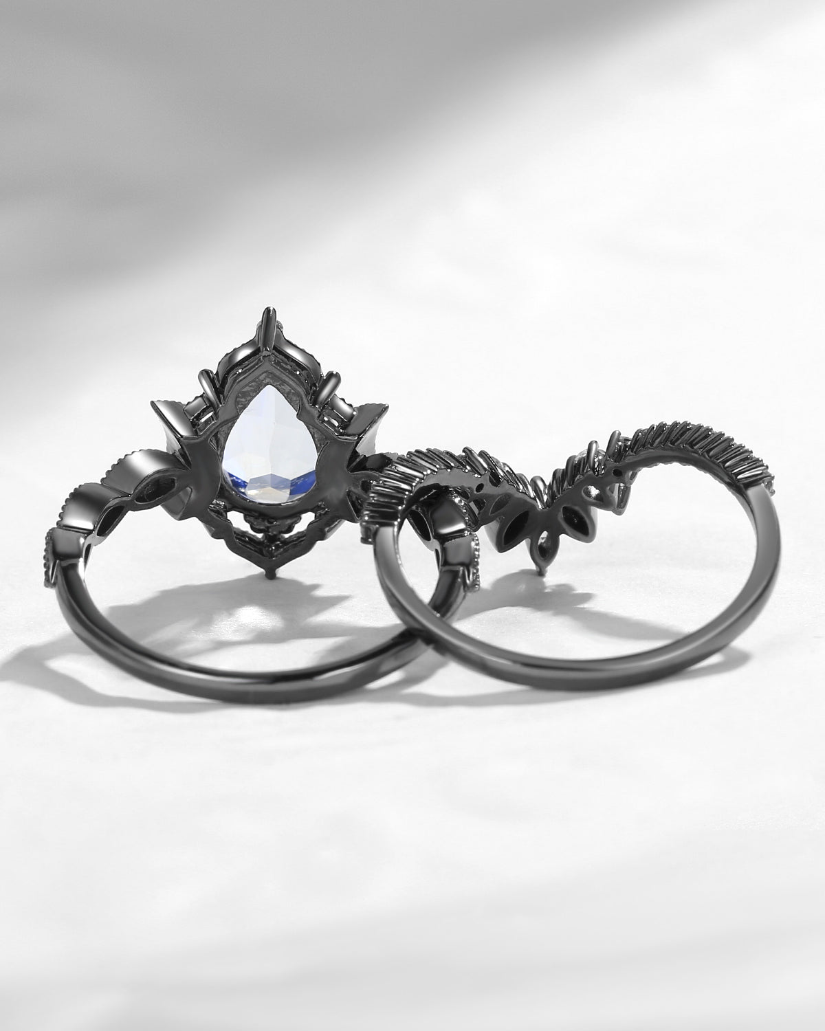 Crescent Moon | Pear Cut Moonstone 'Ultra Galaxy' Black Gold Engagement Ring Set 2pcs