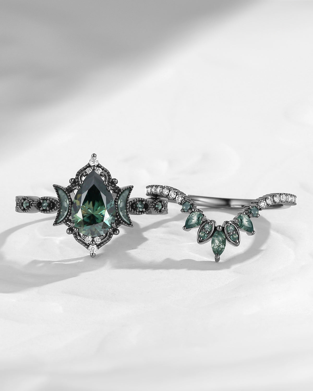 Crescent Moon | Pear Cut Garnet Galaxy Black Gold Engagement Ring Set 2PCS