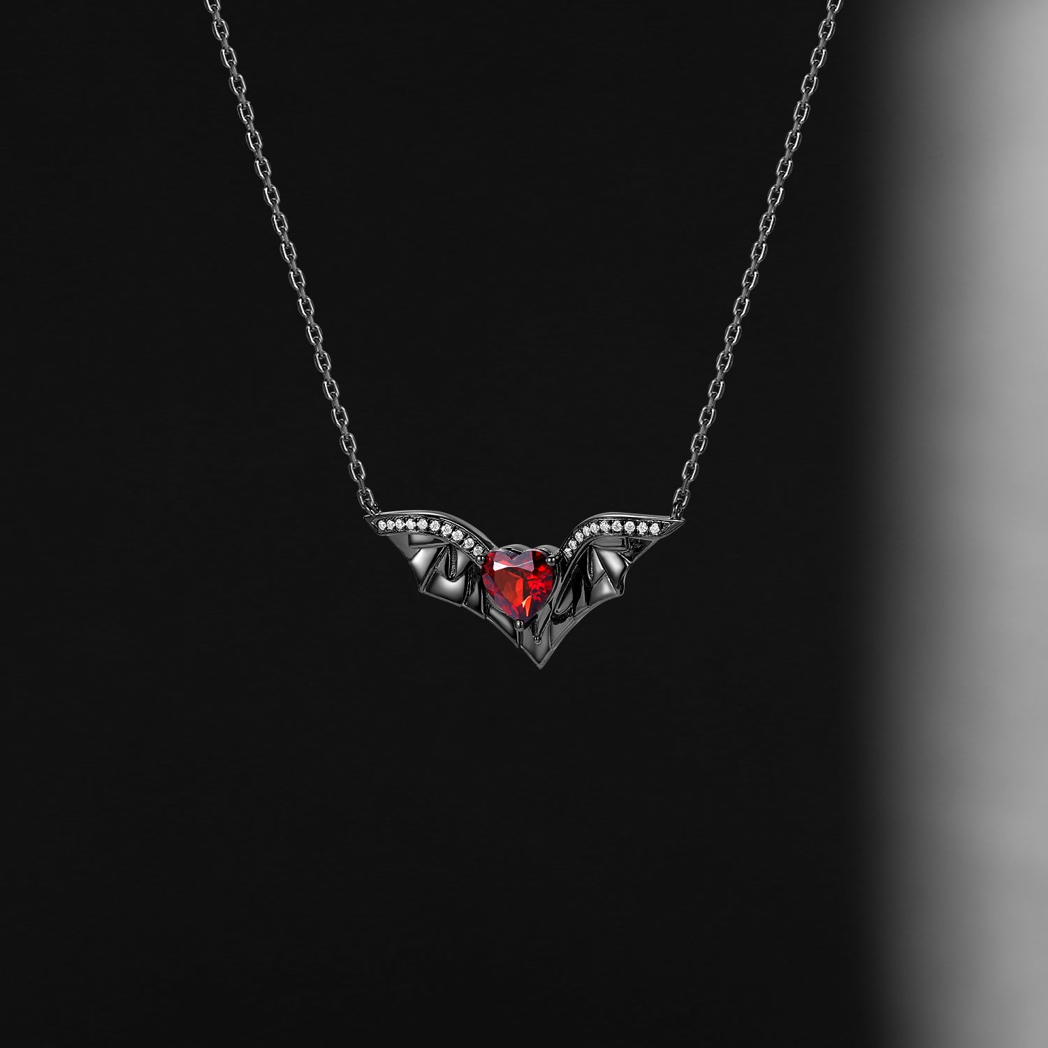 Bat Wing Garnet Heart Shaped Necklace Black Gold Halloween Jewelry