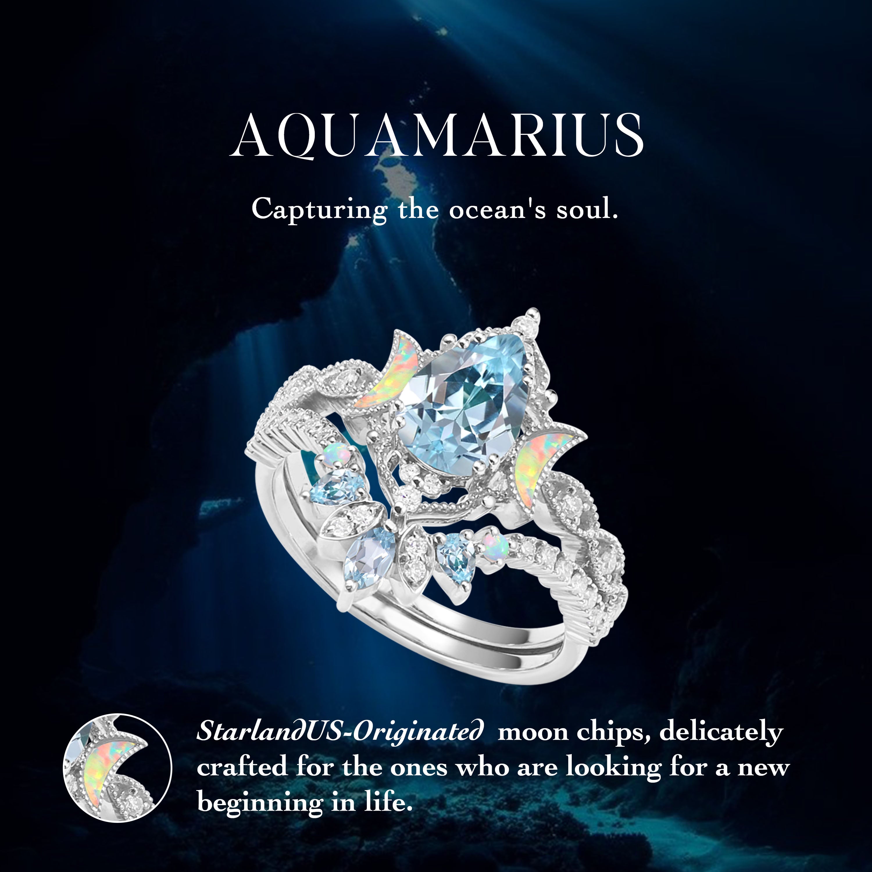 Pear Cut Natural Aquamarine Engagement Ring Infinity Ring Vintage Style Cluster Moon Wedding Ring Set 2pcs
