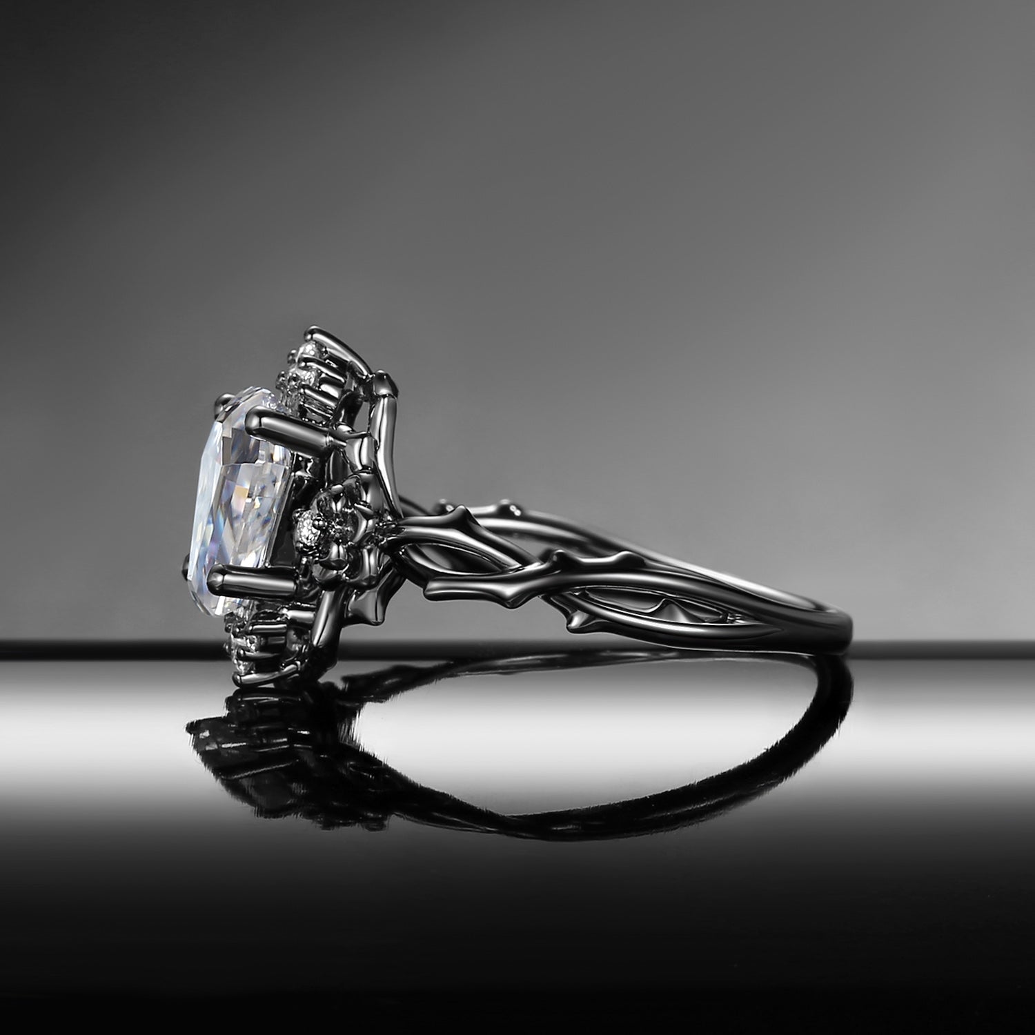 Garden Of Eden Nature Inspired ‘Thorns & Roses’ Gothic Coffin Cut Moissanite Black Gold Engagement Ring