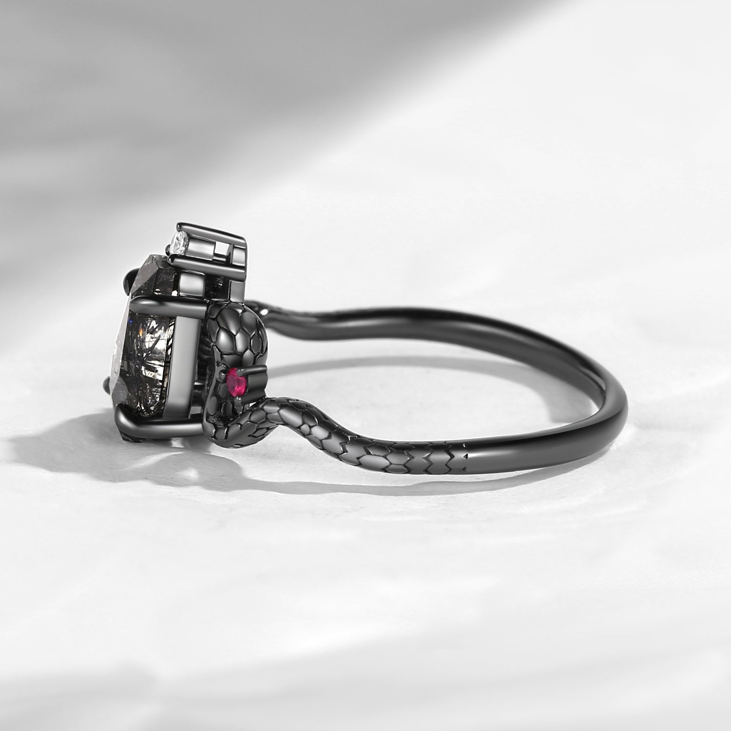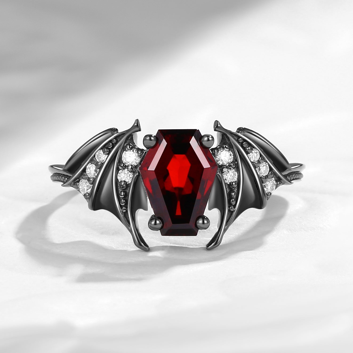 Coffin Cut Garnet Gothic Inspired Black Gold Engagement Ring - Bat Ring