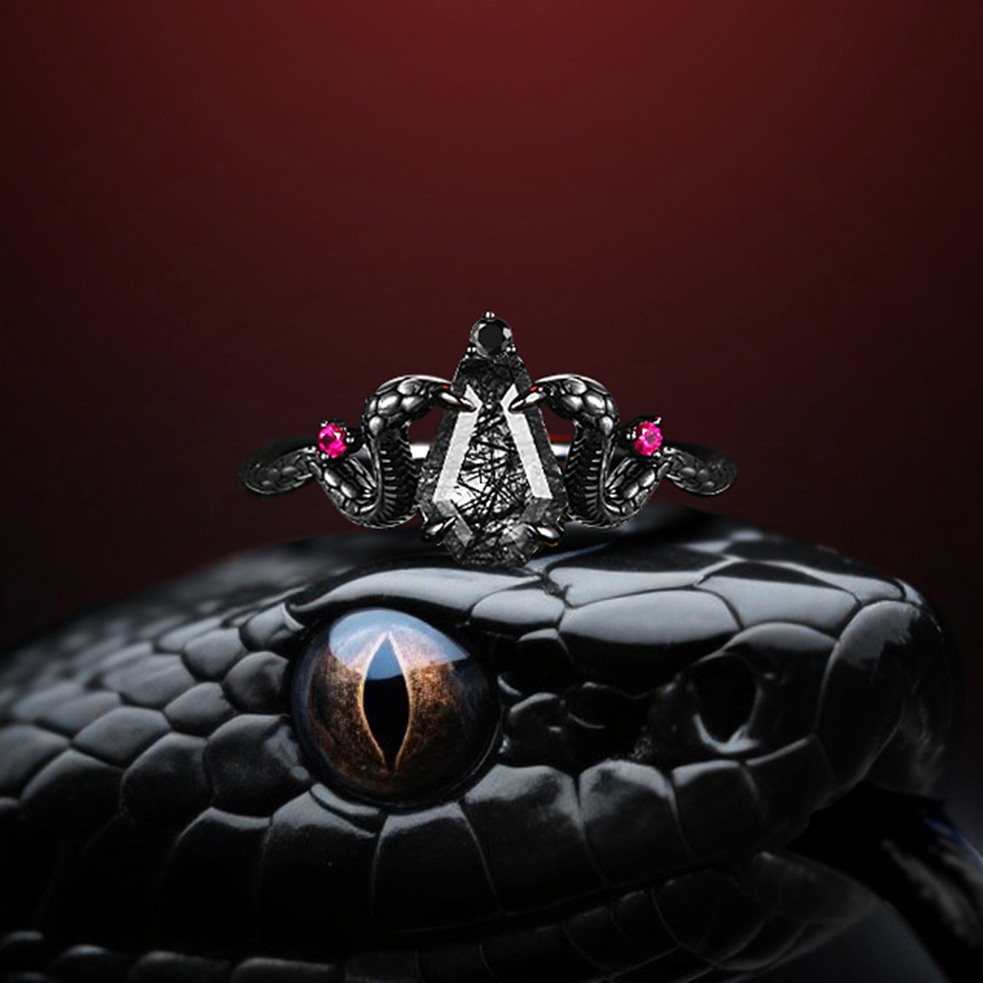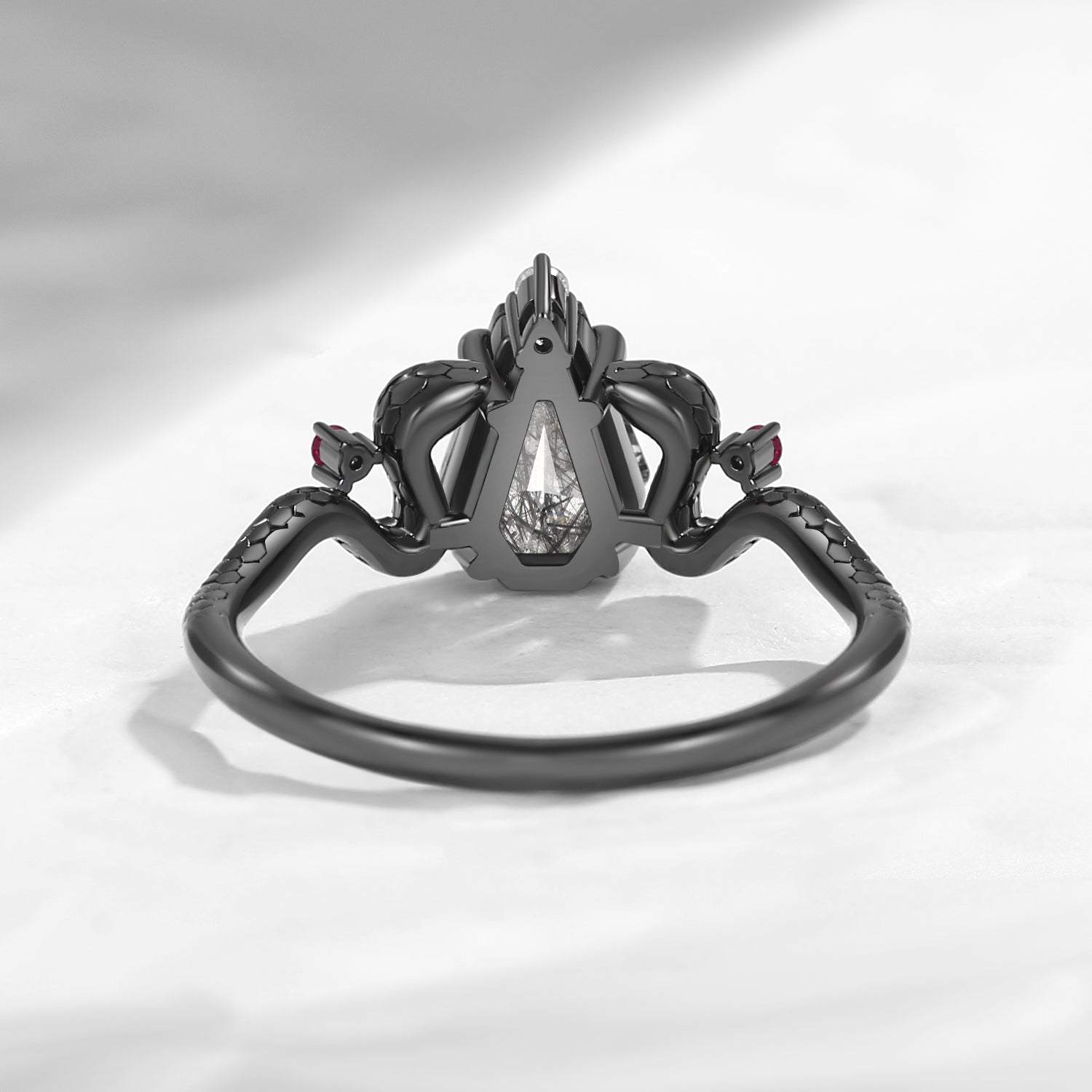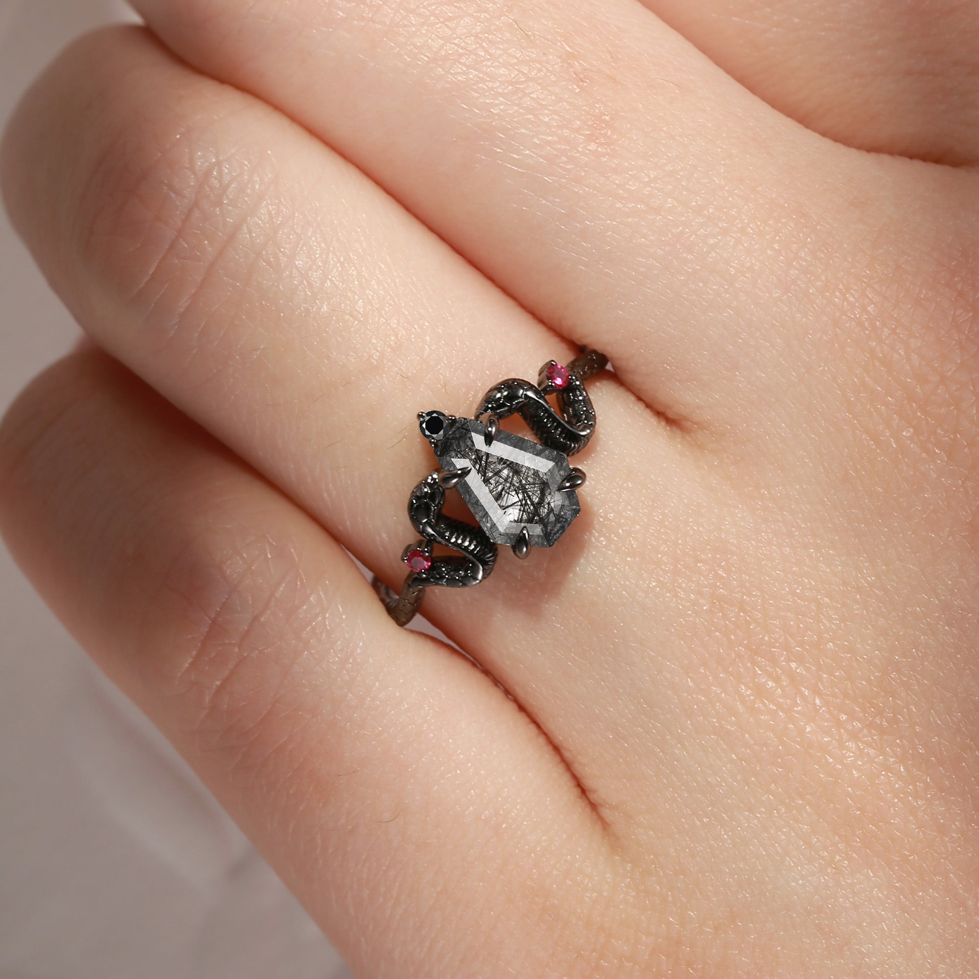 Gothic Inspired Hexagon Cut Black Rutilated Quartz 'Fallen Aegis' Shield Engagement Ring Set 3pcs