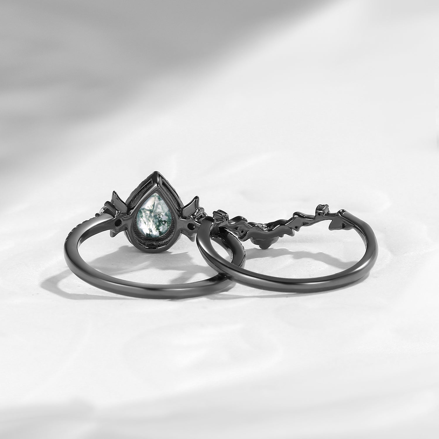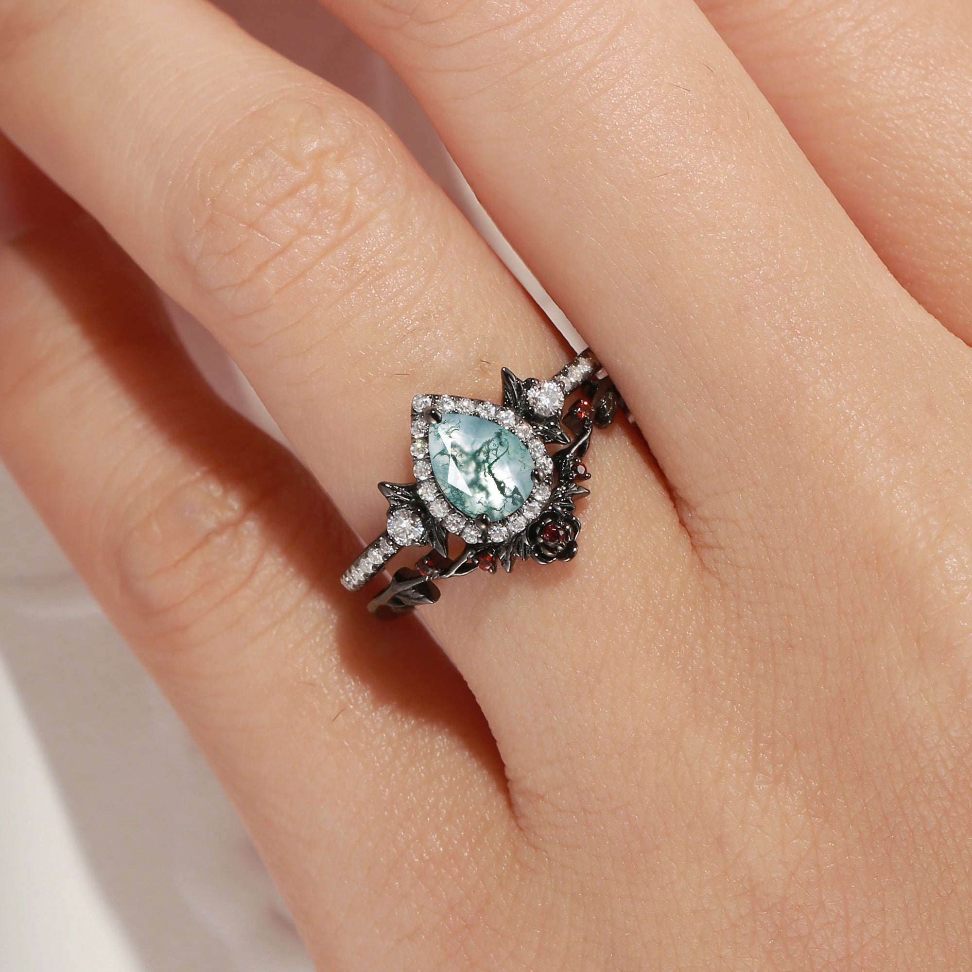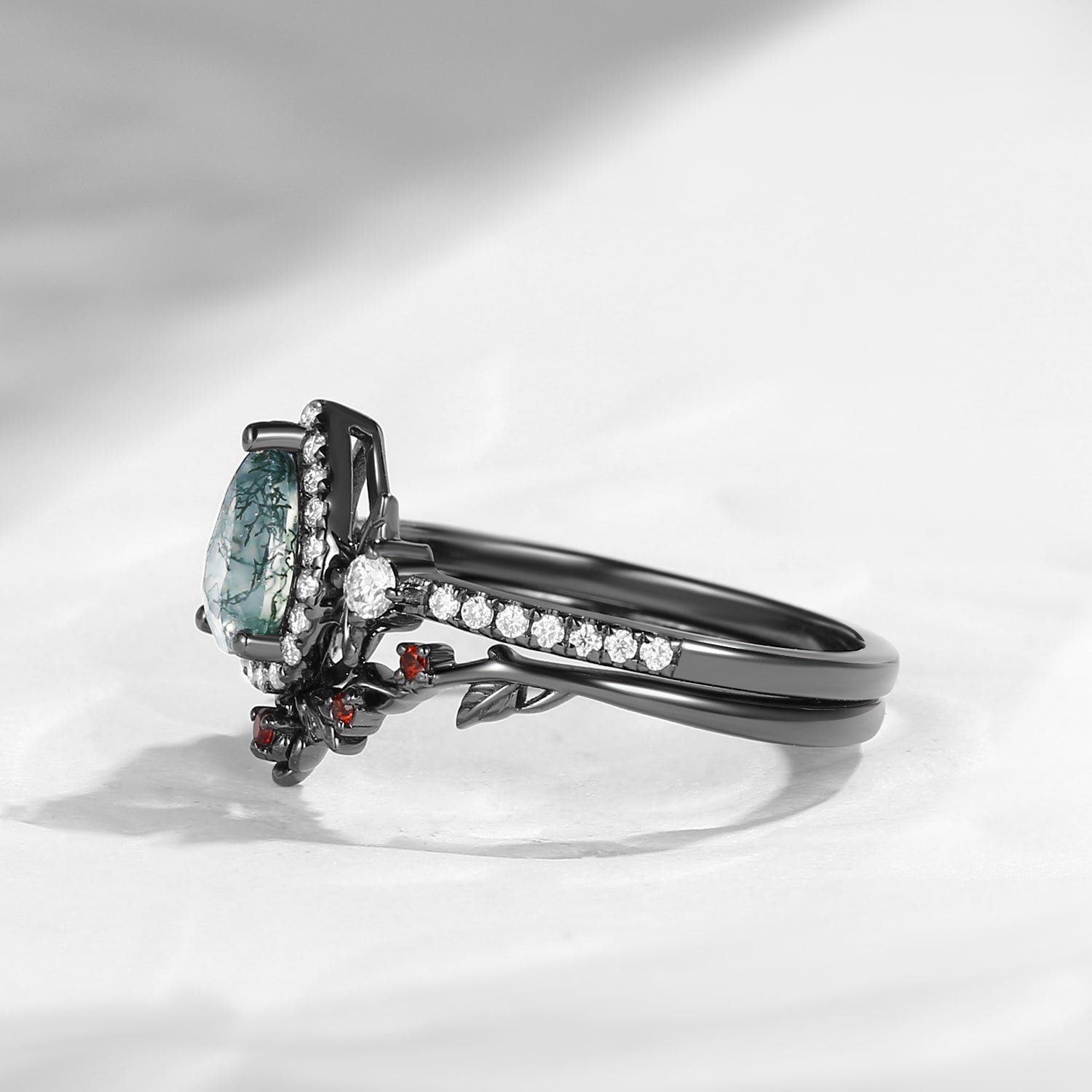 Nature Inspired Pear Cut Moss Agate Halo Engagement Ring Set 3pcs
