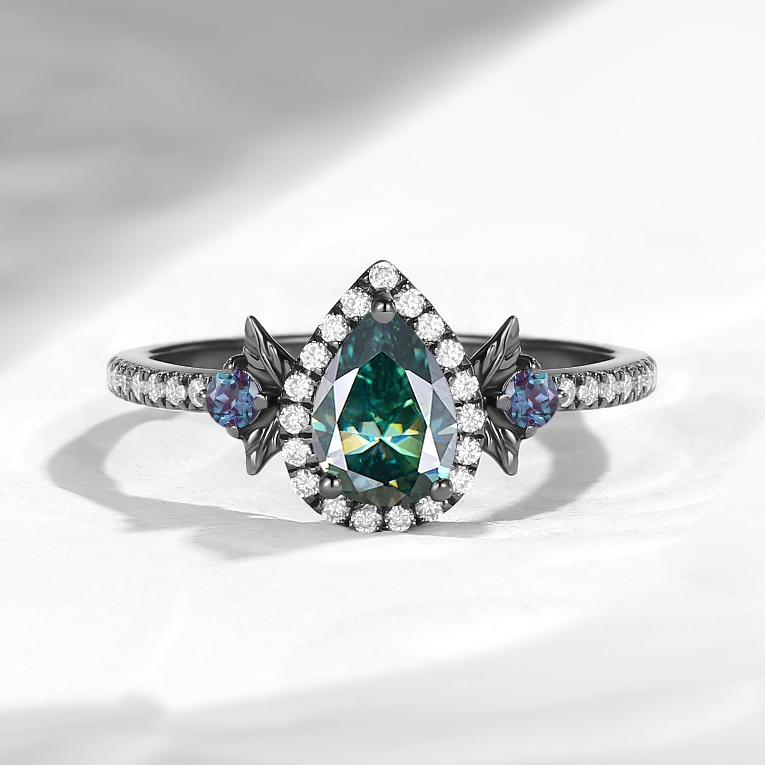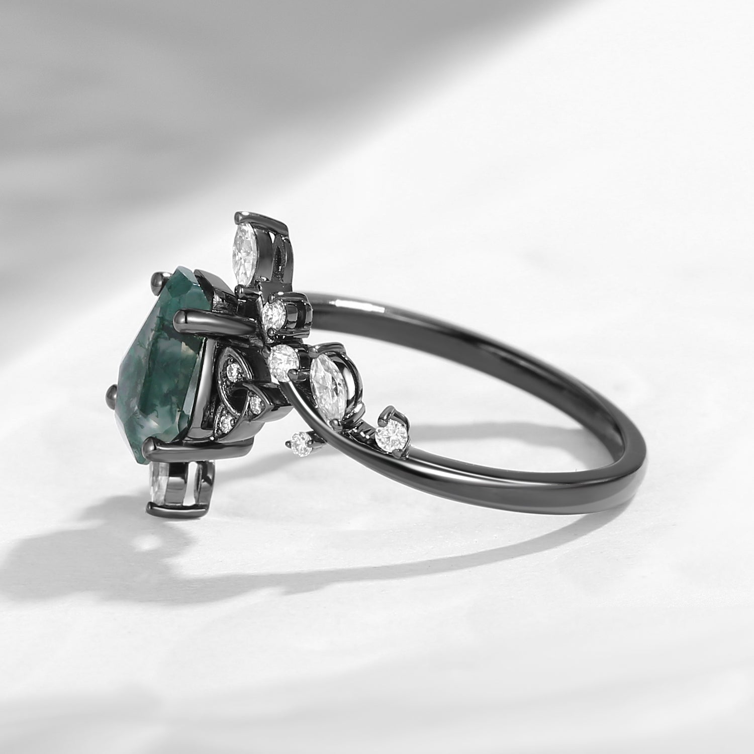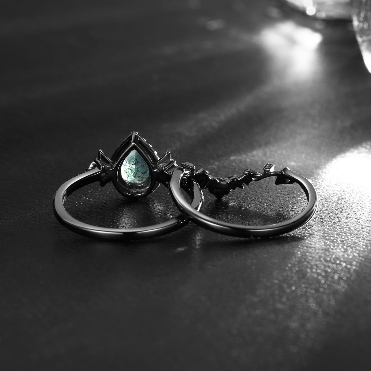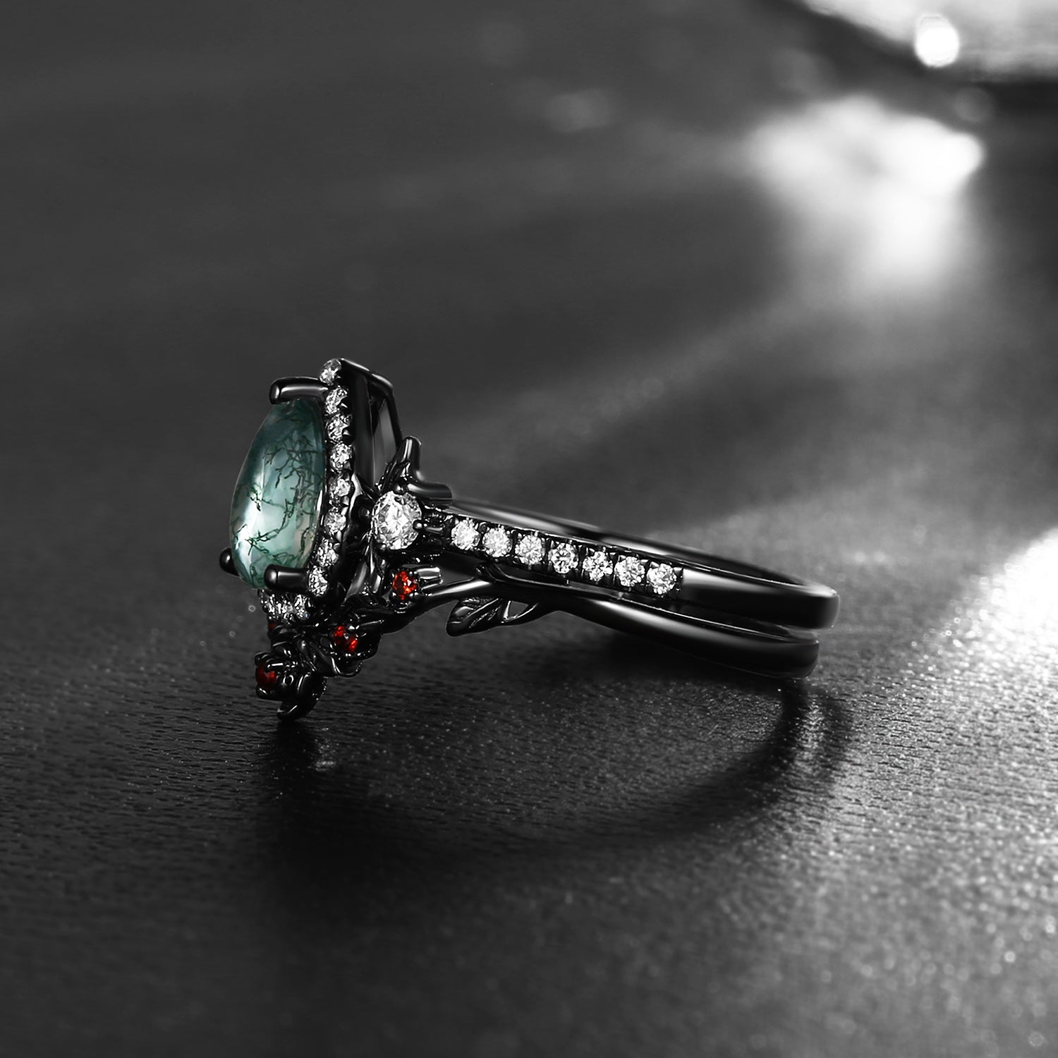 Nature Inspired Pear Cut Moss Agate Halo Engagement Ring Set 3pcs